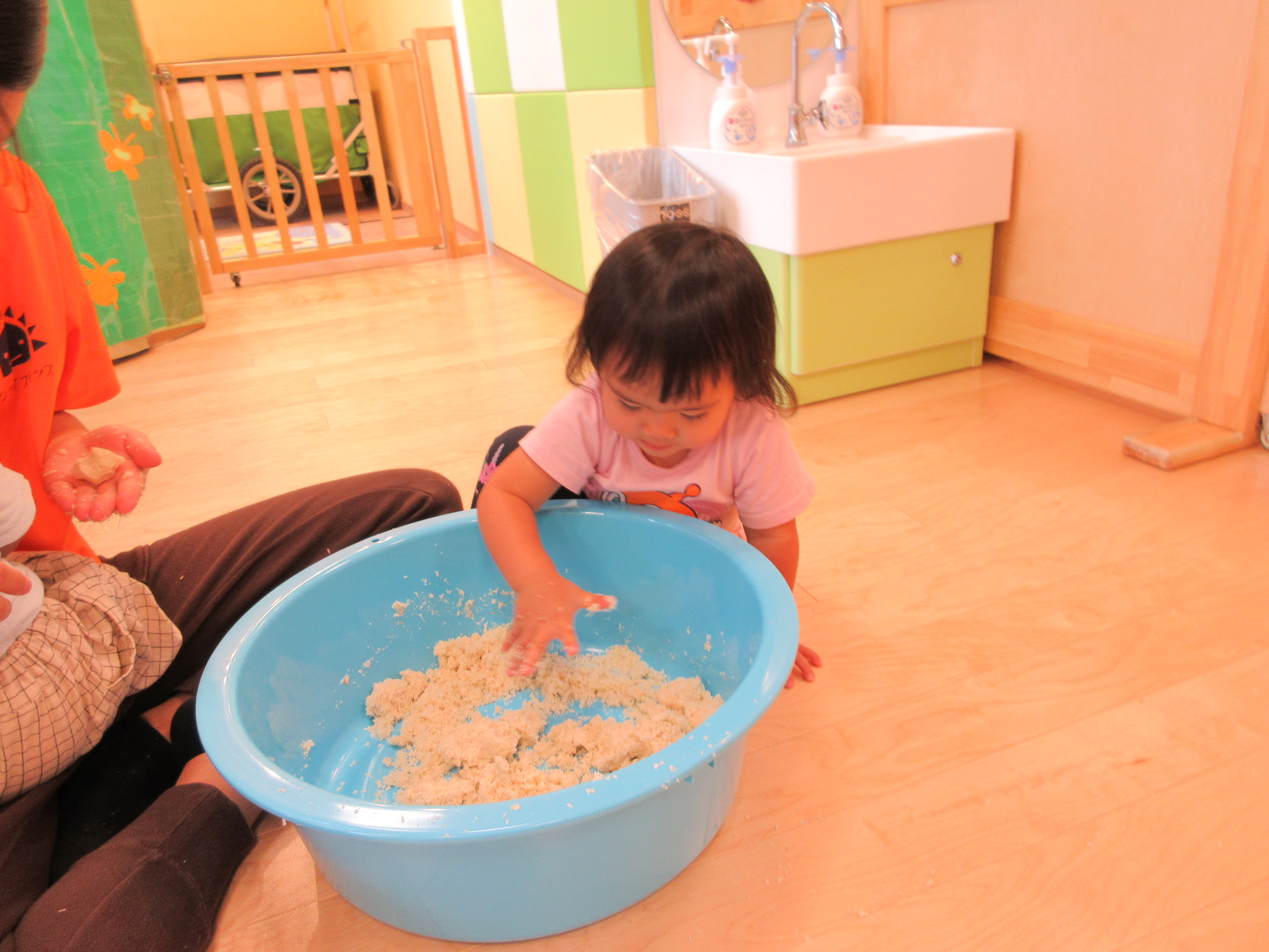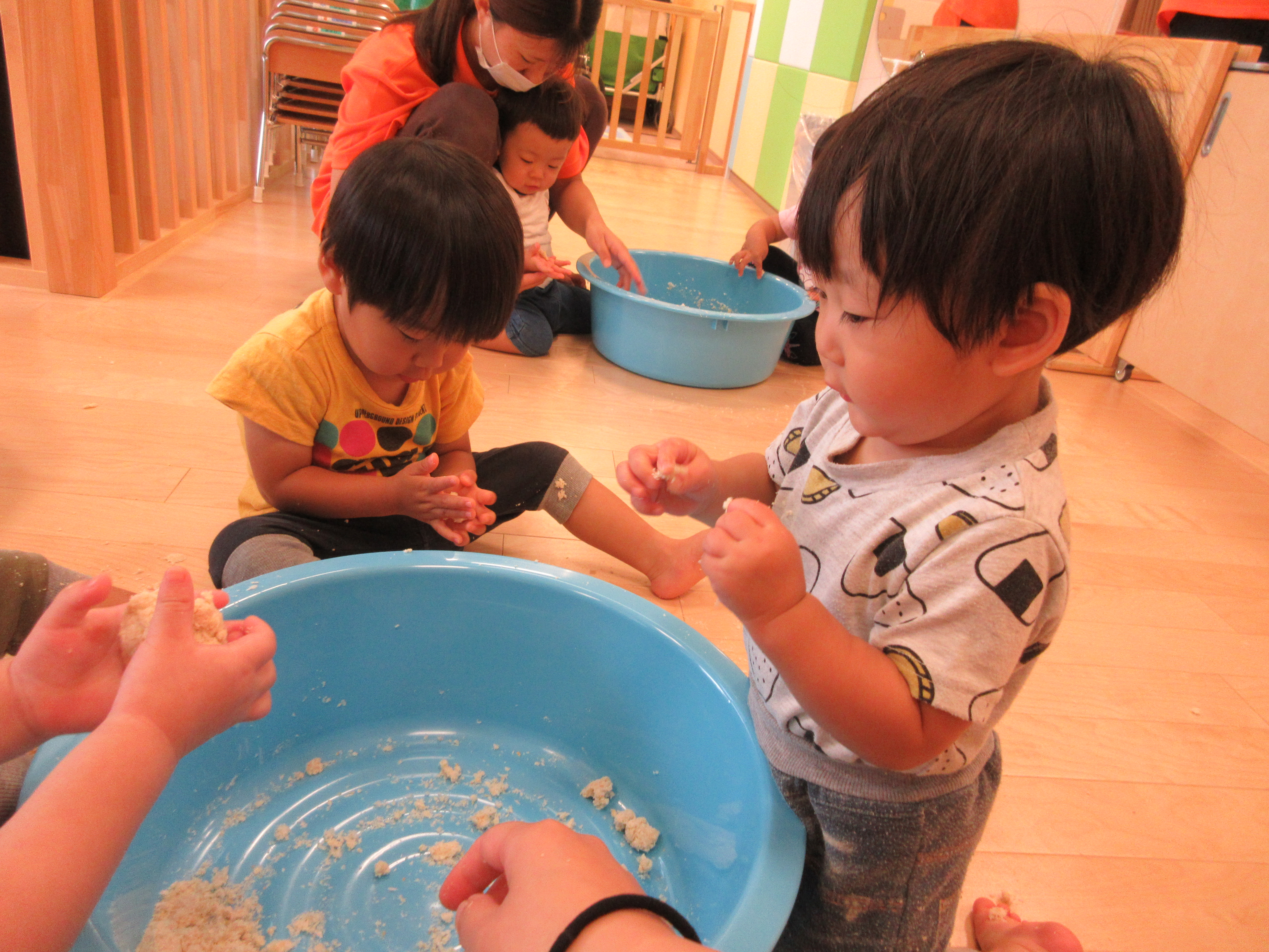 始めはパン粉のざらざらしている感触をみんなで楽しみました![]()