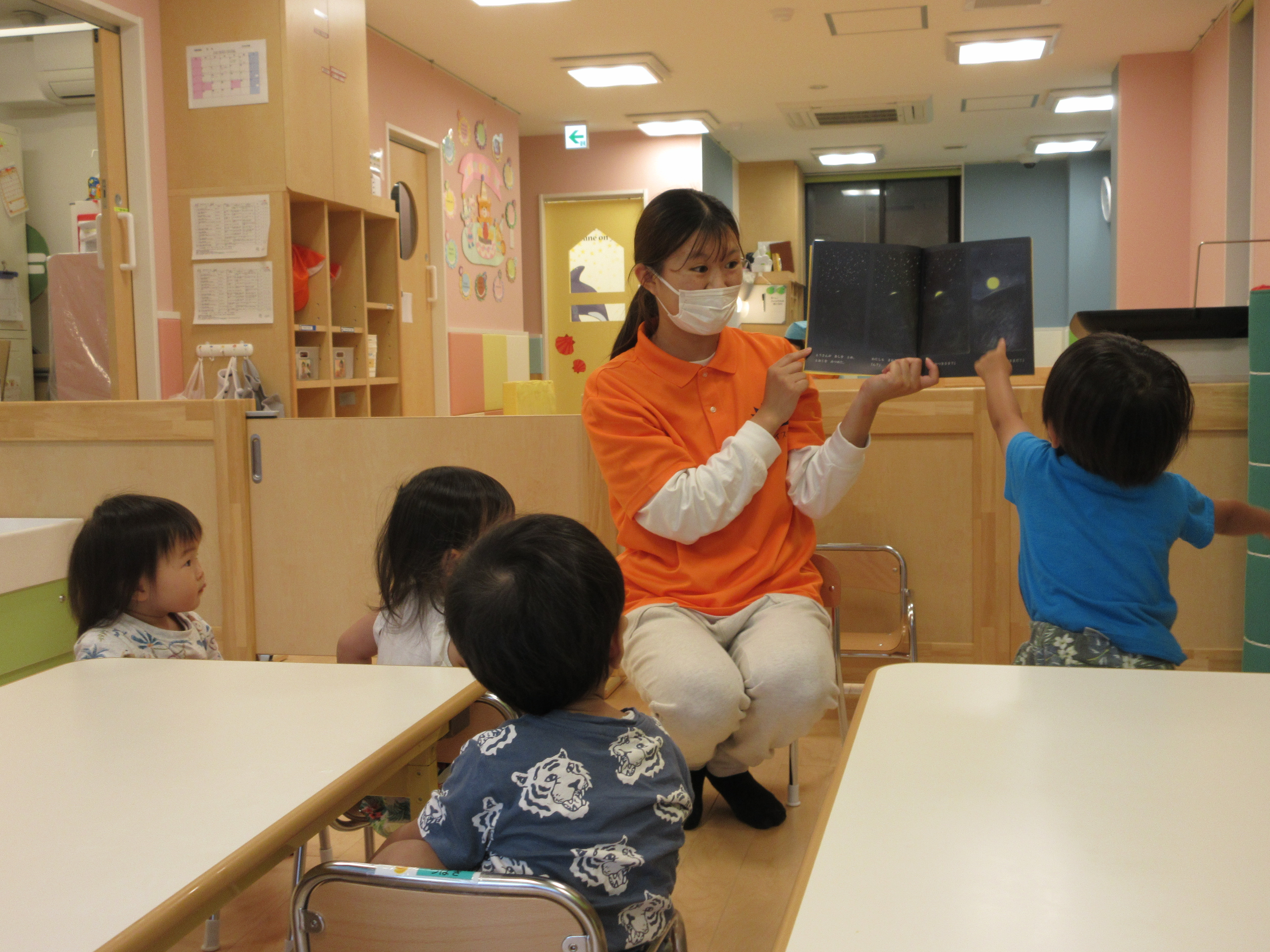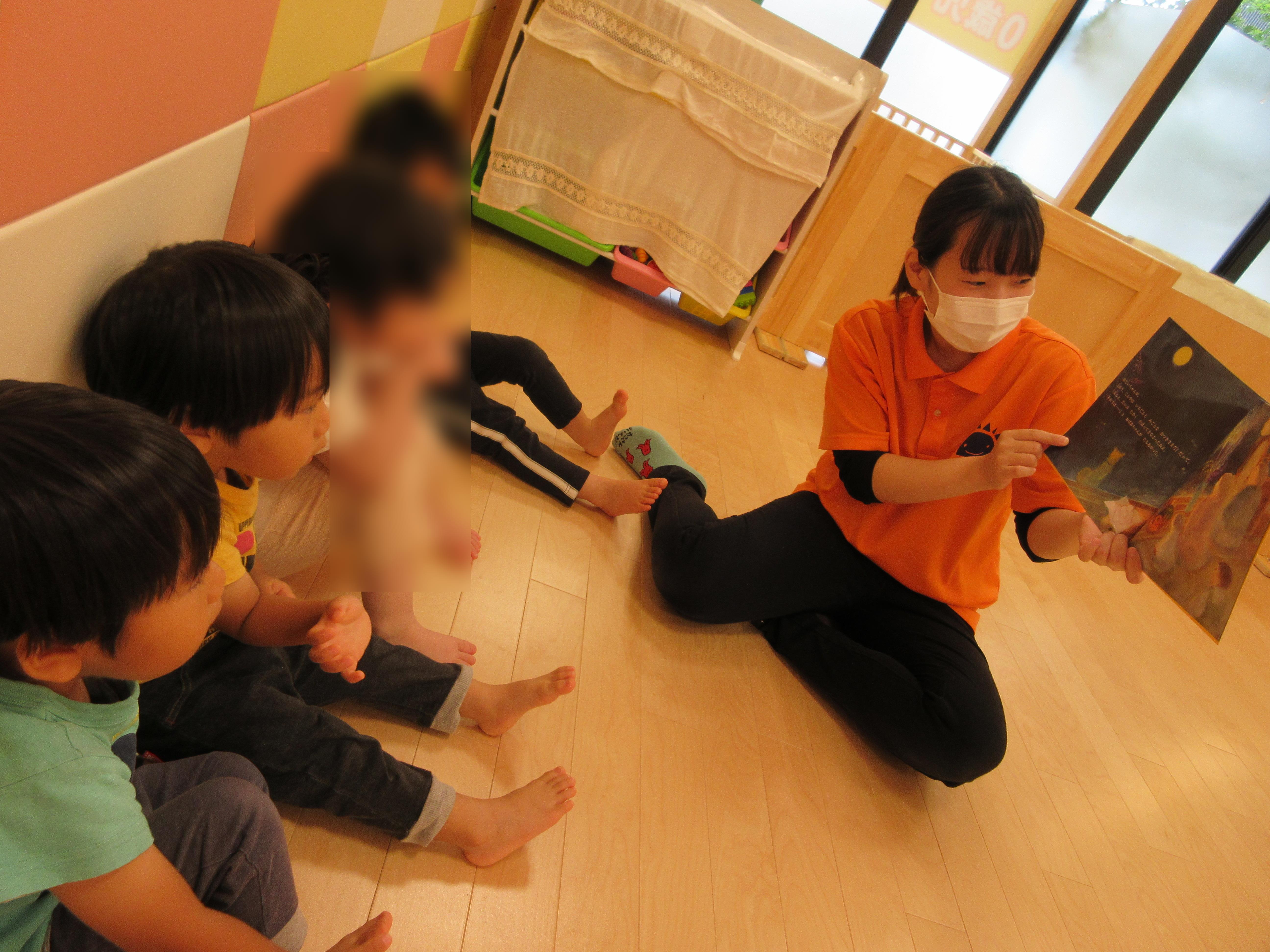 子どもたちにとっては少し難しい内容の行事となりますが、絵本を通して少しでも興味を持ってもらえたらなという想いで、9月に入ってからおつきみの絵本を多く読み聞かせを行っています。