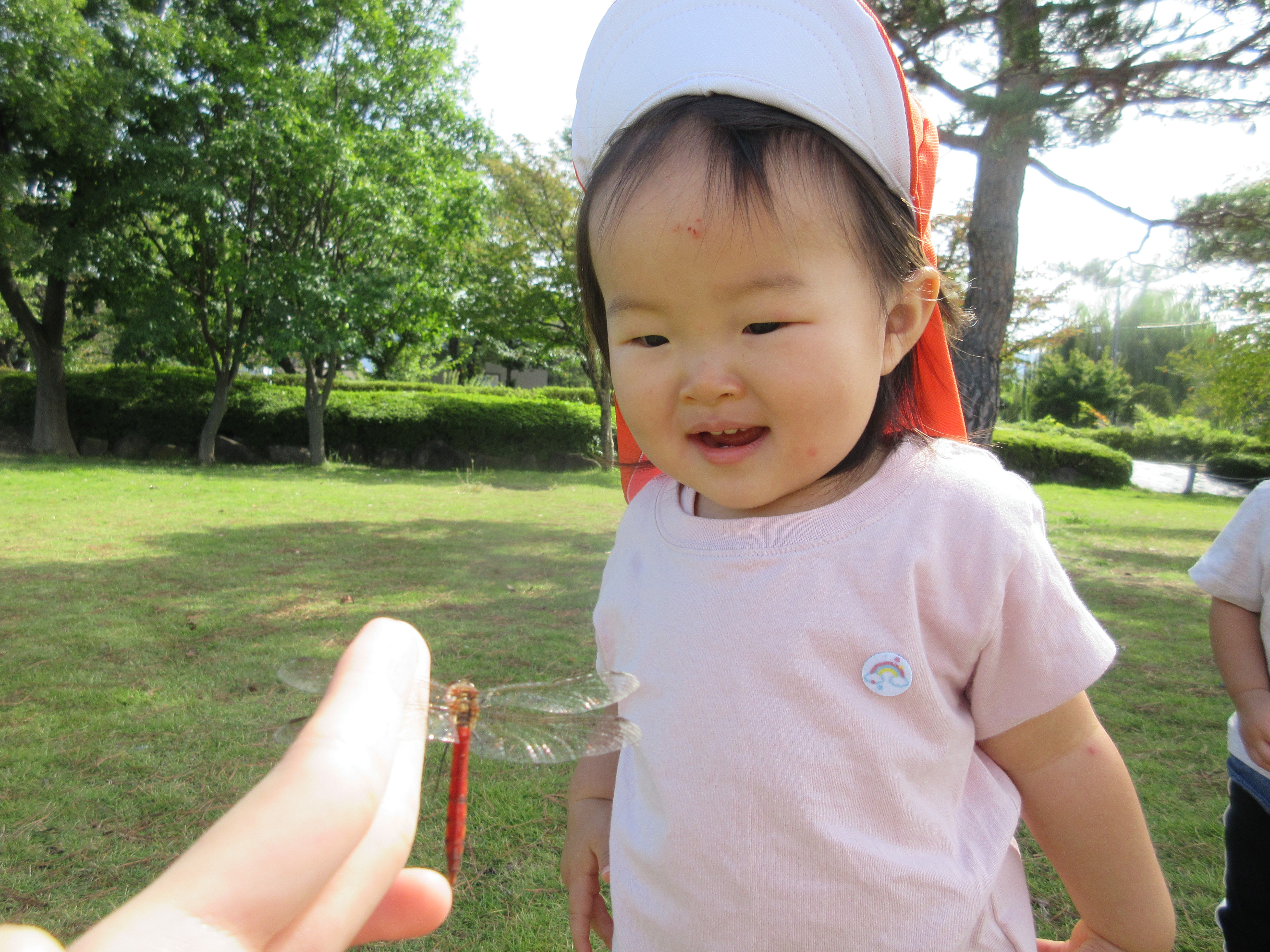 ⇧先生が捕まえたトンボさんを見て嬉しそうに笑っていますね~