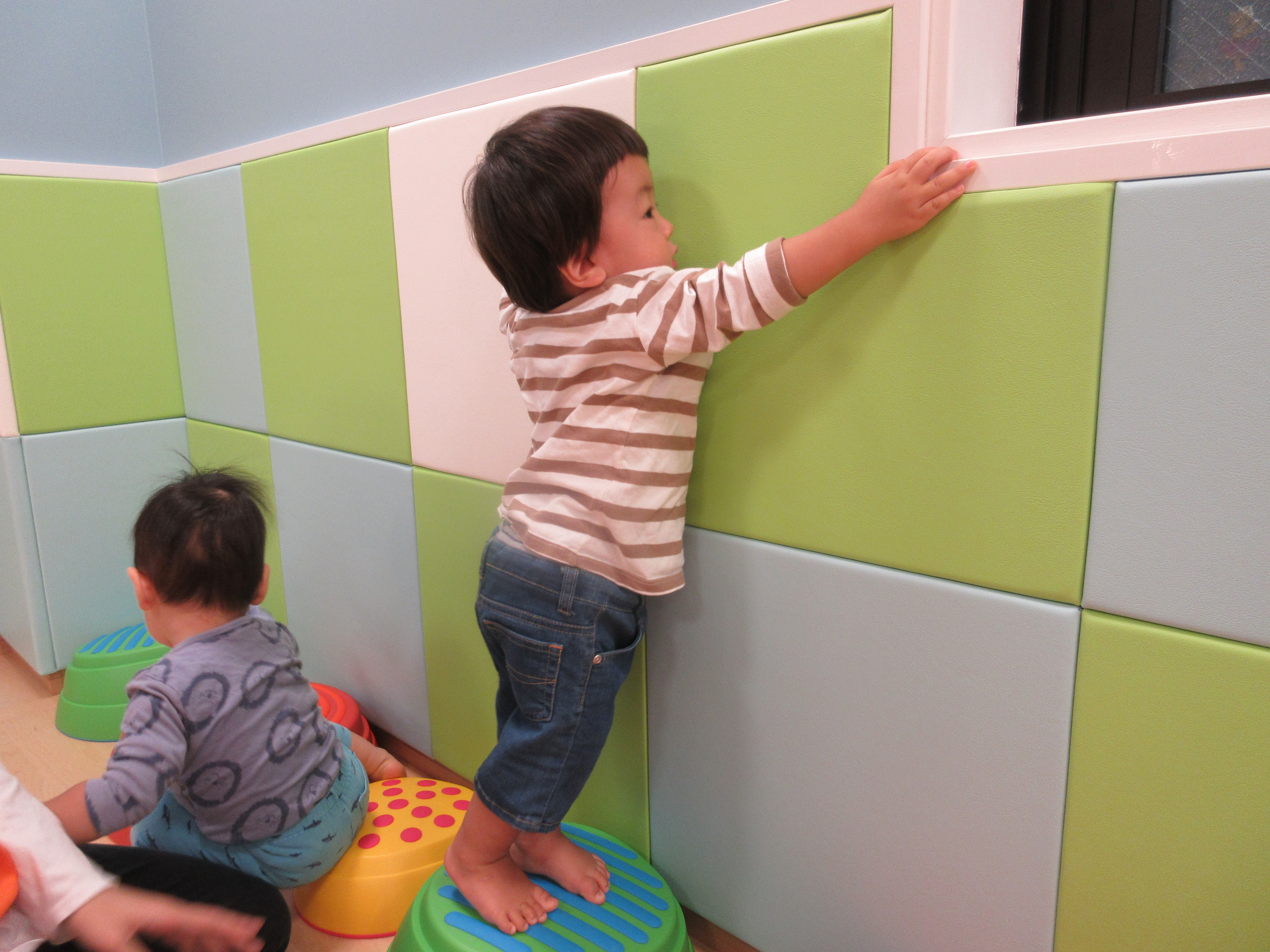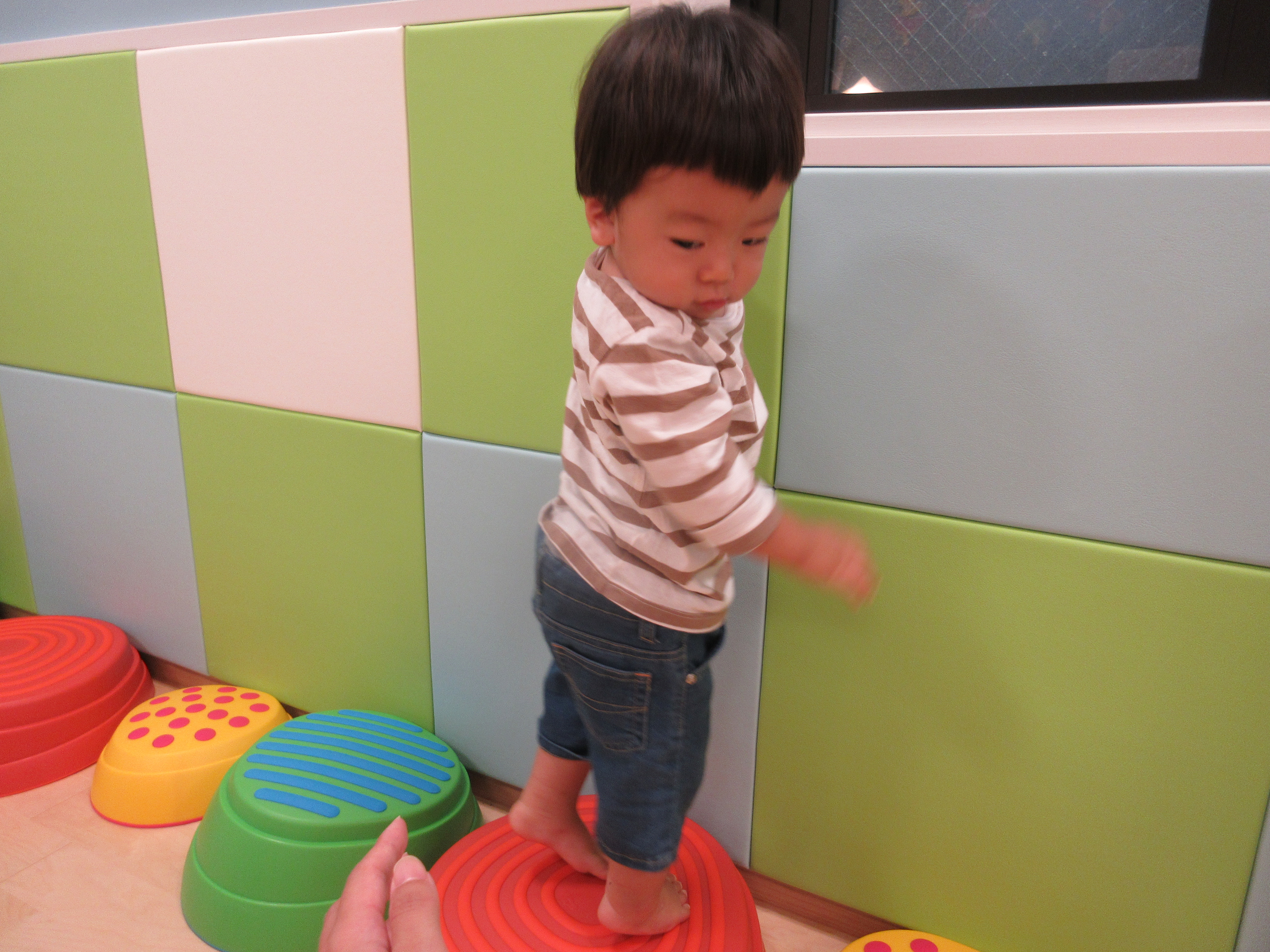 以前はなかなか飛び石の上に乗ることができなかった子も壁を伝い、上手に歩くことができるようになりました
