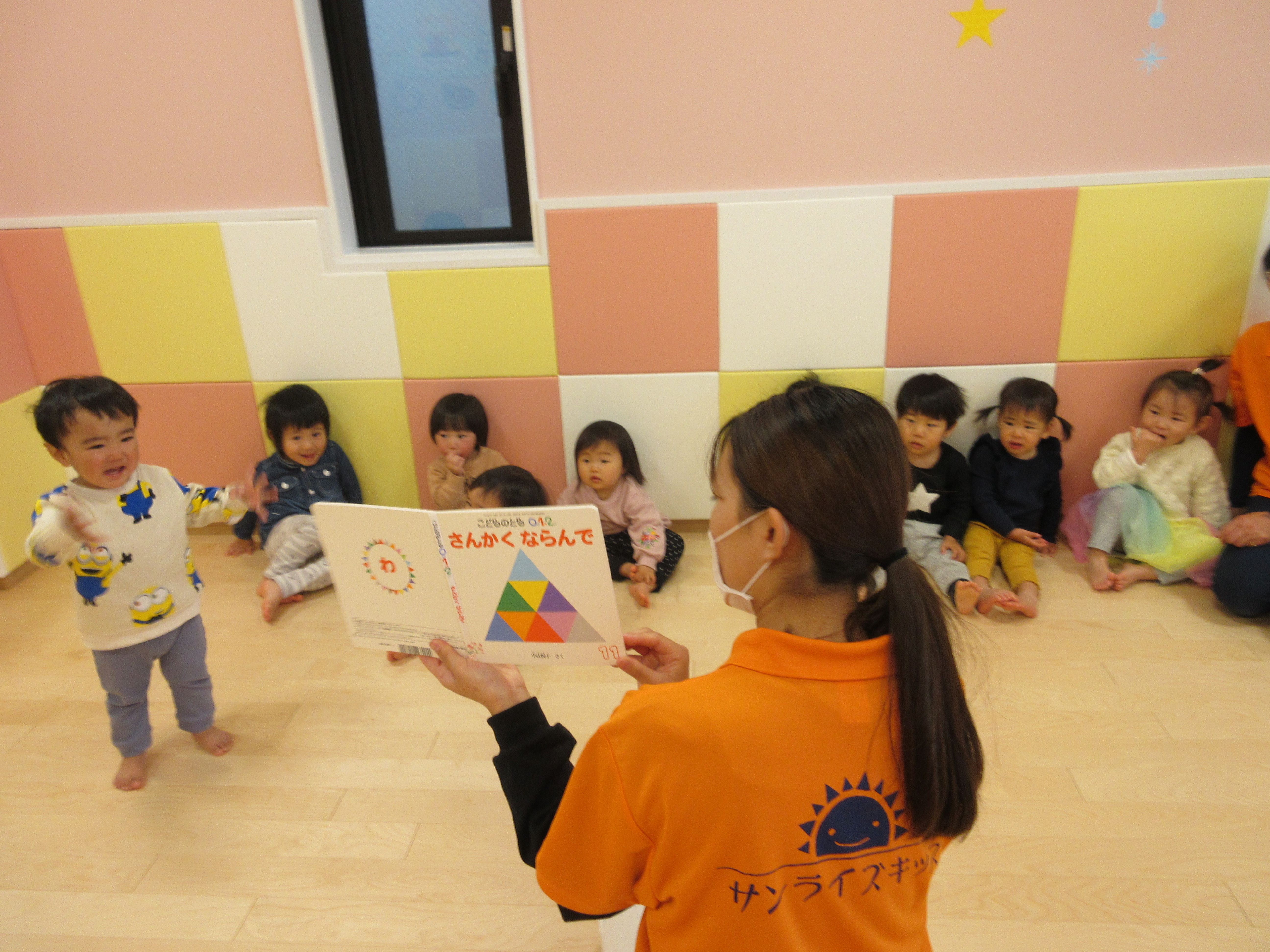 いろいろな色の△が出てくると「これー!」と好きな色の△を指さす子どもたち。