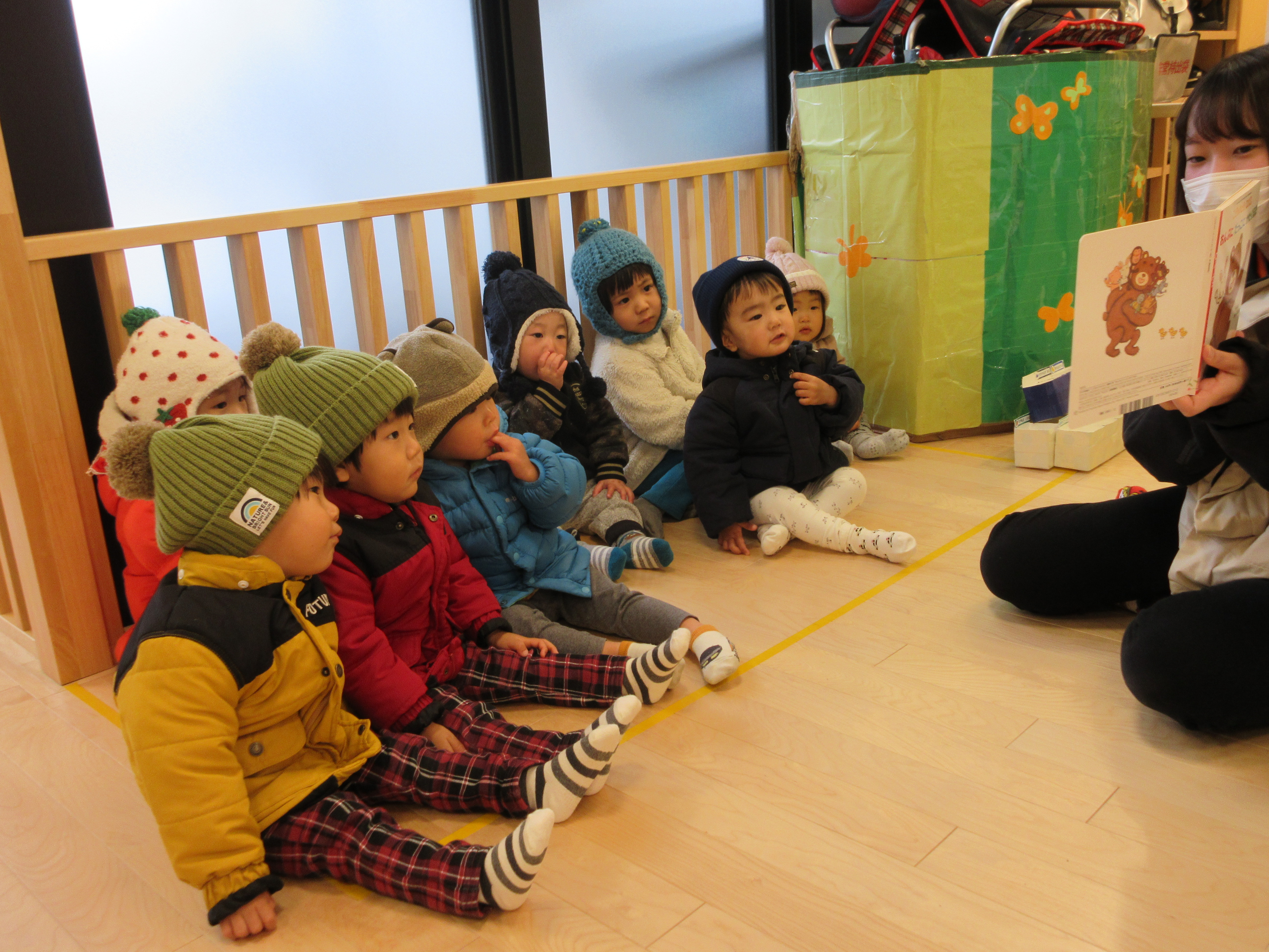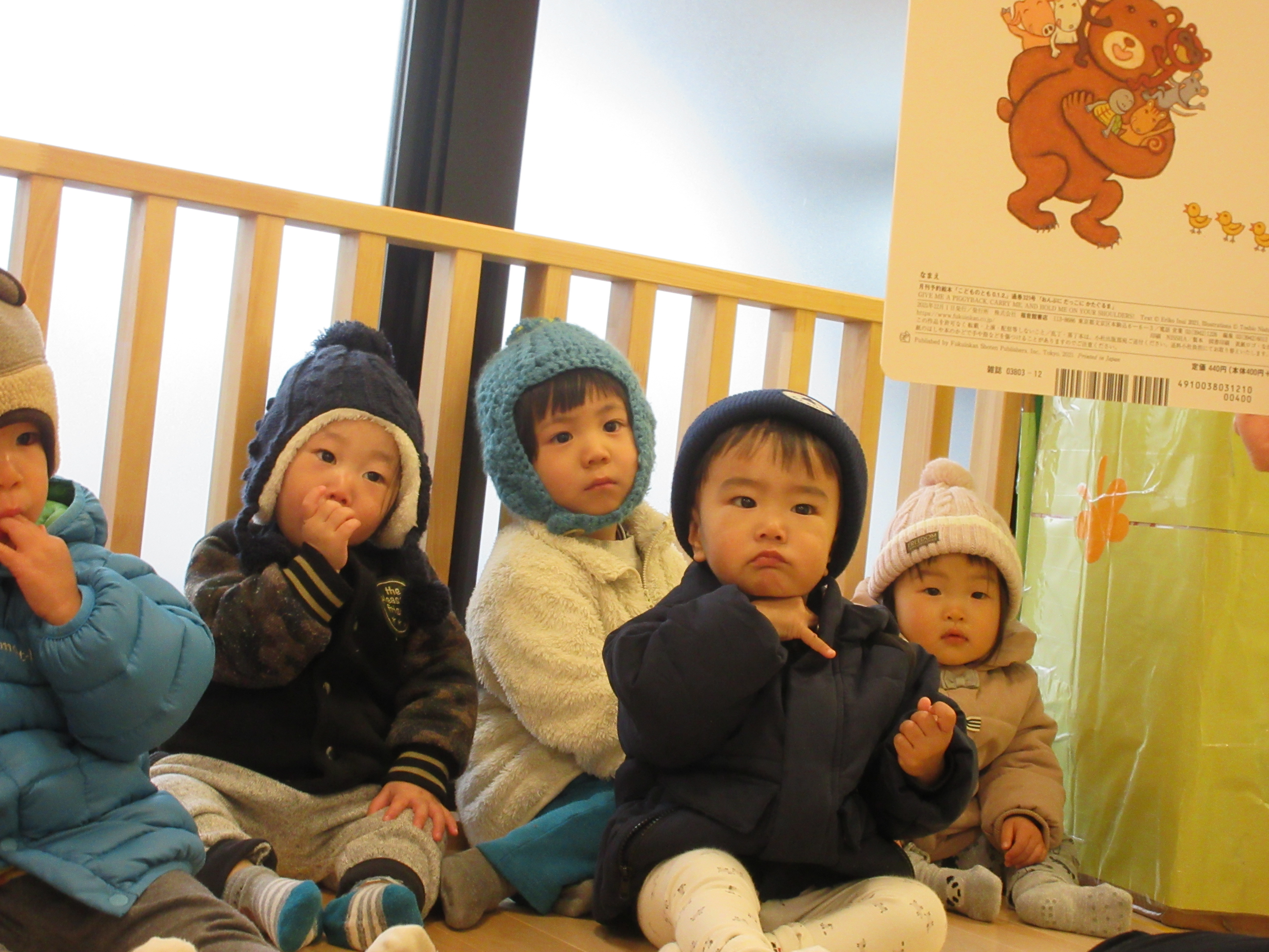 動物が出てくるたびに「うさぎ~」「うっきっき(さる)」「かめ~」と言う子どもたち![]()