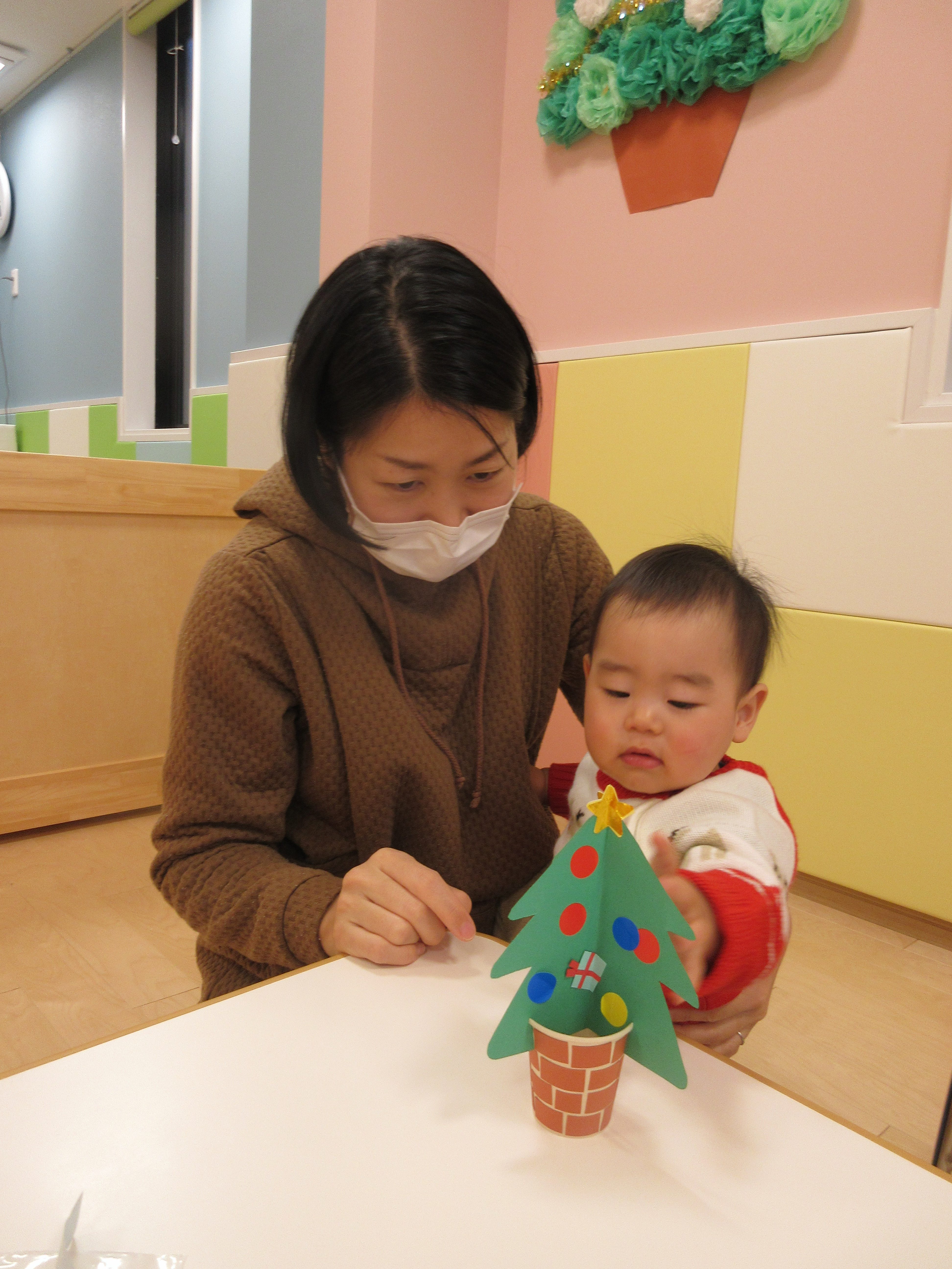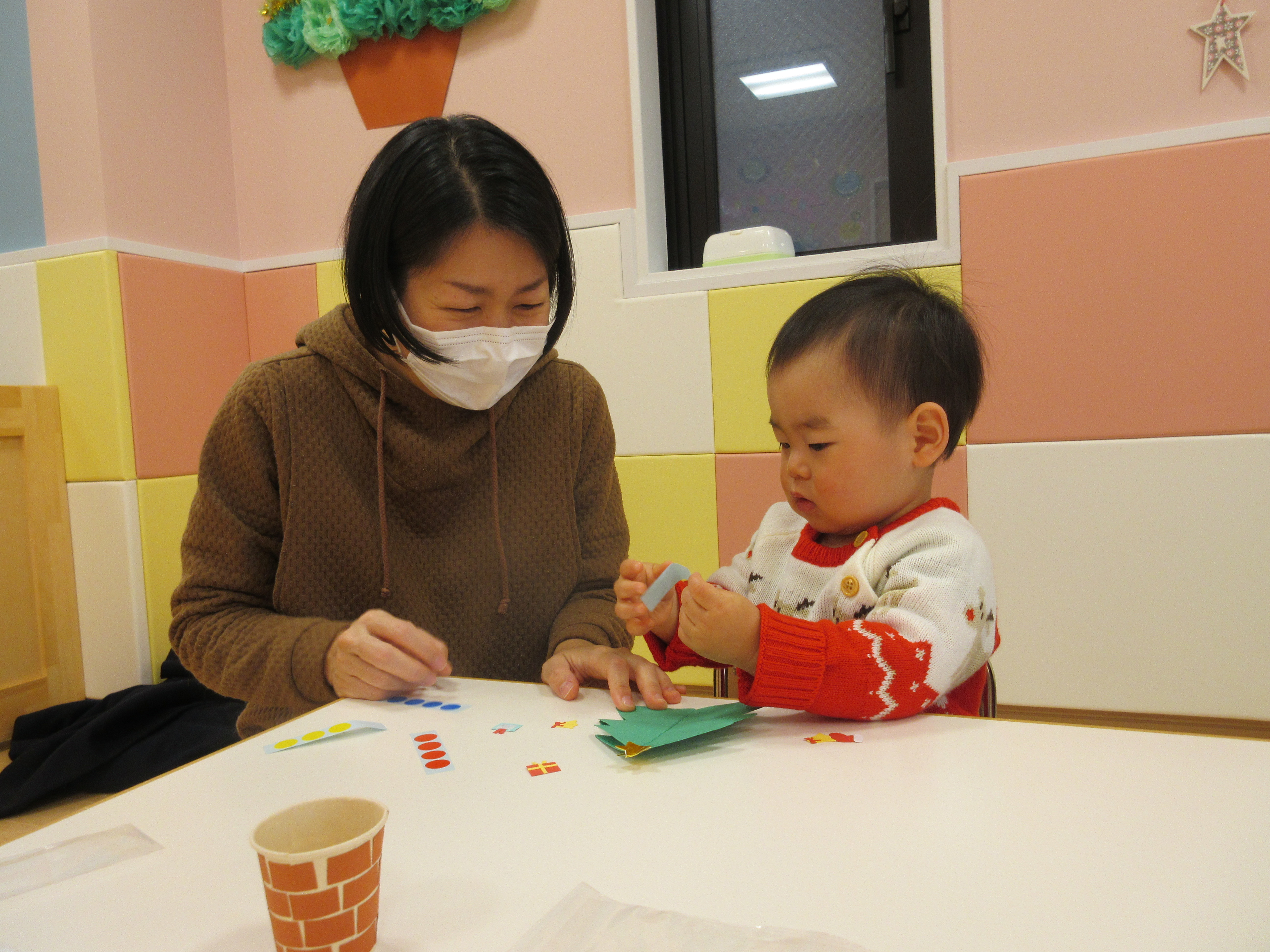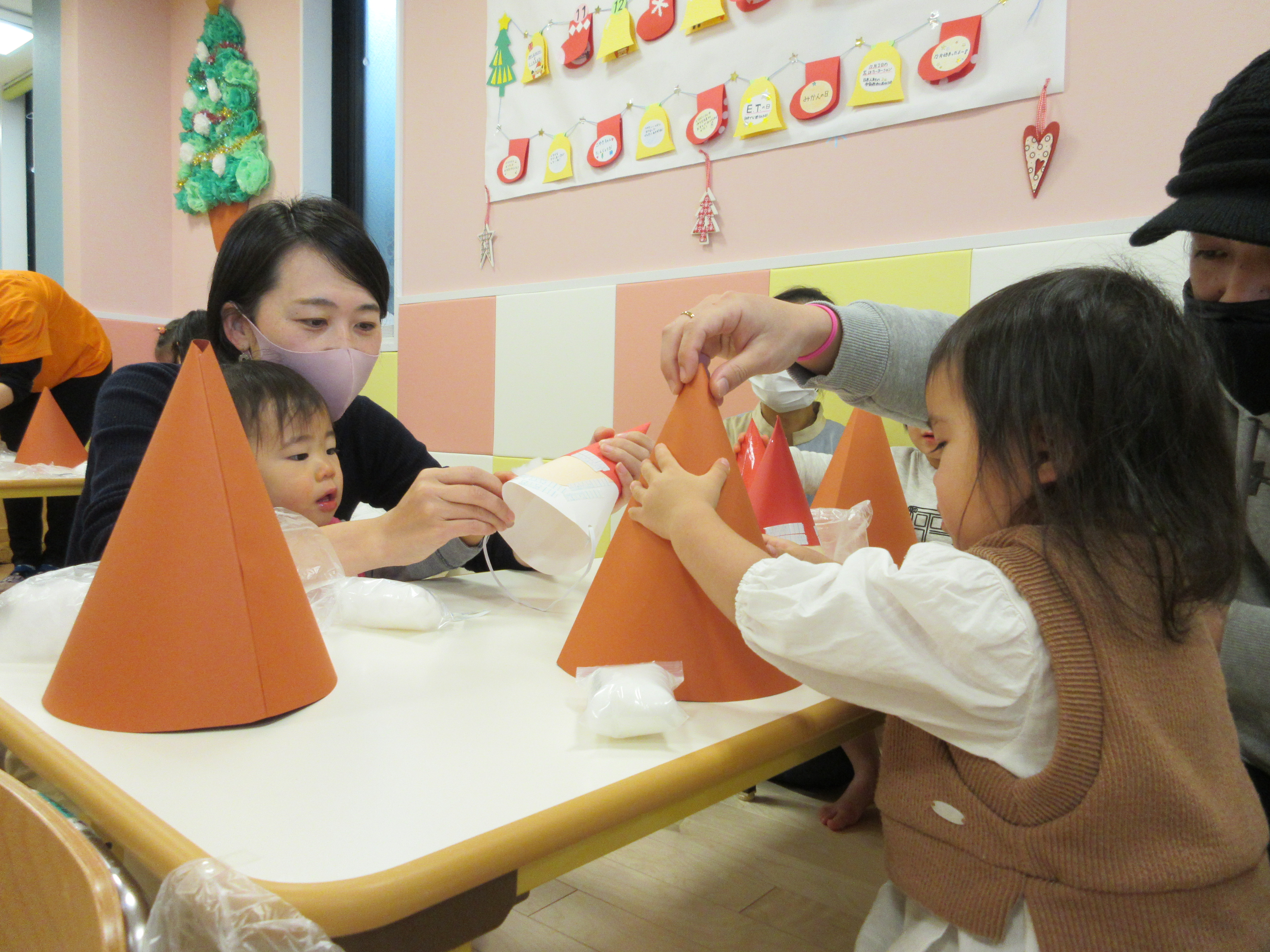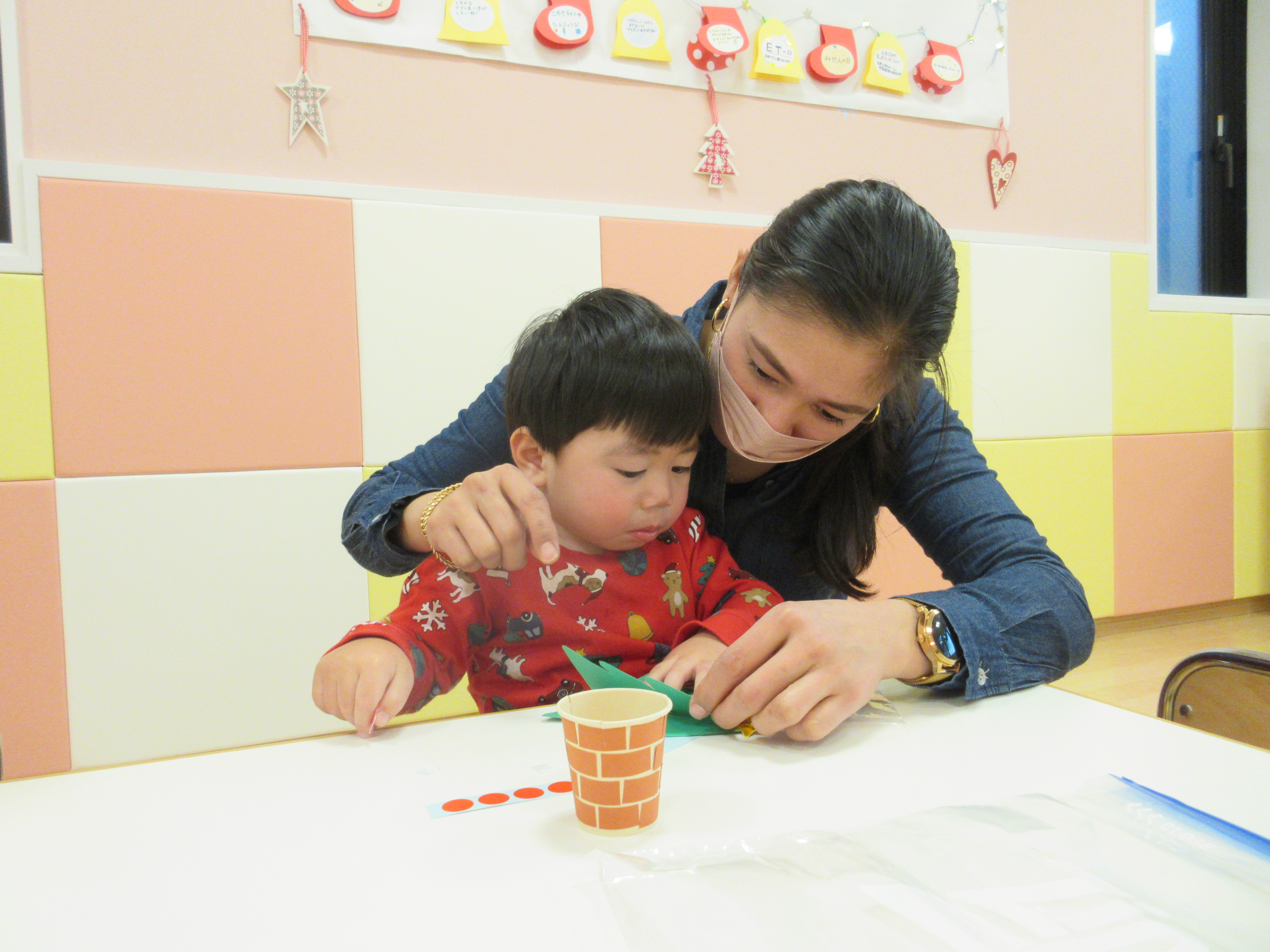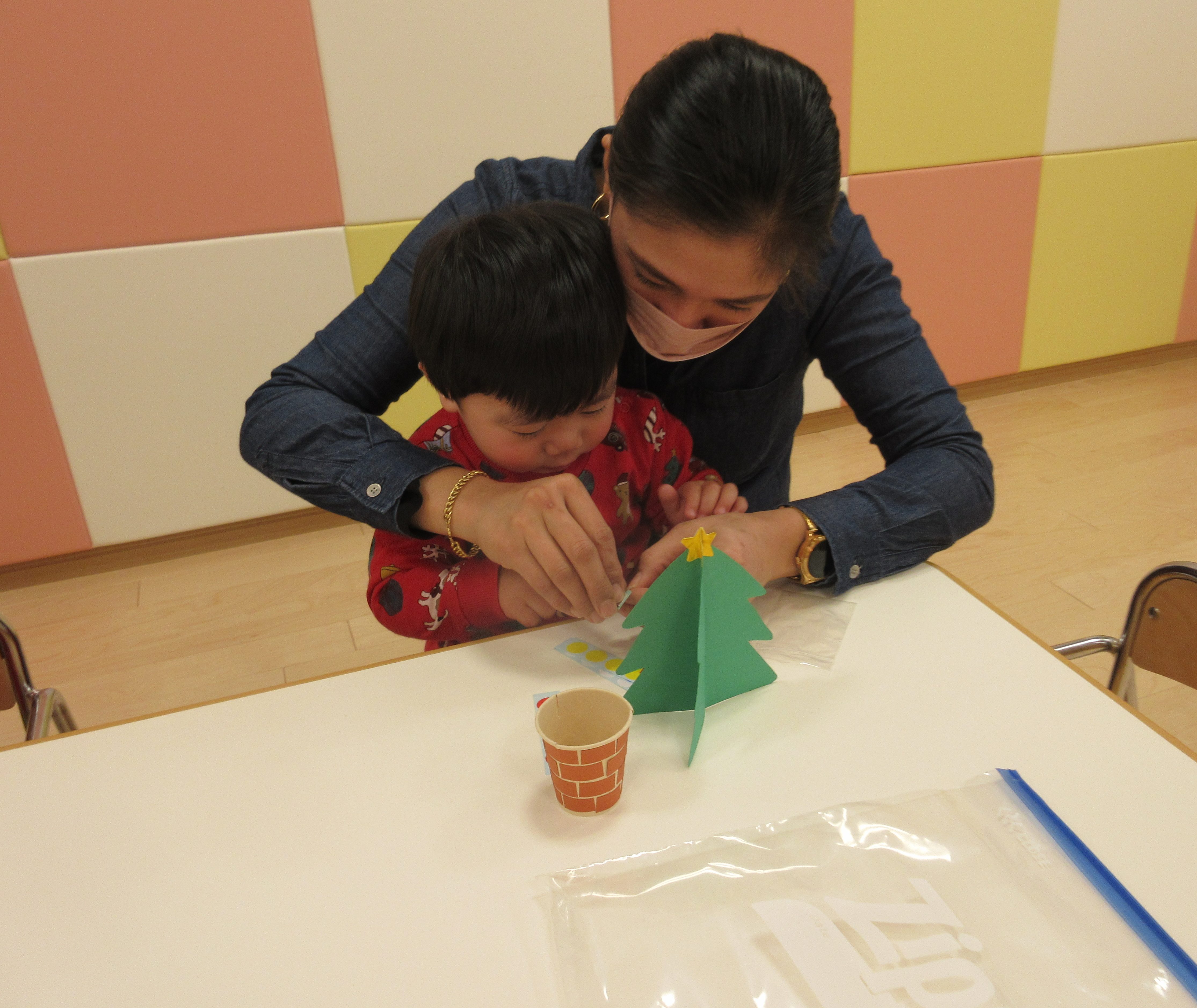 おやつの後はお母さんと一緒にクリスマスツリーの製作?
