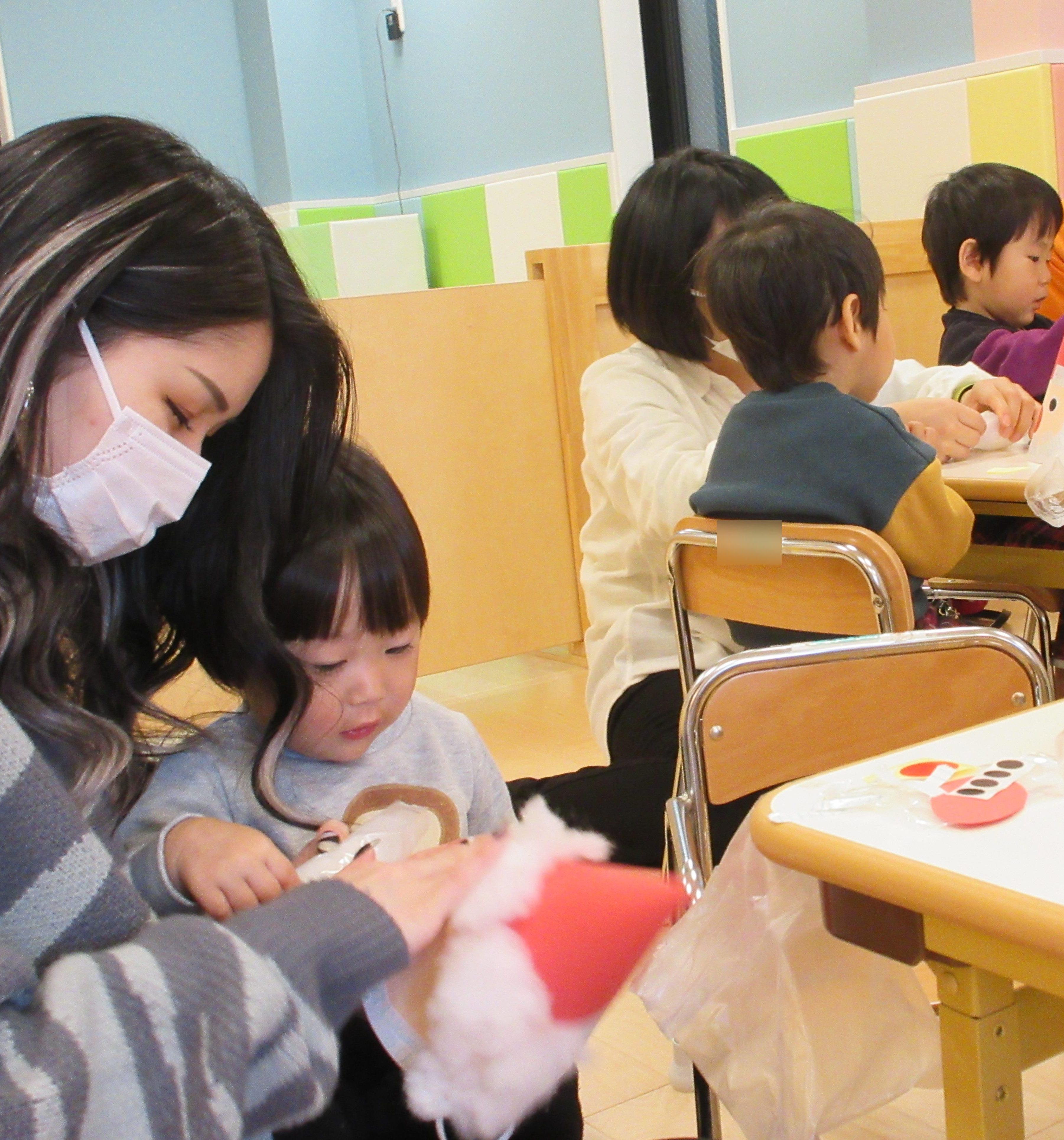 「ここかな?」とお話をしながら作る姿やお母さんやお父さんが子どもが貼った後をさりげなく直してあげる姿も・・・(笑)