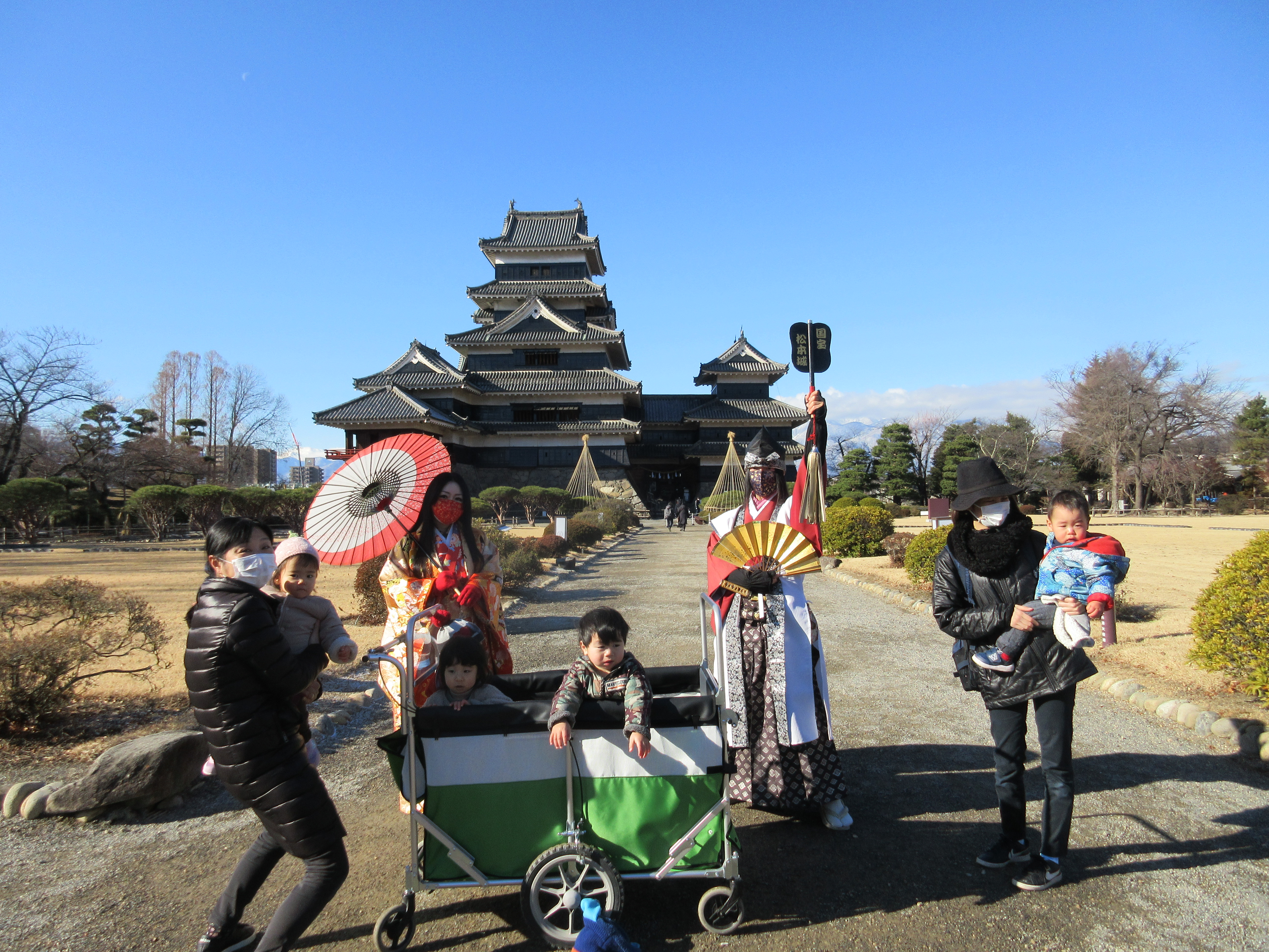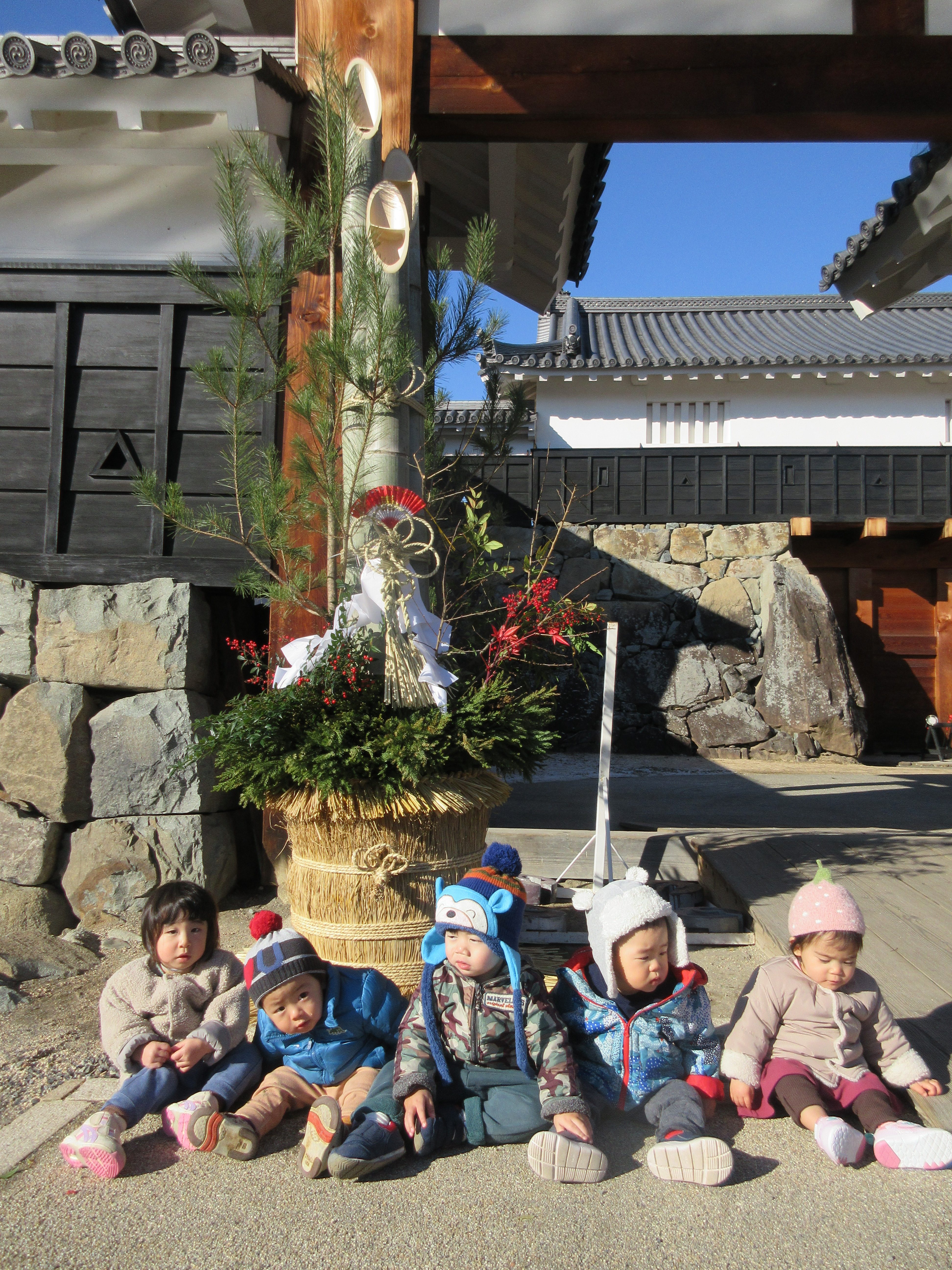 今日は今年最後の保育園の日。全員揃ったので松本城の門松の前で記念撮影をしてきました?