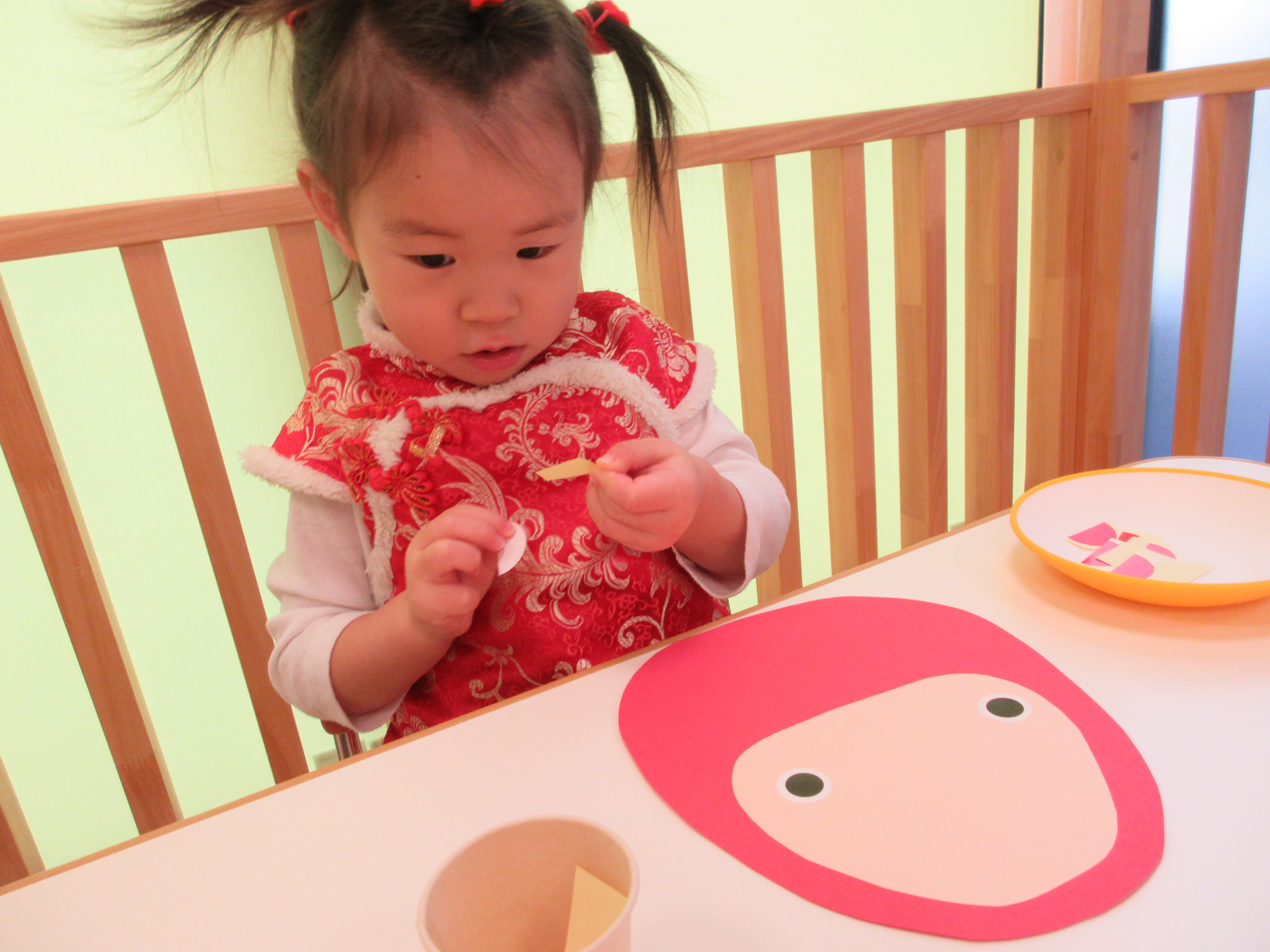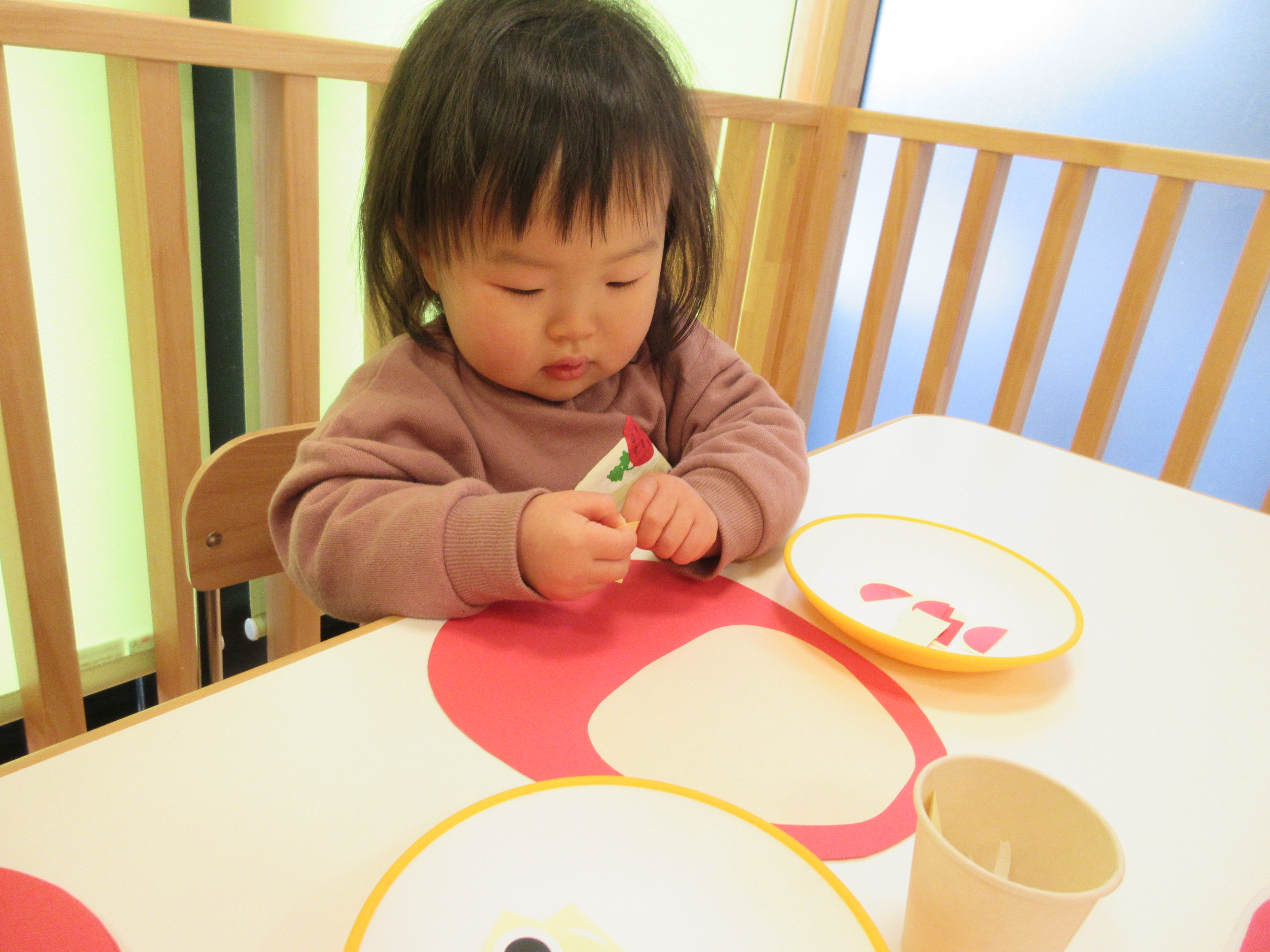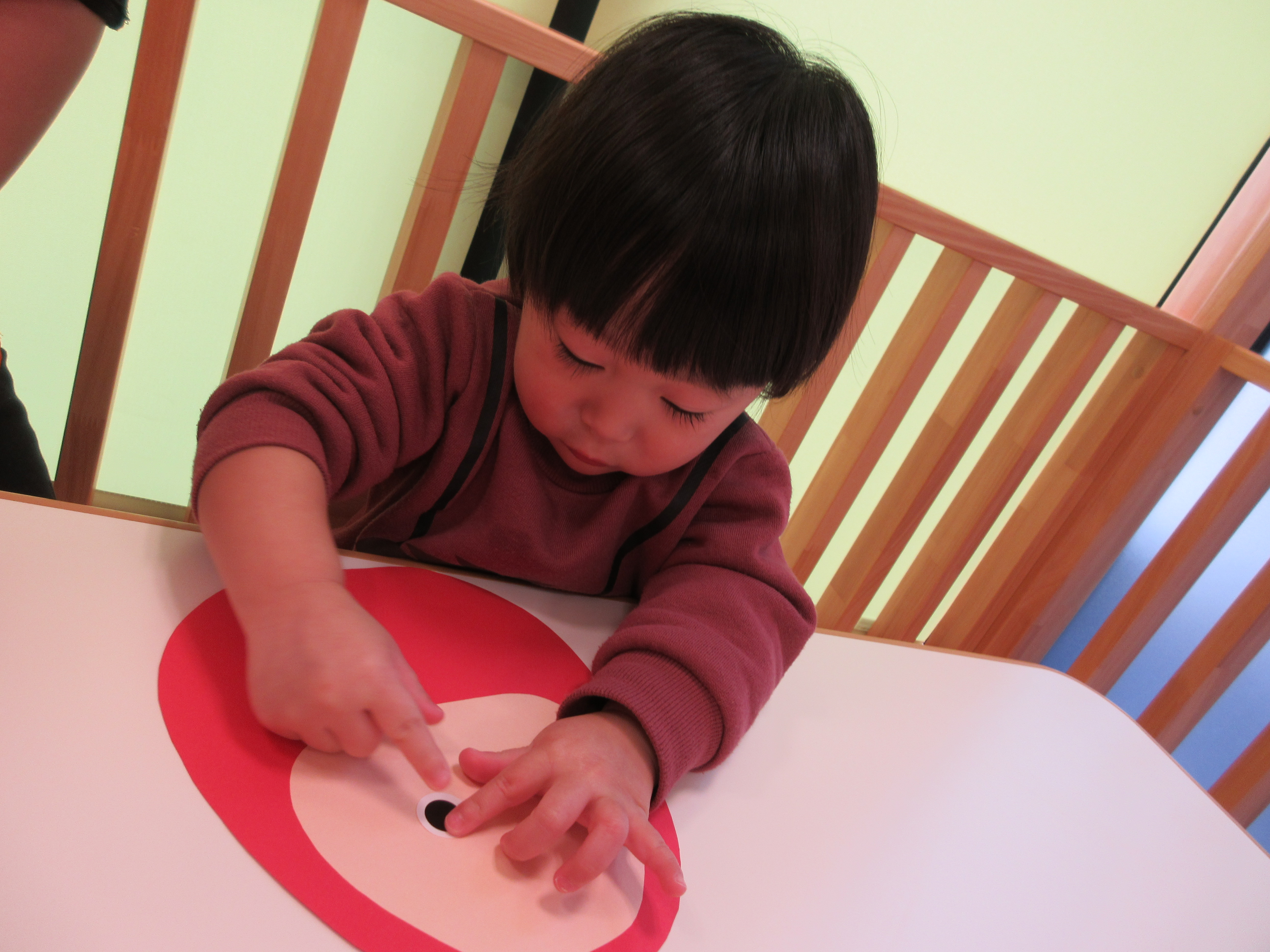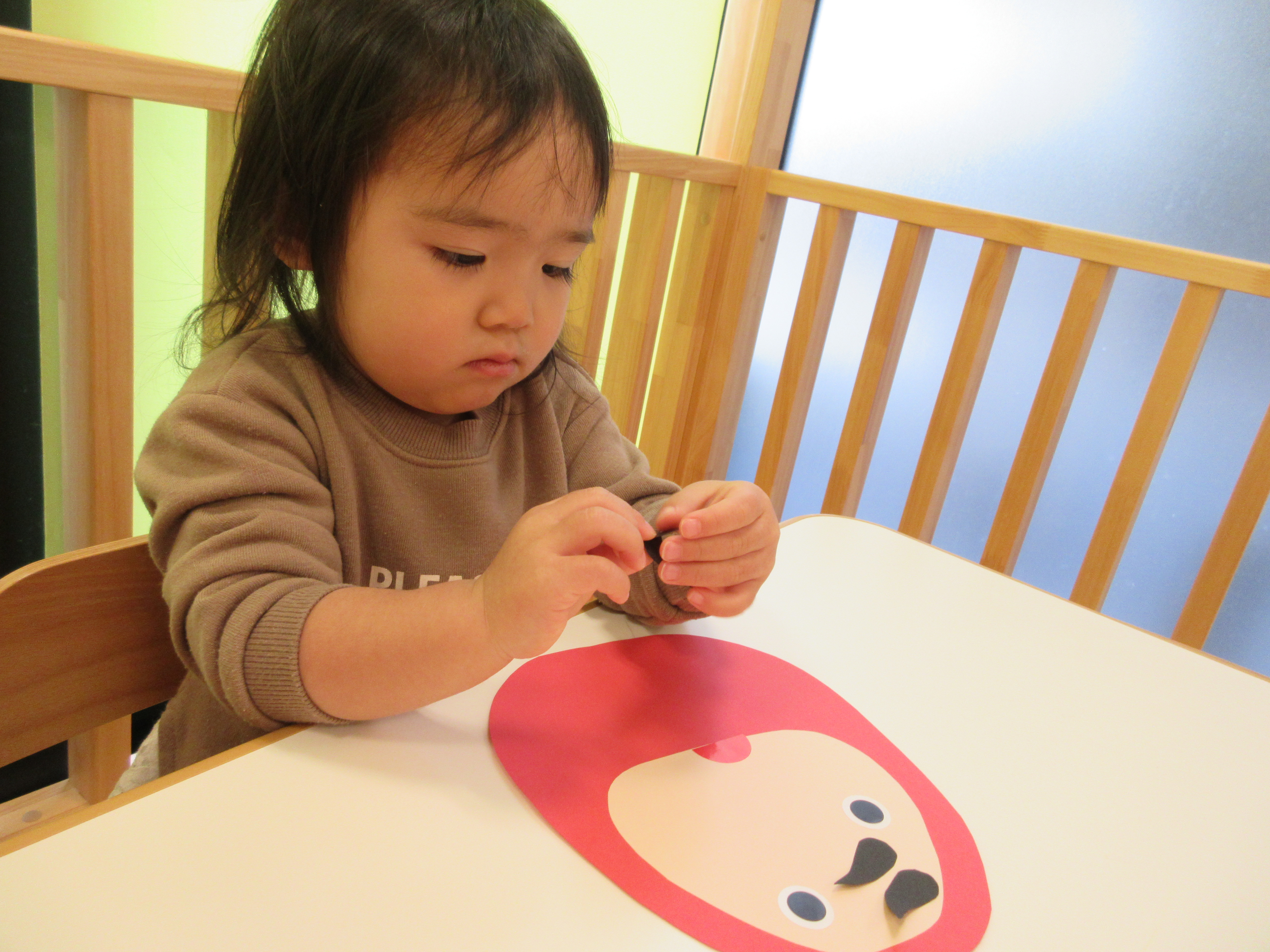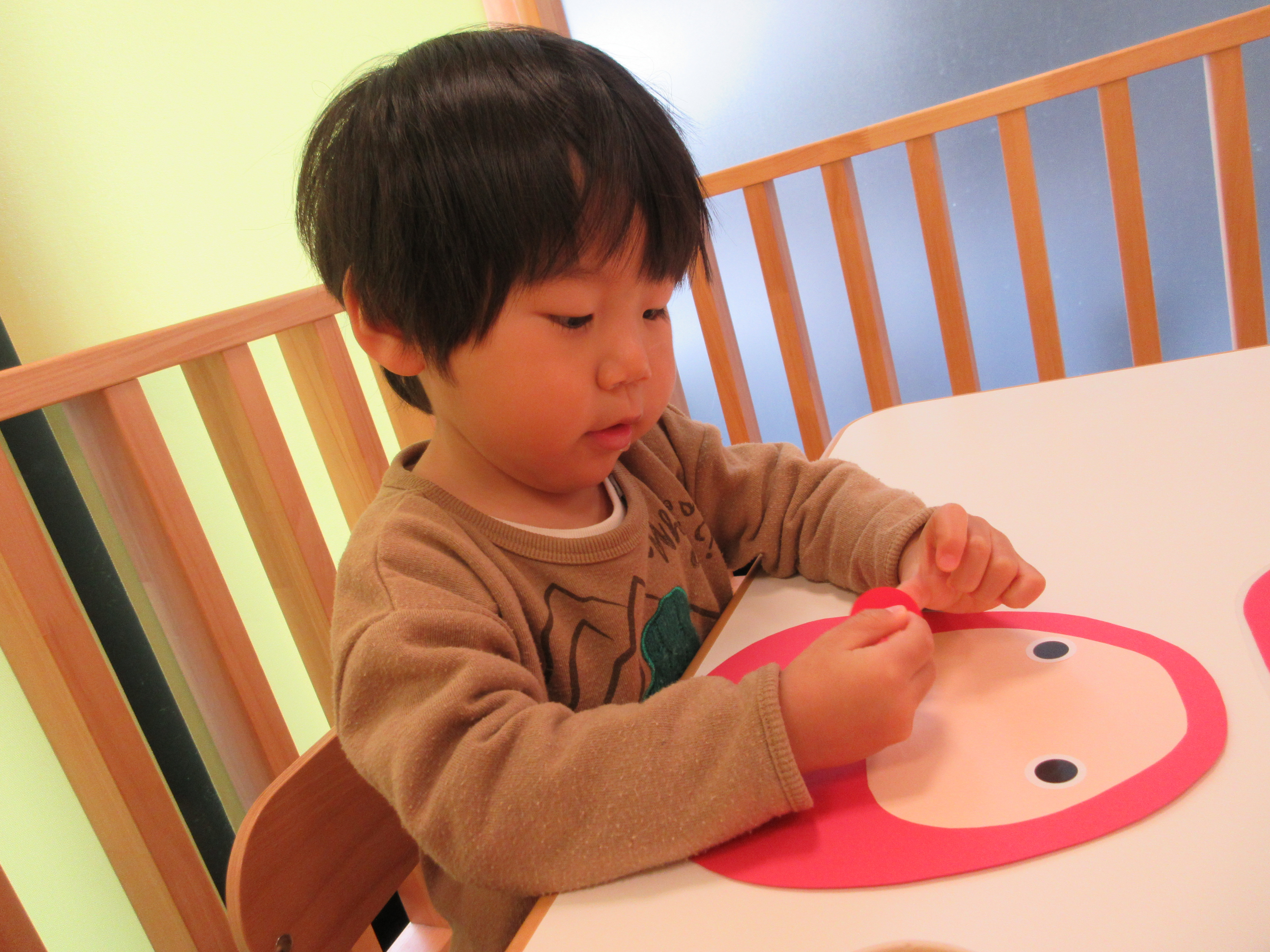 「こっちー」「そこじゃなーい」と目や口を貼る位置を得意げな顔で先生に教えてくれる子もいました![]()