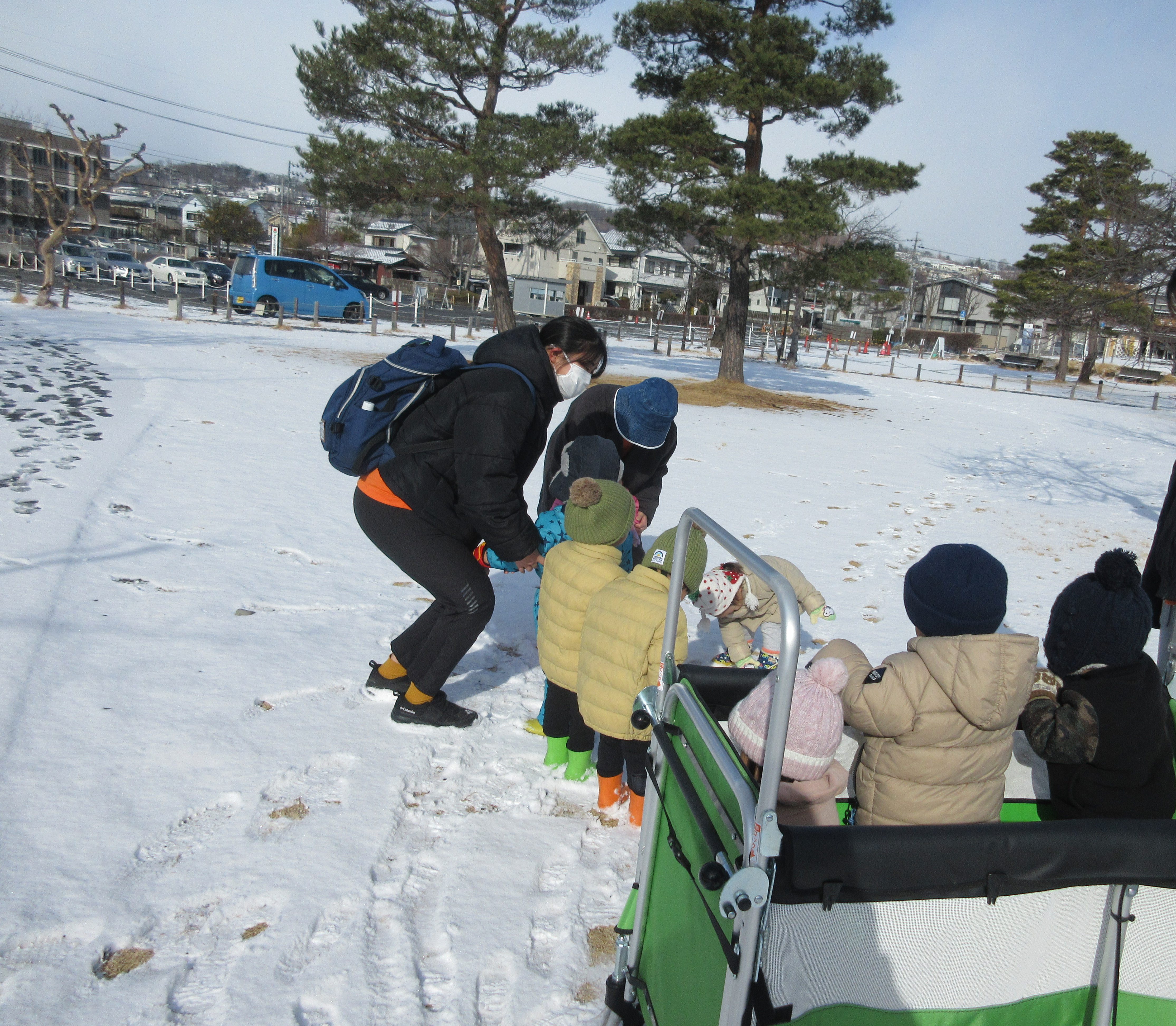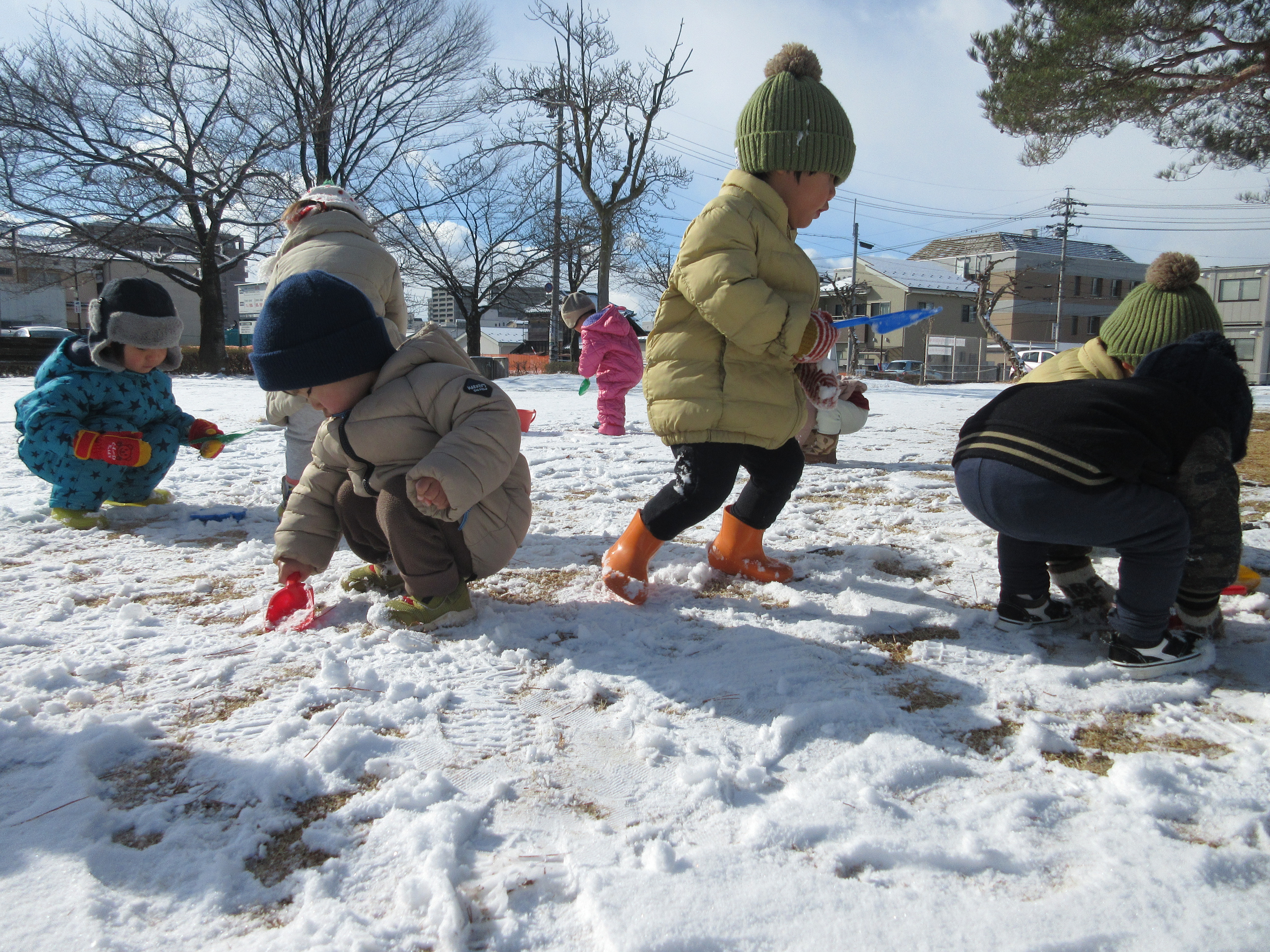 朝から雪遊びを楽しみにする姿があり、公園に着くといつもと違う姿の芝生公園に 早く遊びたい~ と大はしゃぎの子どもたち![]()