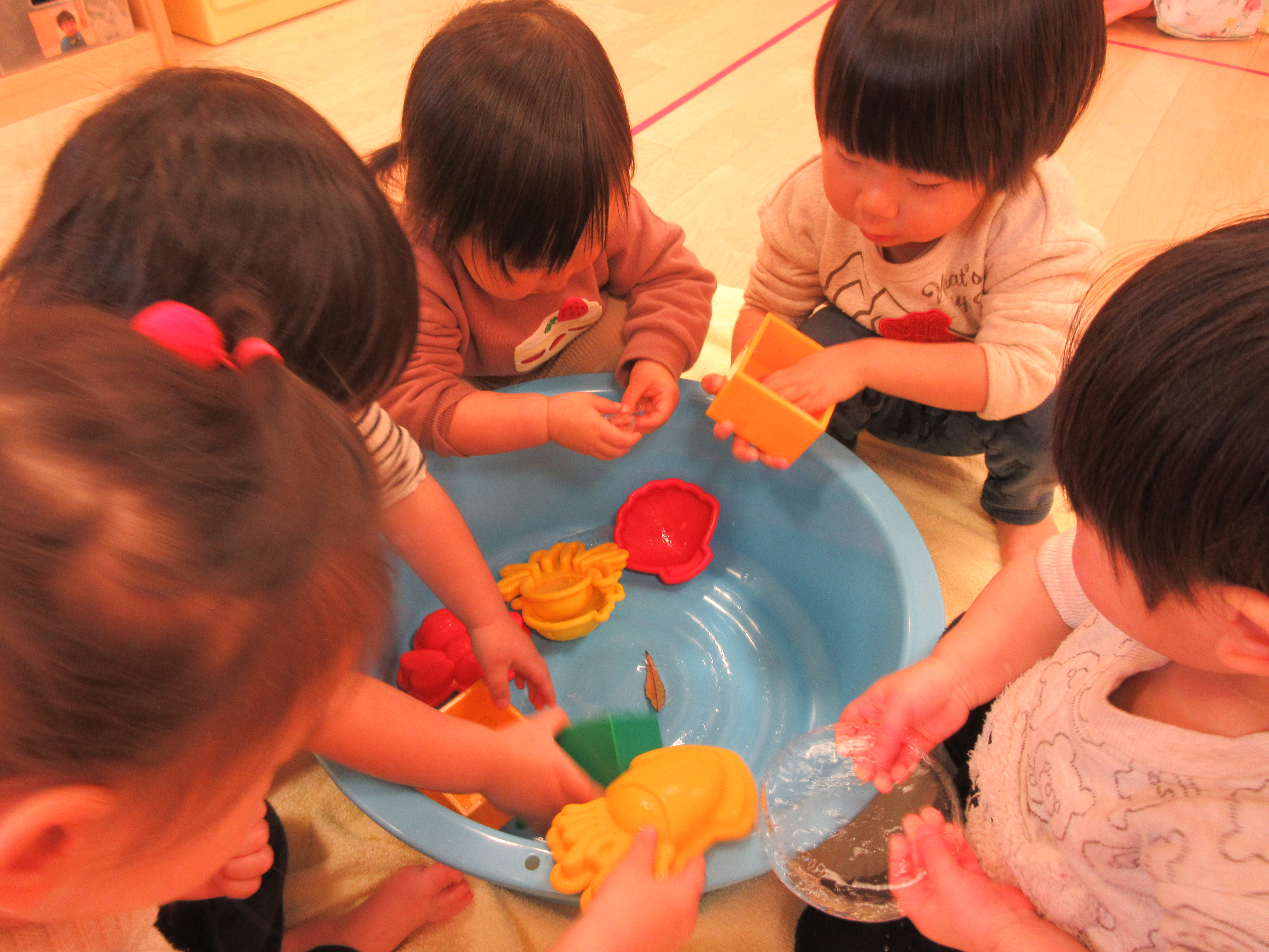 段々と溶けてきて、タライの中が氷ではなく水の方が多くなってきても気にすることなくタライに手を入れて嬉しそうに氷を探す子どもたちでした。