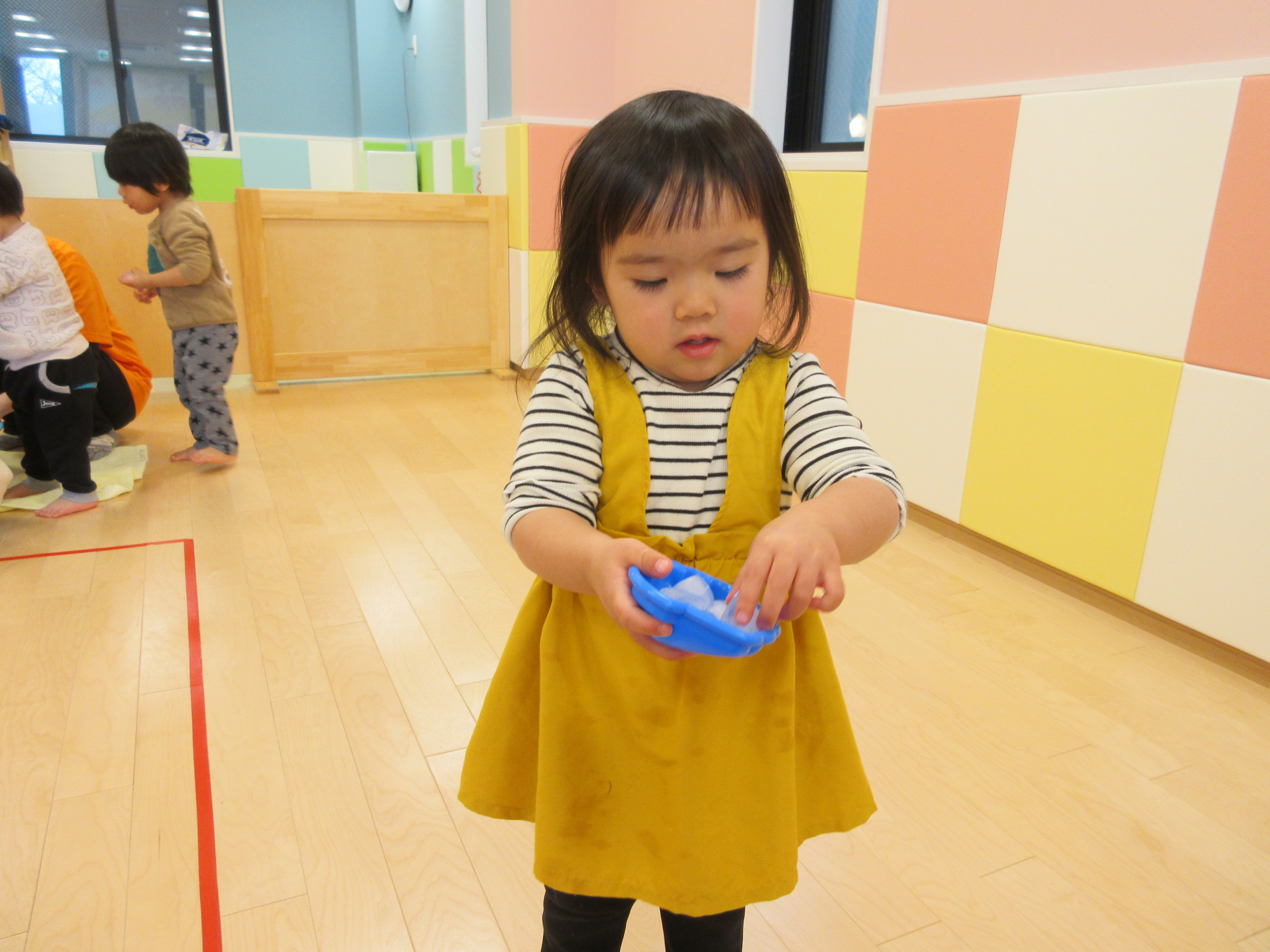 ⇩「みてーおやつだよー」と言い、氷をおやつに見立てて遊ぶ子もいました。