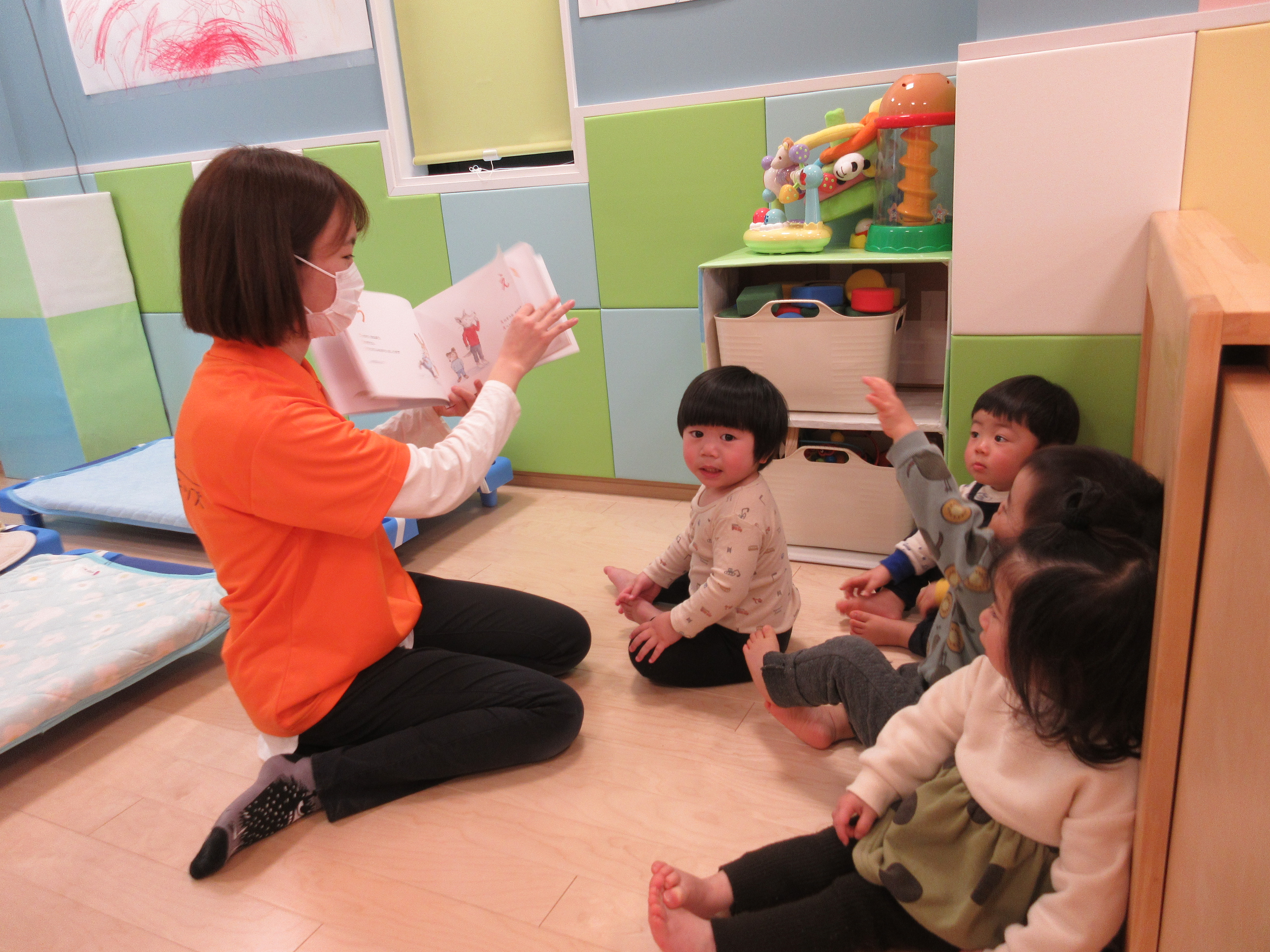 自分の名前の文字が出てくると「あっ!!」と指差しをする子もいました。まだひらがなを理解するのは難しい年齢ではありますが、文字を形として覚えているのかもしれませんね![]()