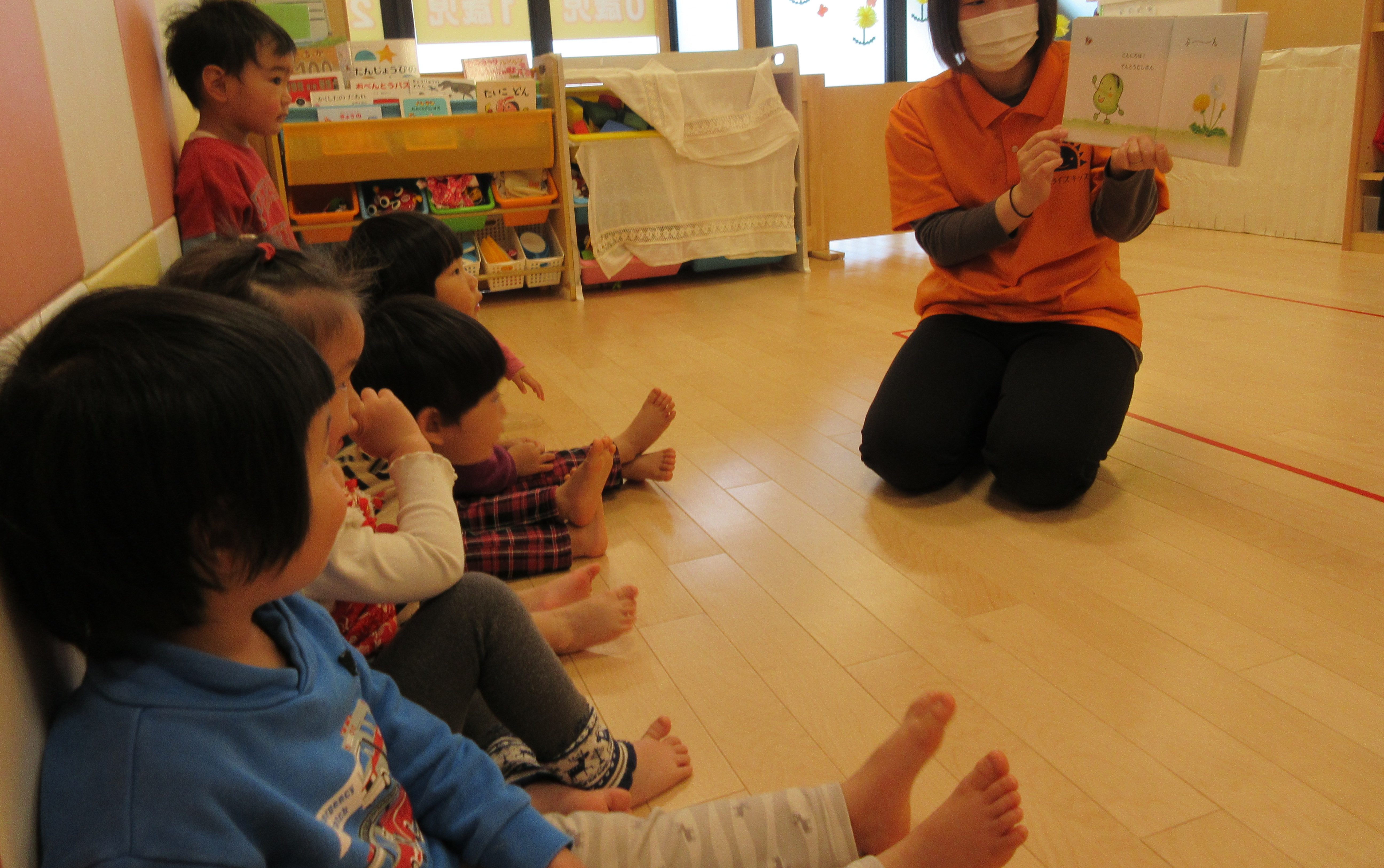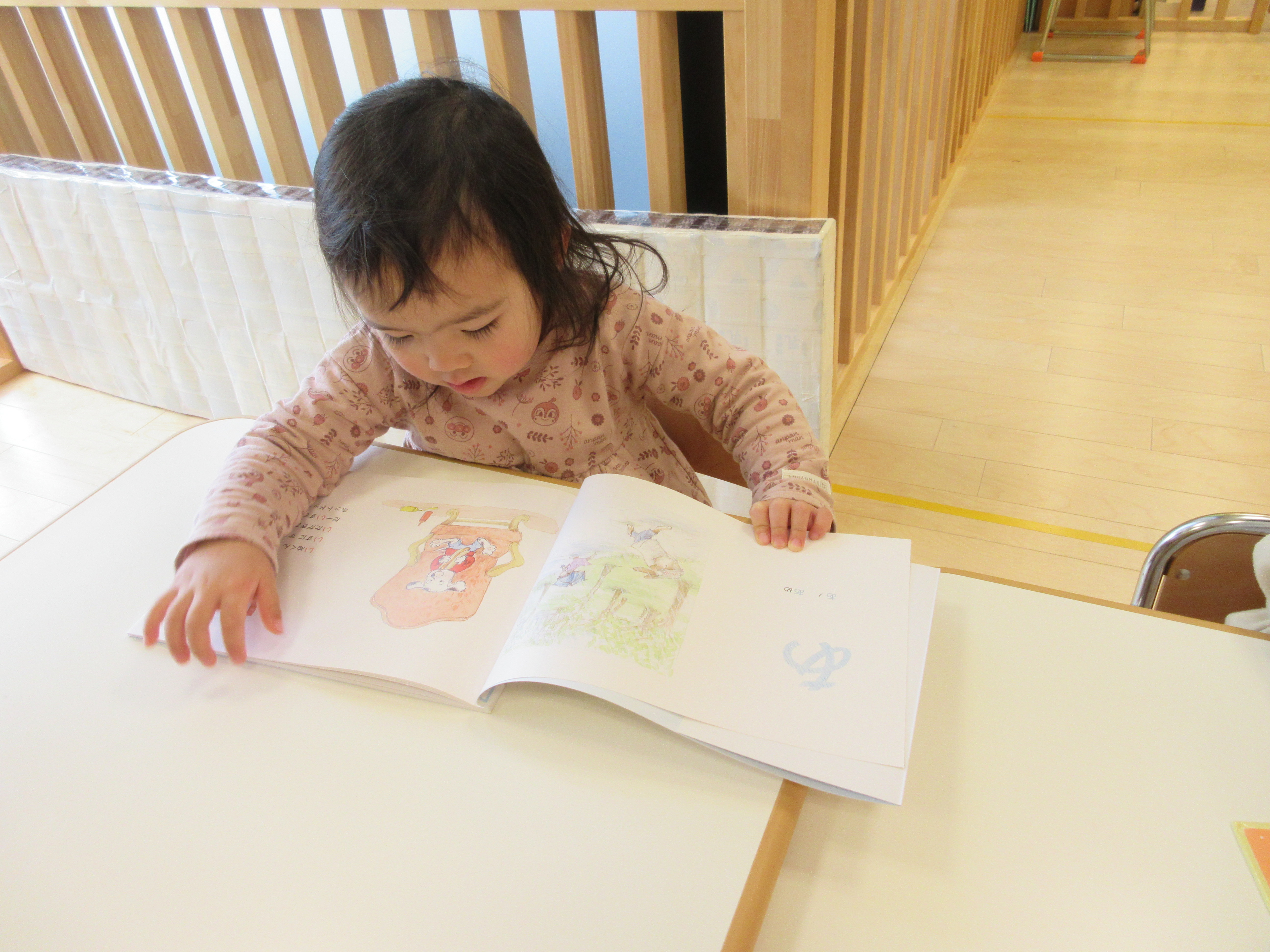 優しい絵柄であり子どもたちも興味津々。