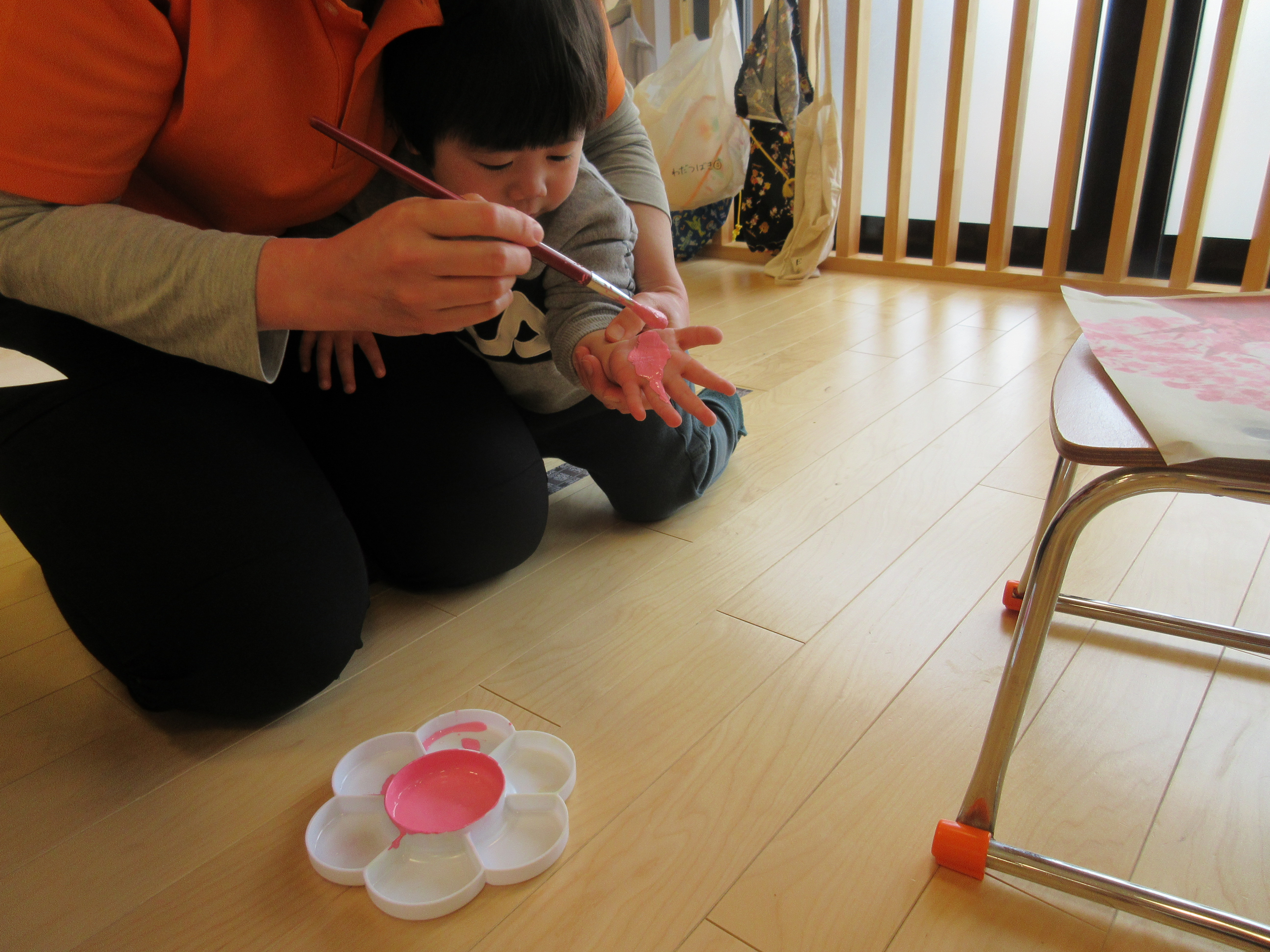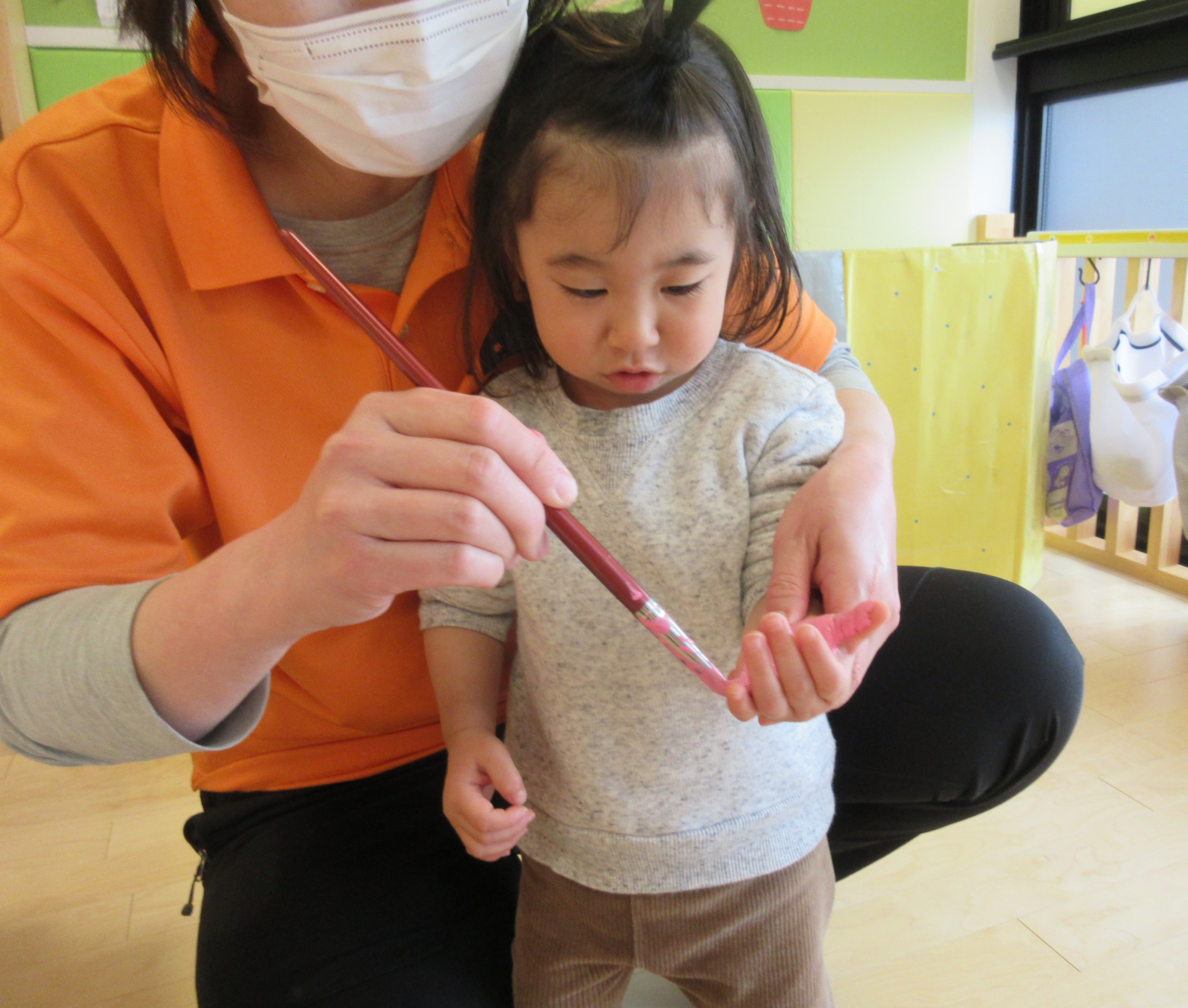 ピンク色の絵の具を手のひらに筆で塗っていくとどの子もその様子をじっと見つめていました。