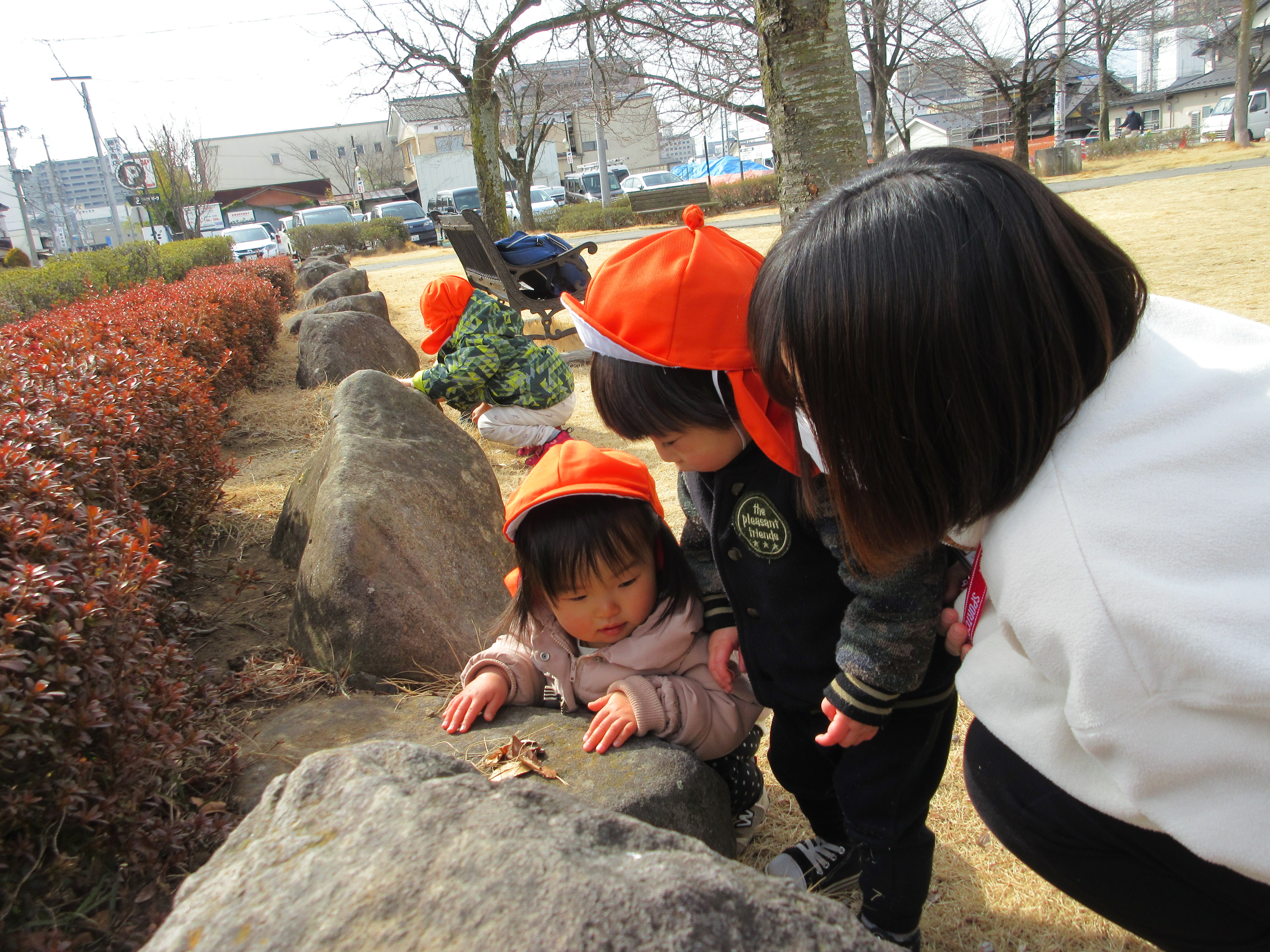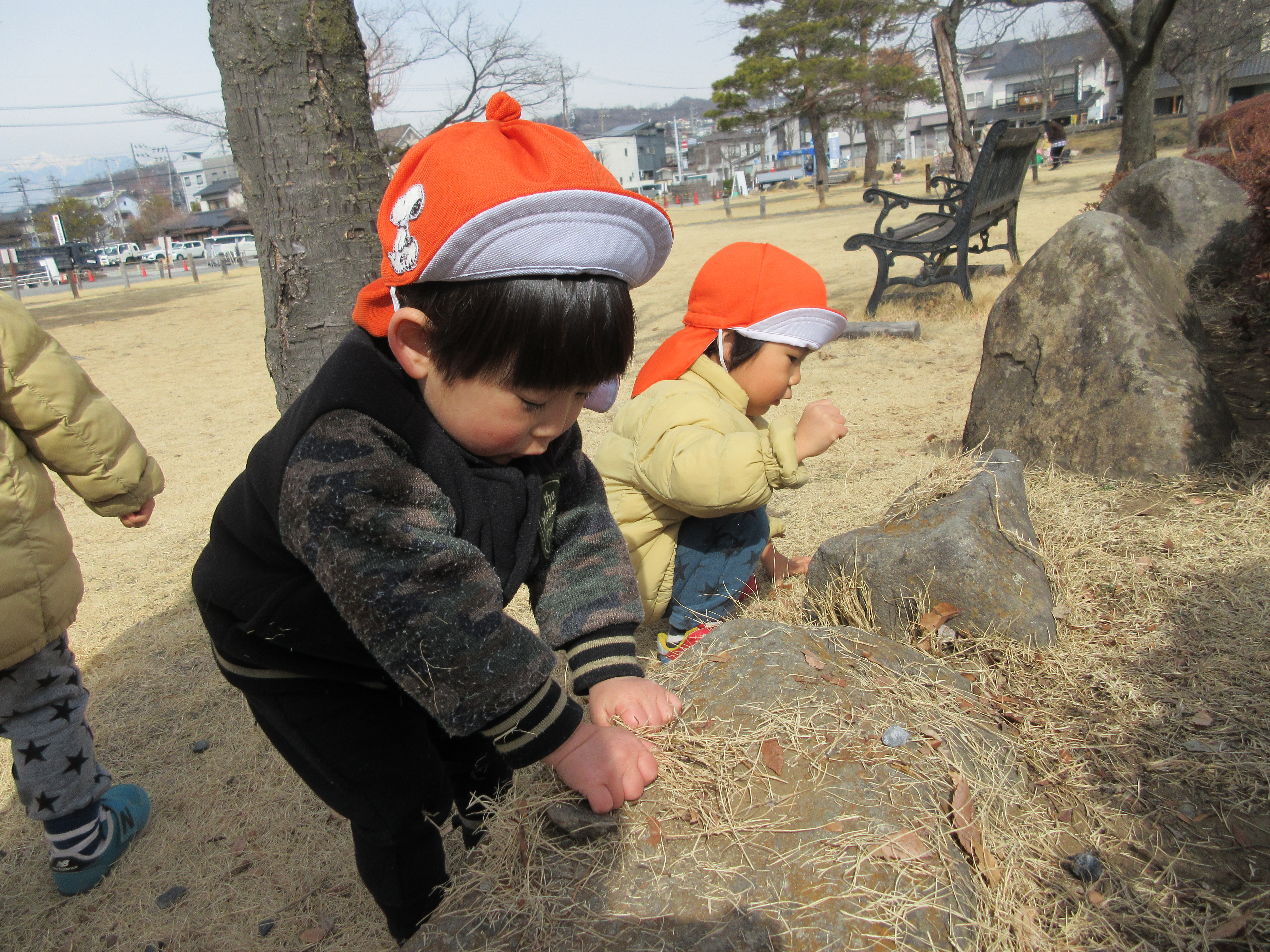 公園に着くとすぐに石や自然物探しを楽しむ子どもたち。