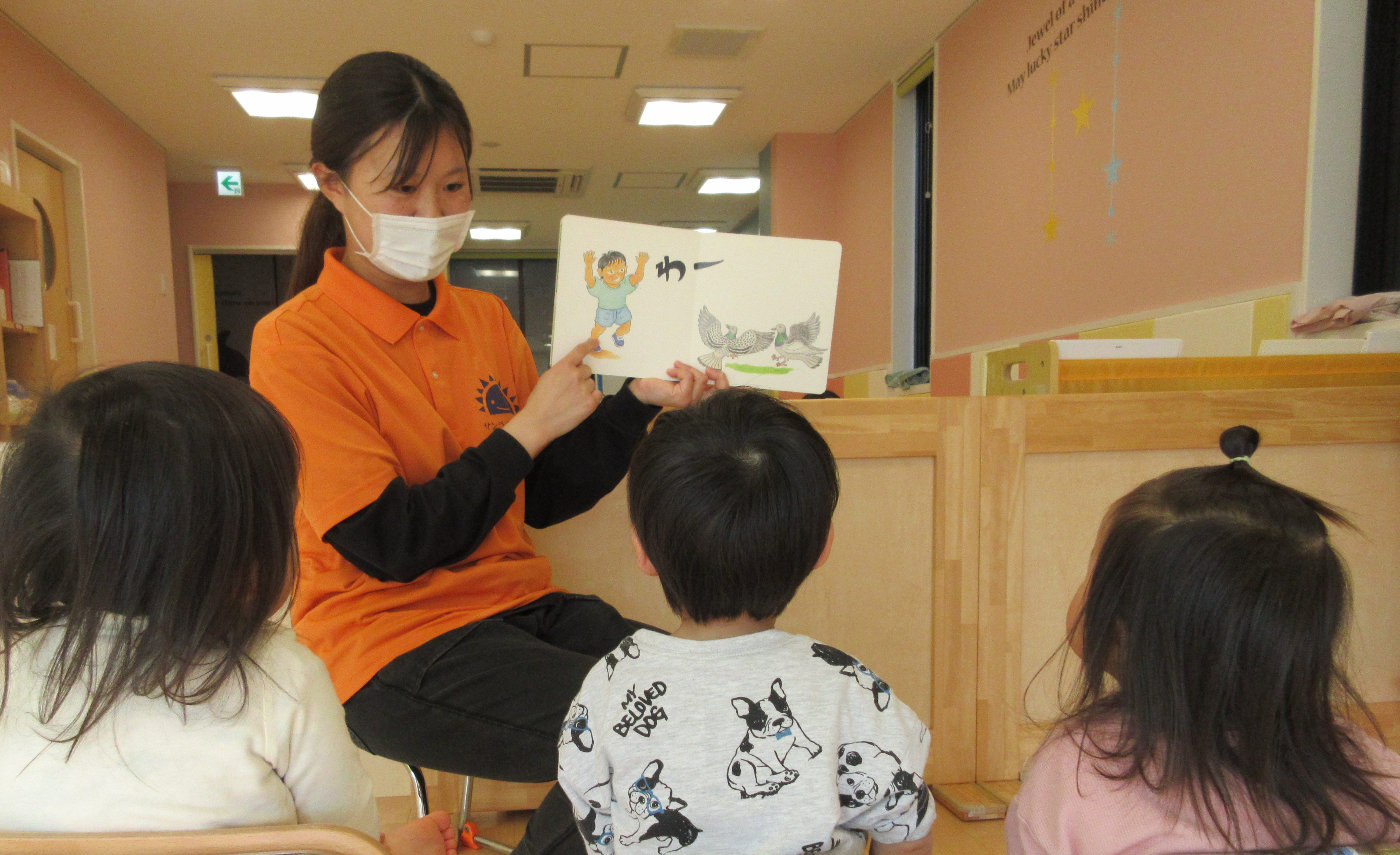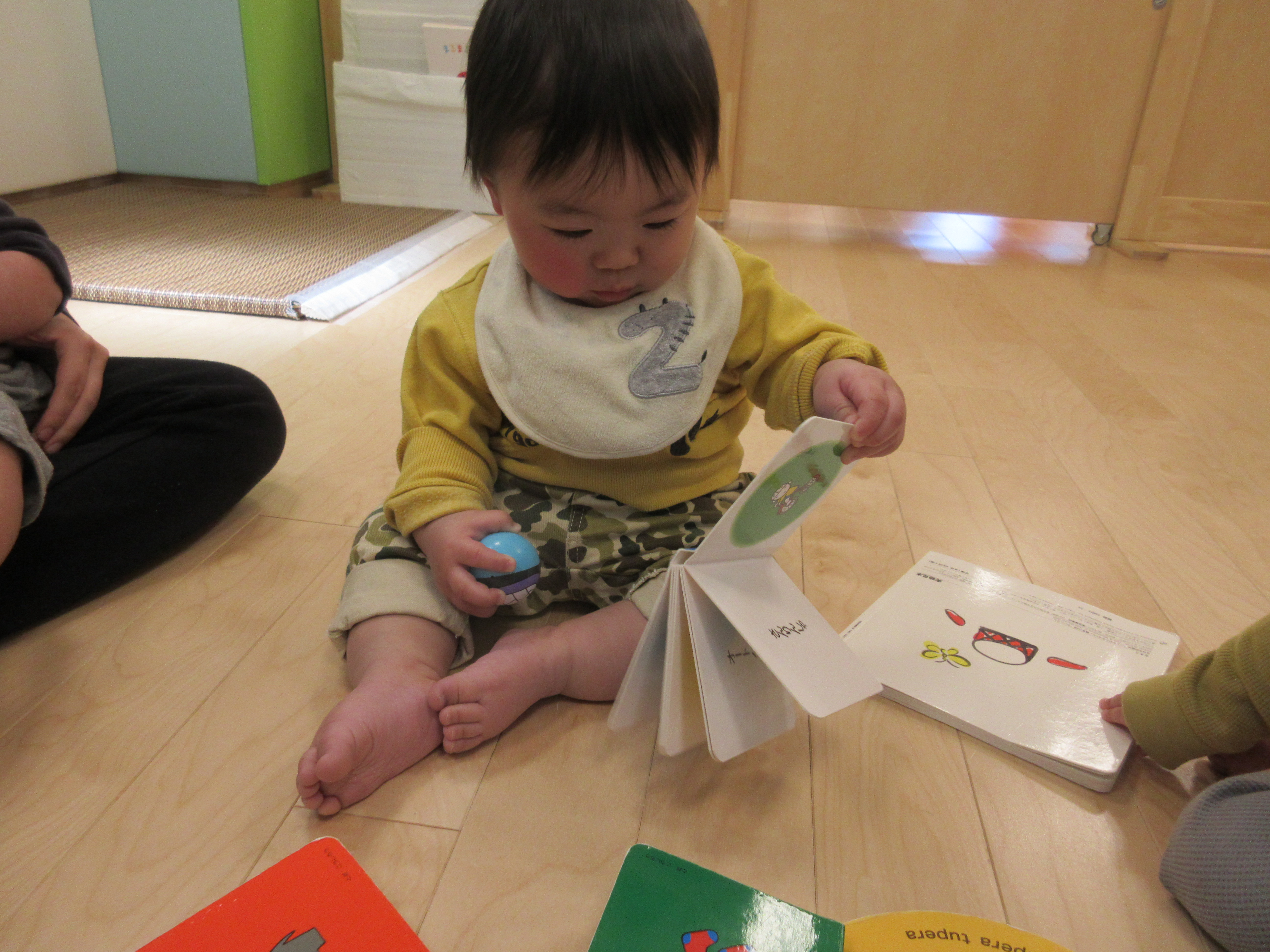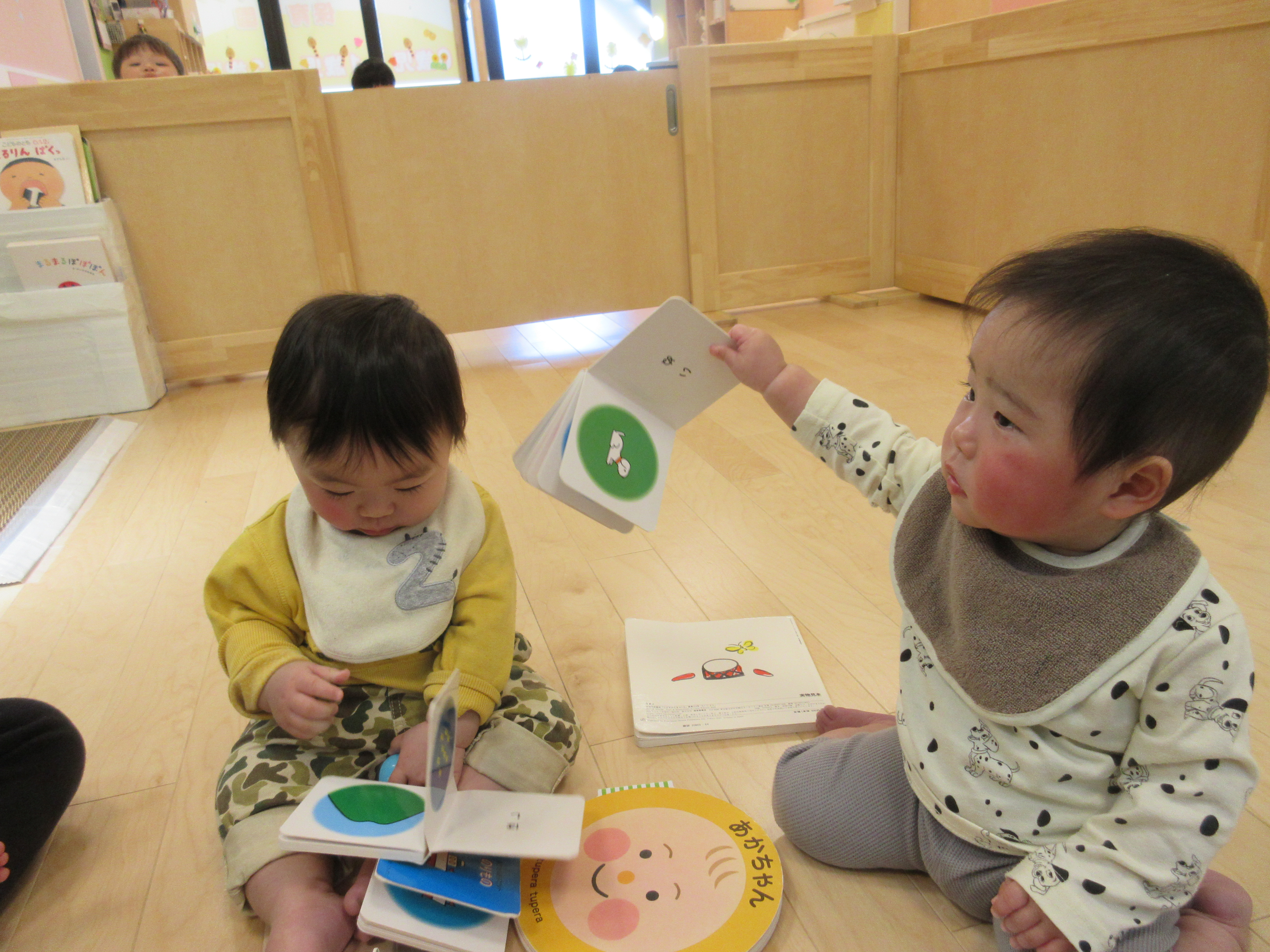 手のひらサイズの絵本が気になるようで、犬の絵を指さしたり絵本をめくってみたりと思い思い楽しむ姿がありました。