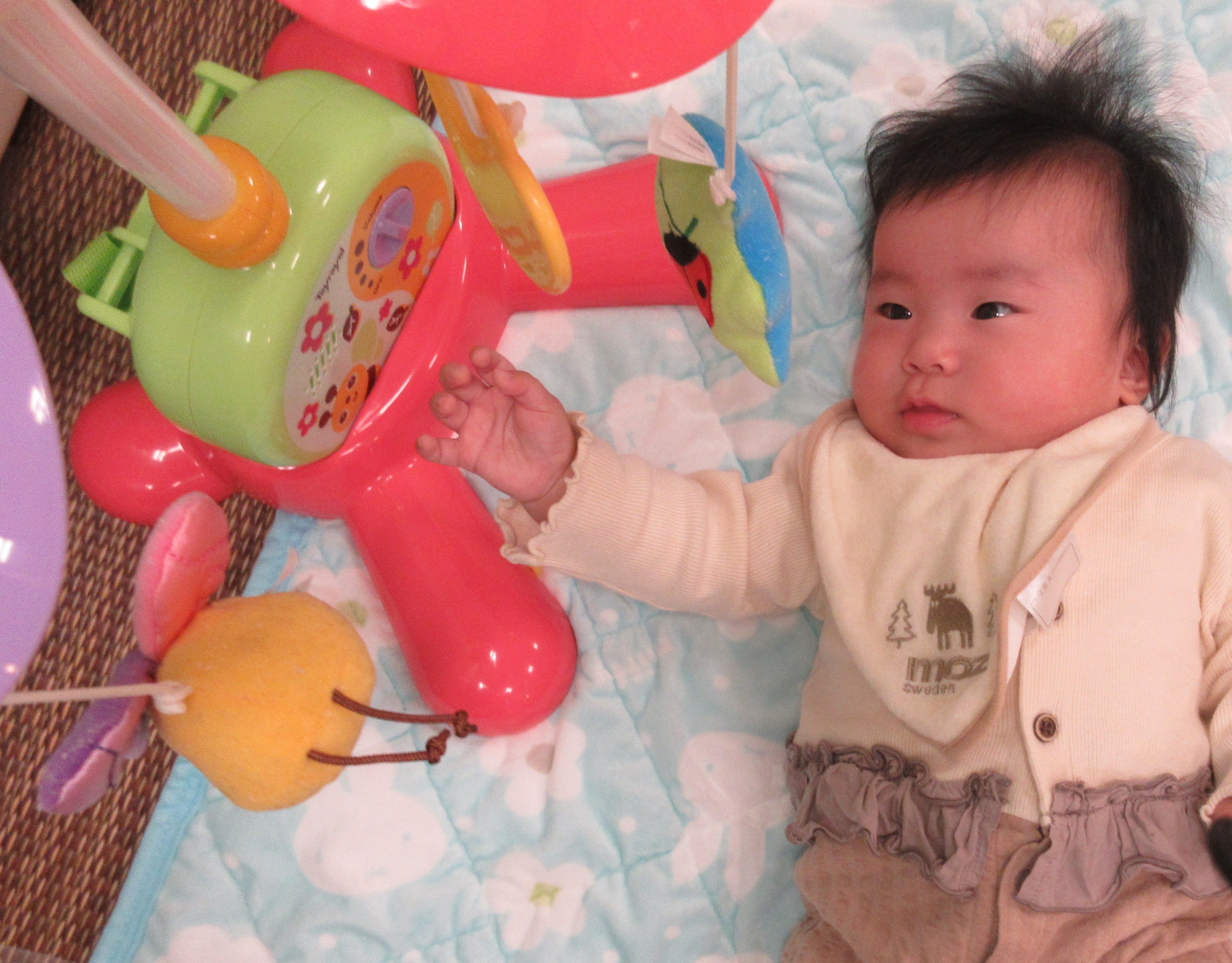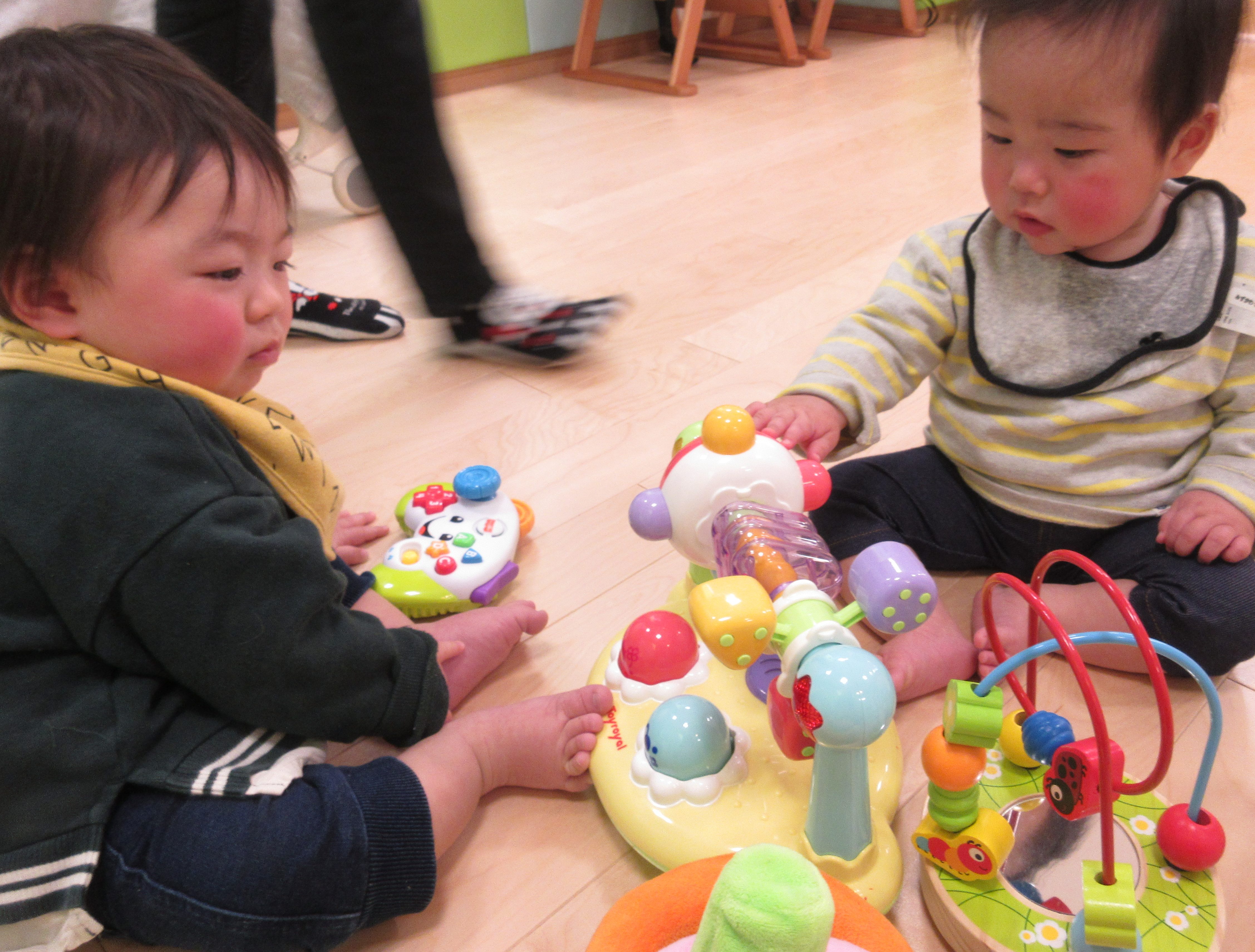 お友だちやおもちゃに興味津々で自分から手を伸ばして遊んでいます![]()