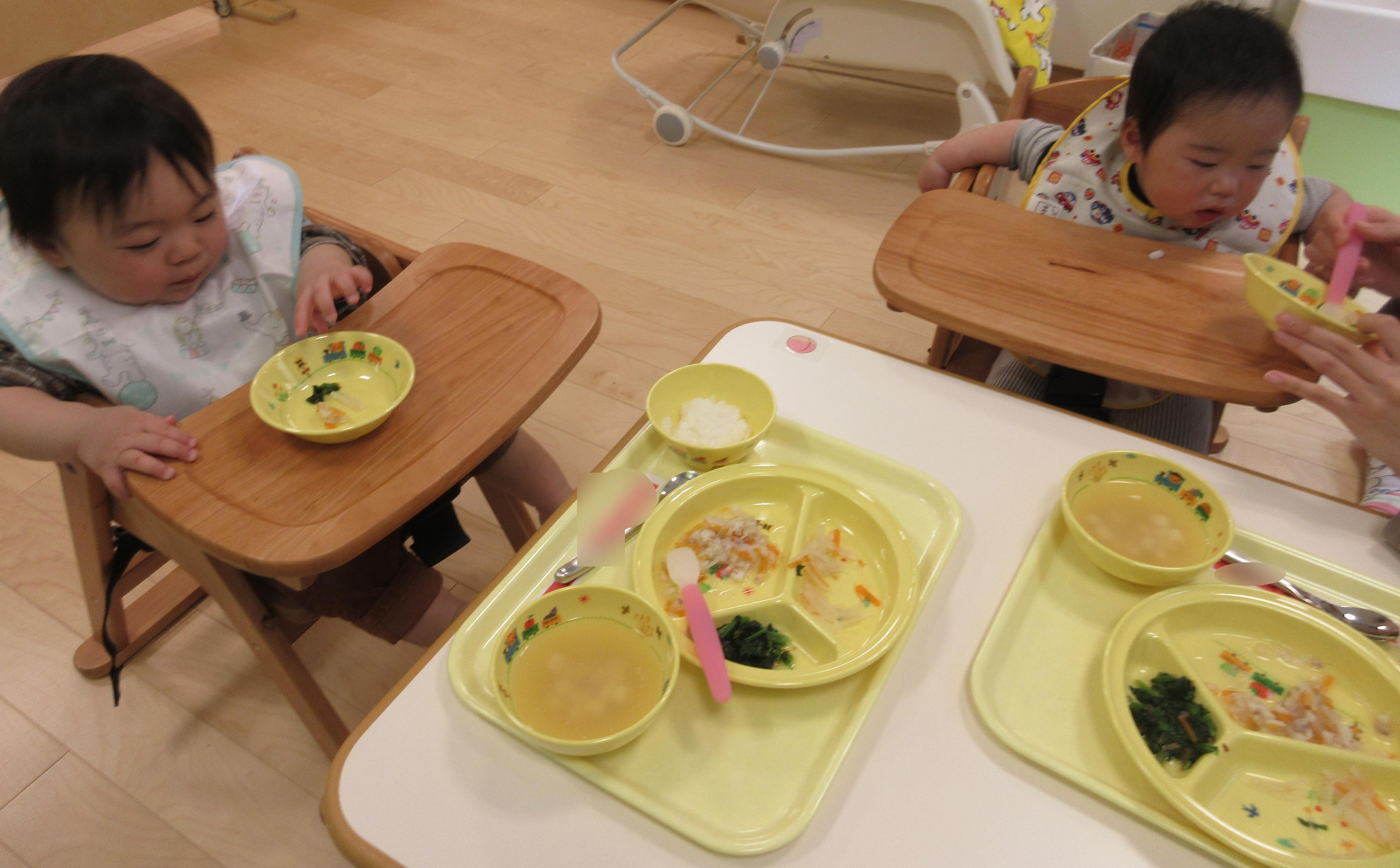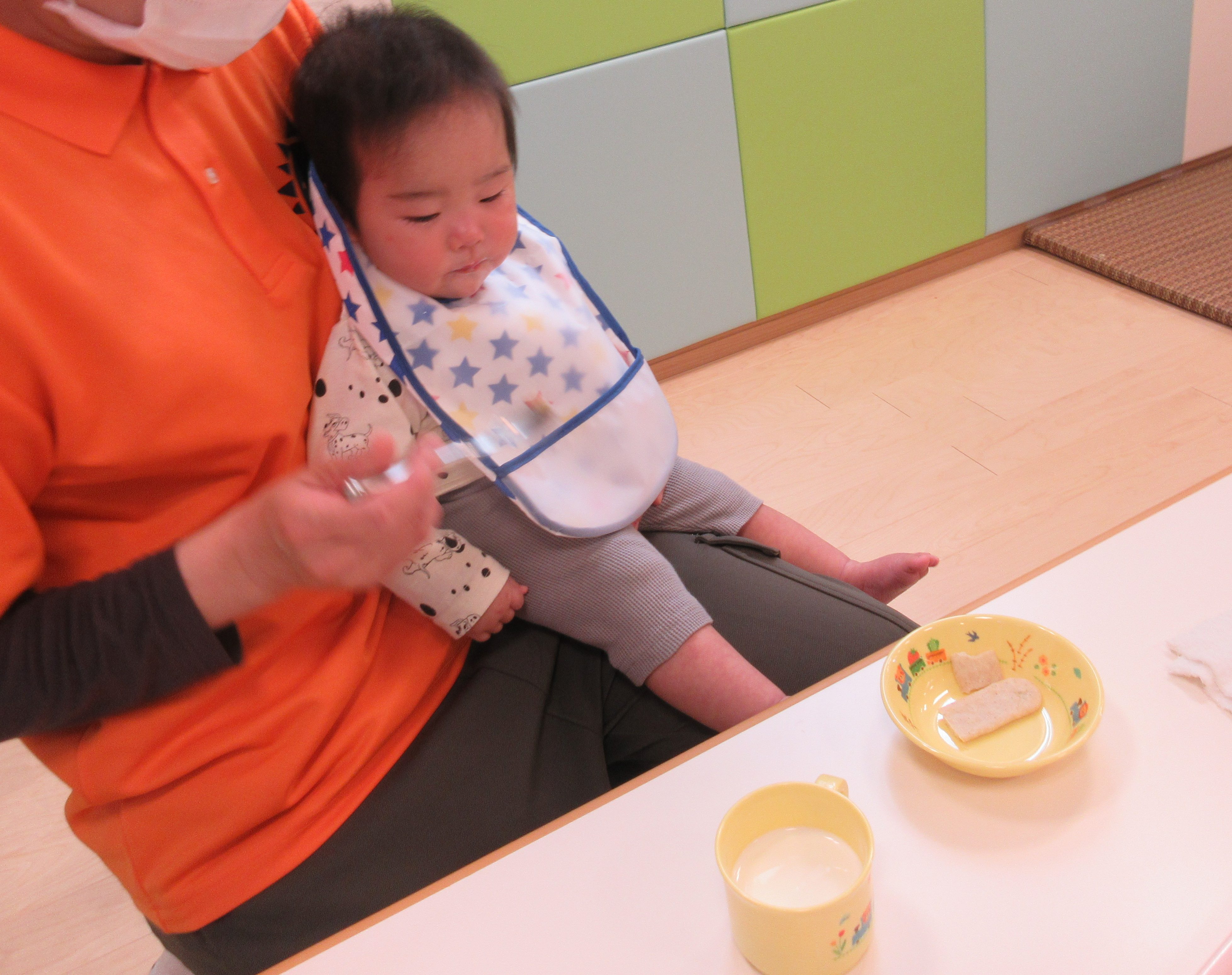自分でおやつを持って口に入れてみたり、先生と一緒にお茶や牛乳を飲んでいます![]()