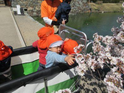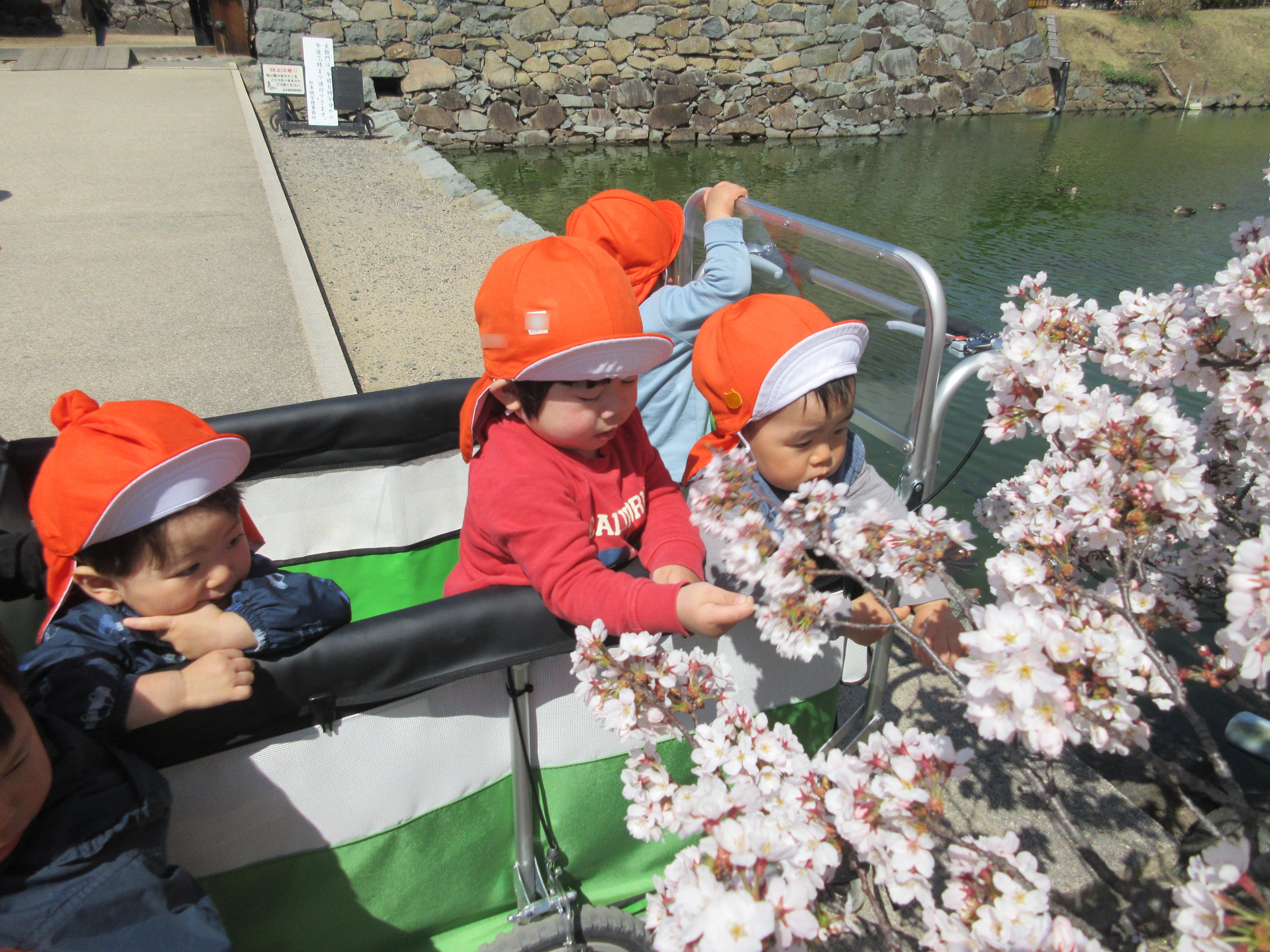 松本城の桜も咲き、太鼓門の前の低いところで咲いている桜の花を目の前で見ると、どの子も興味を持って触っていました。