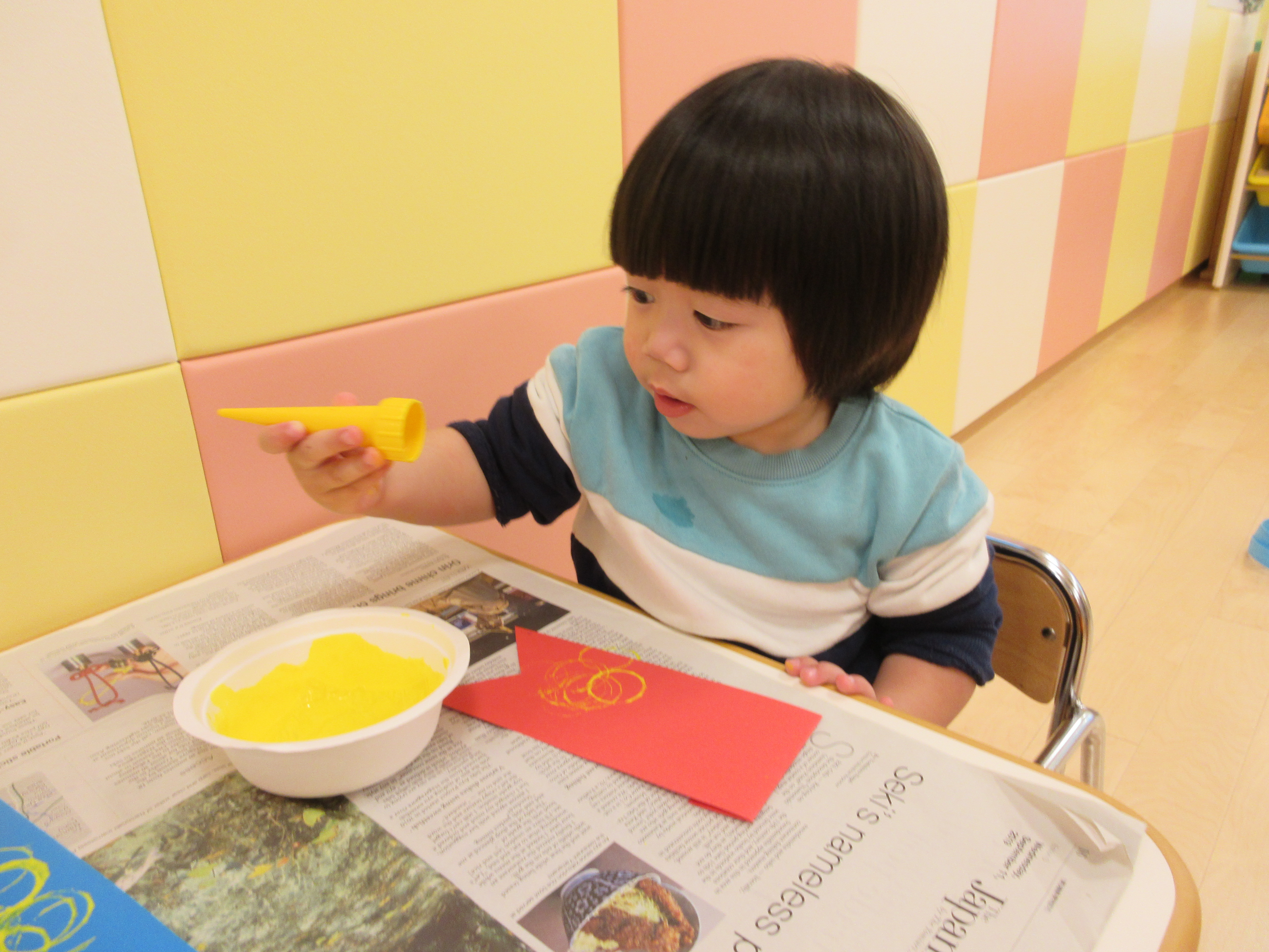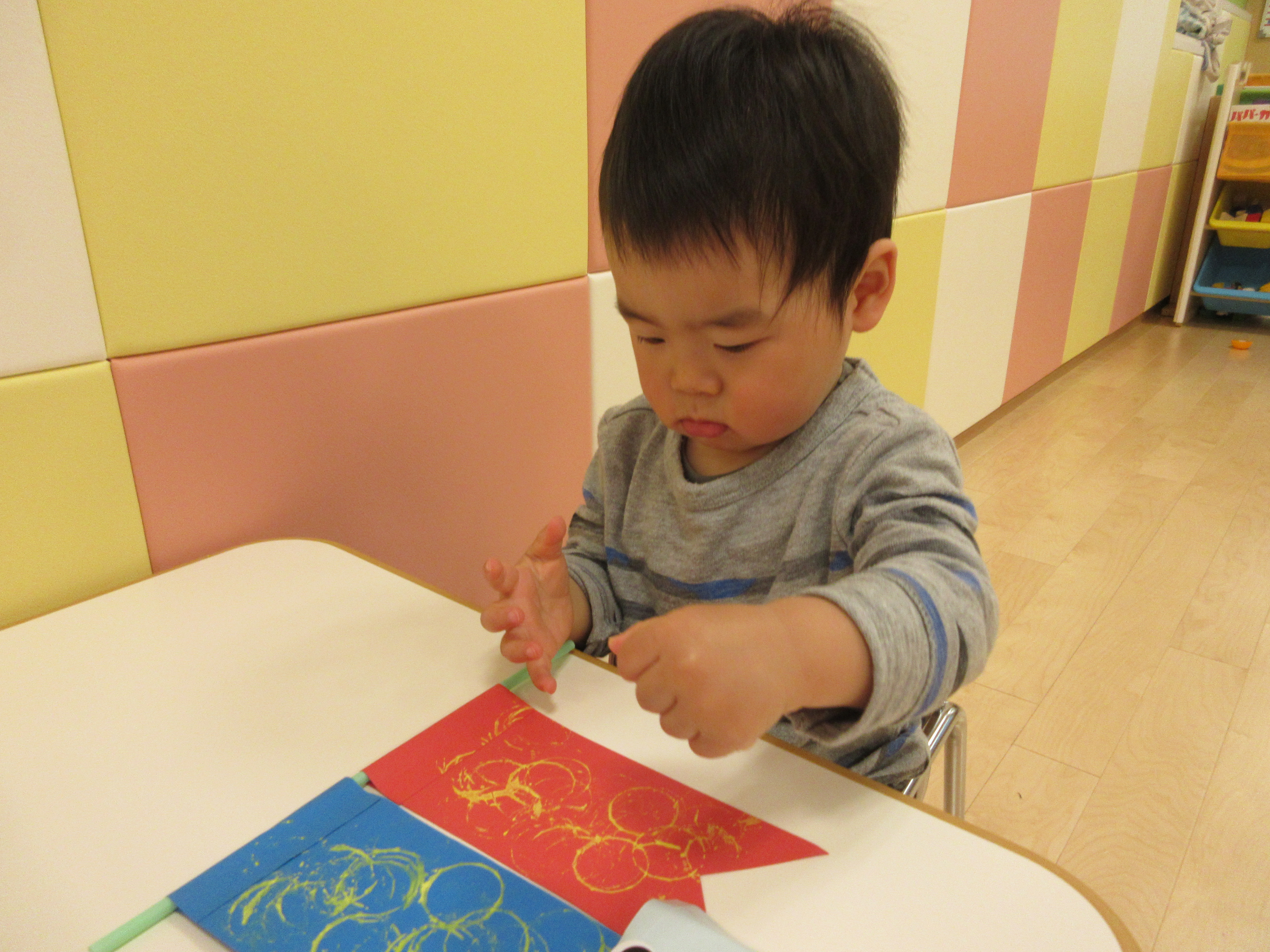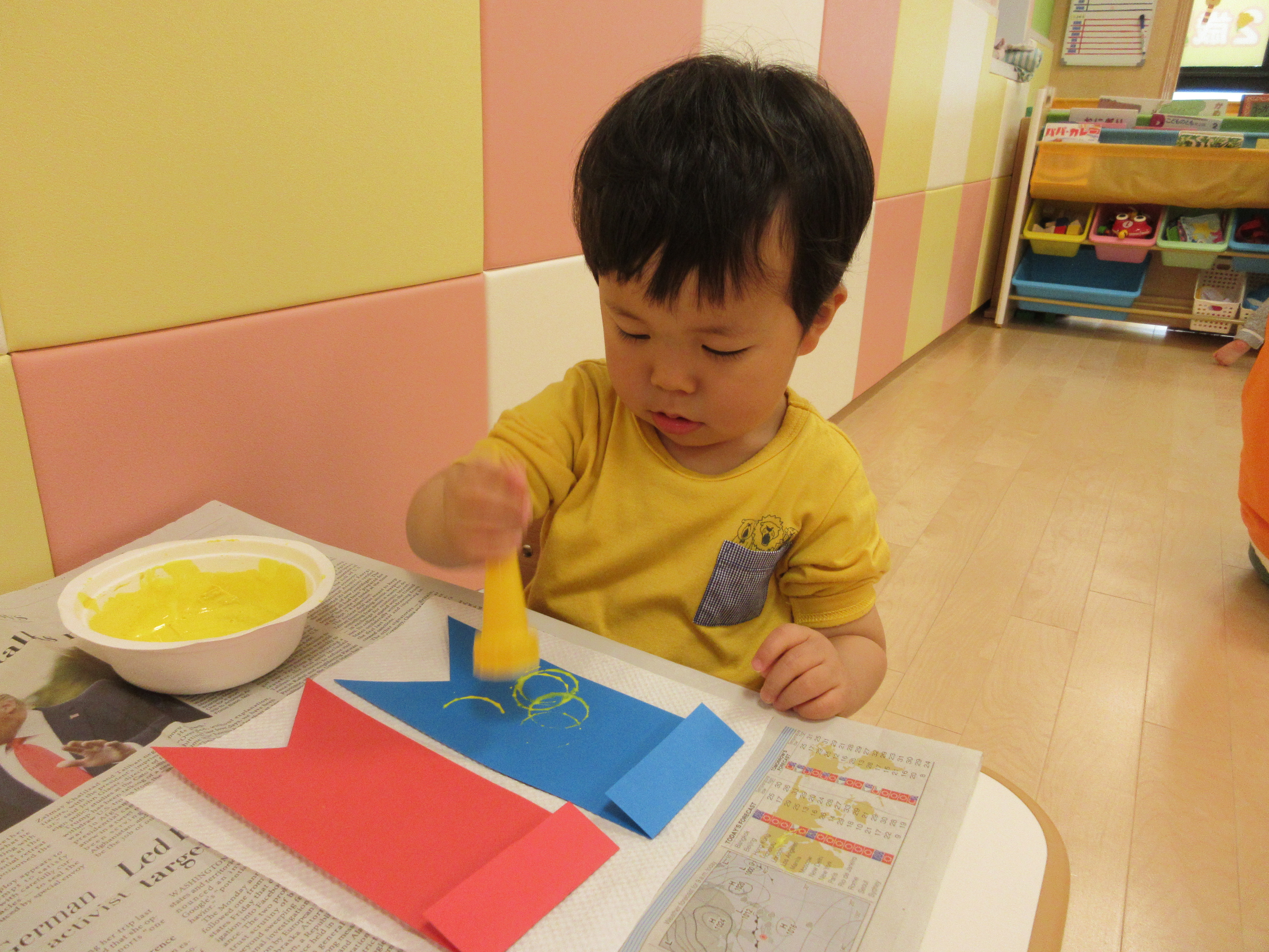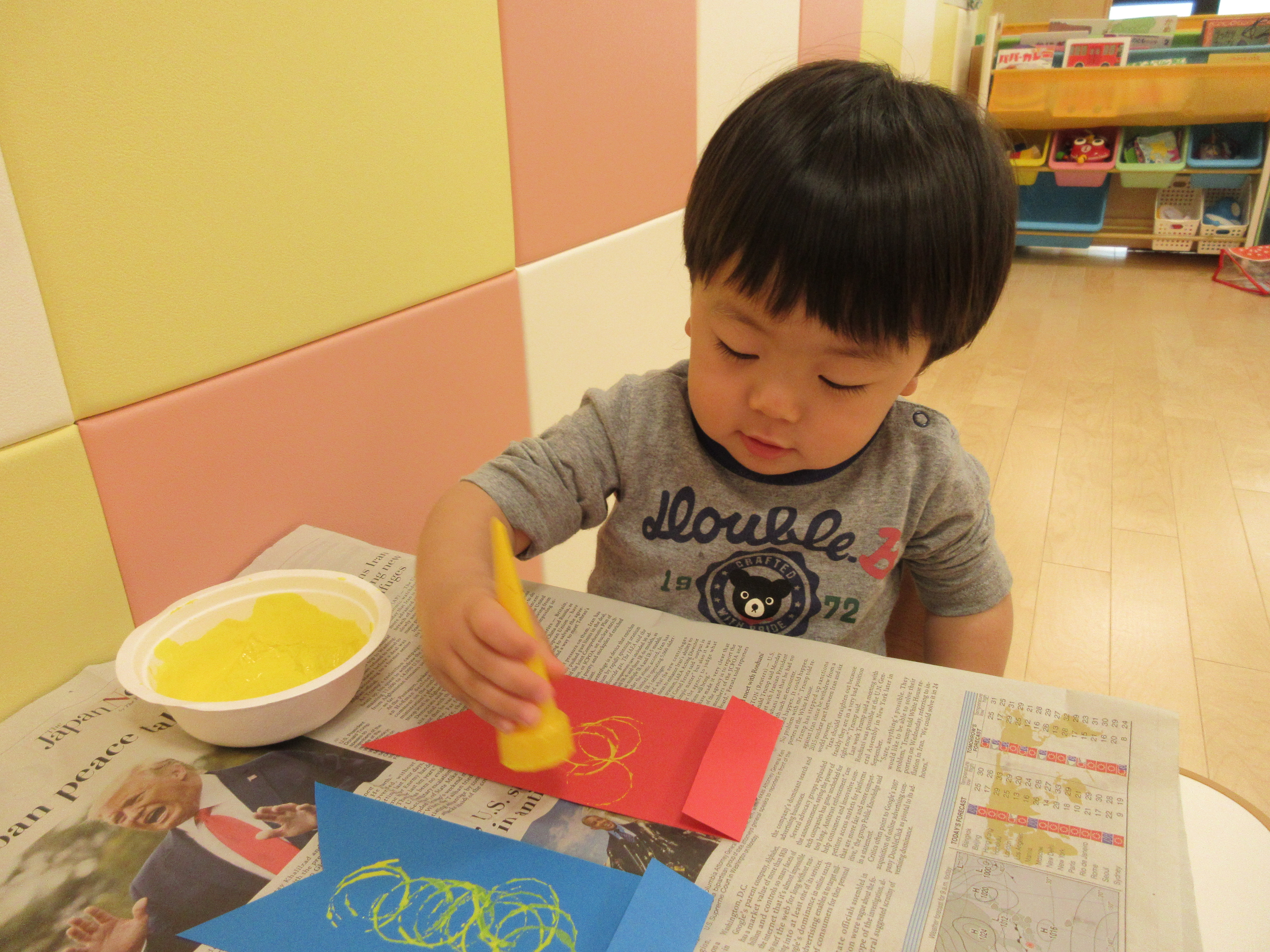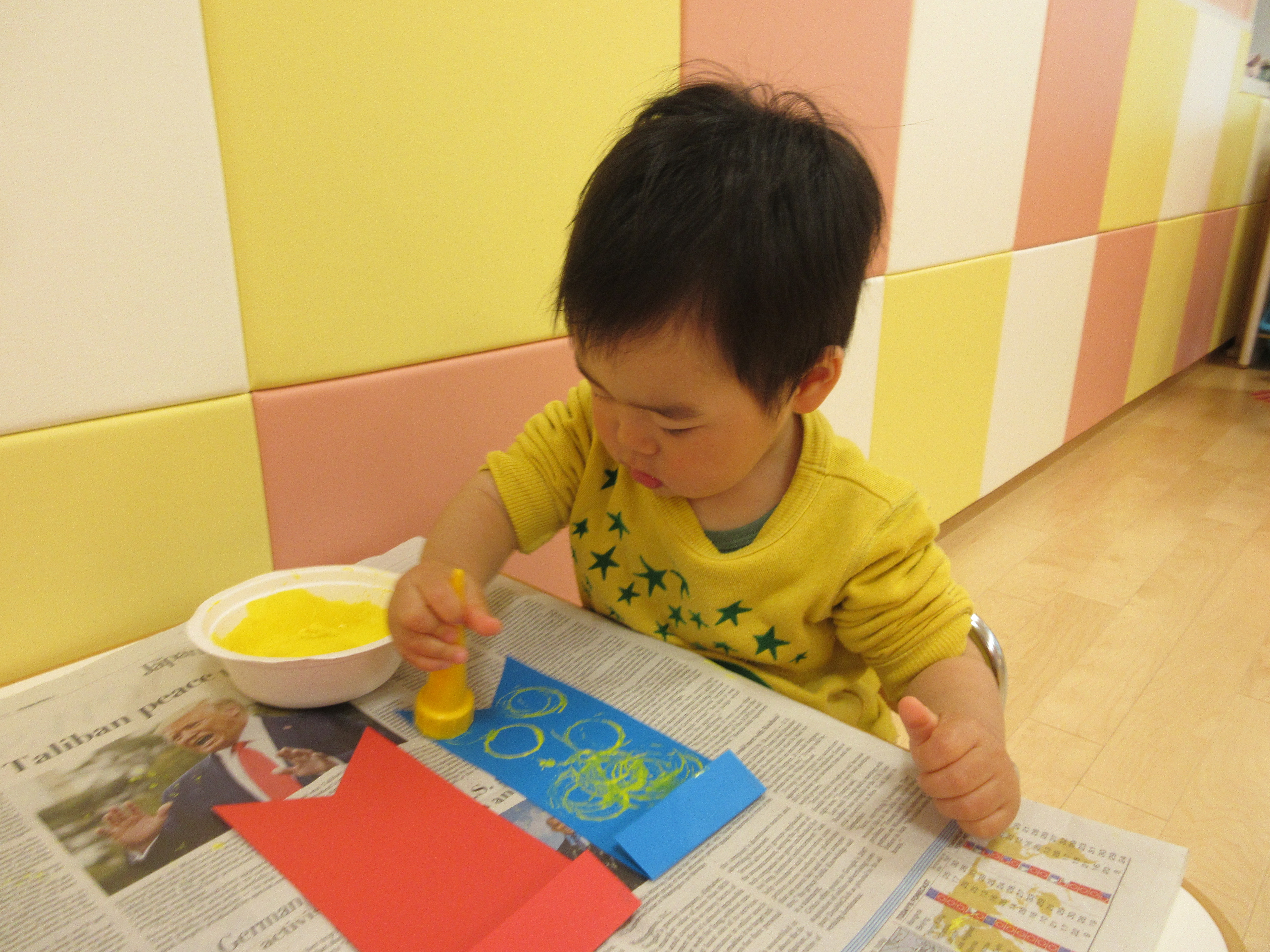 絵の具をつけ、画用紙に押す、という作業もとっても上手ですね![]()