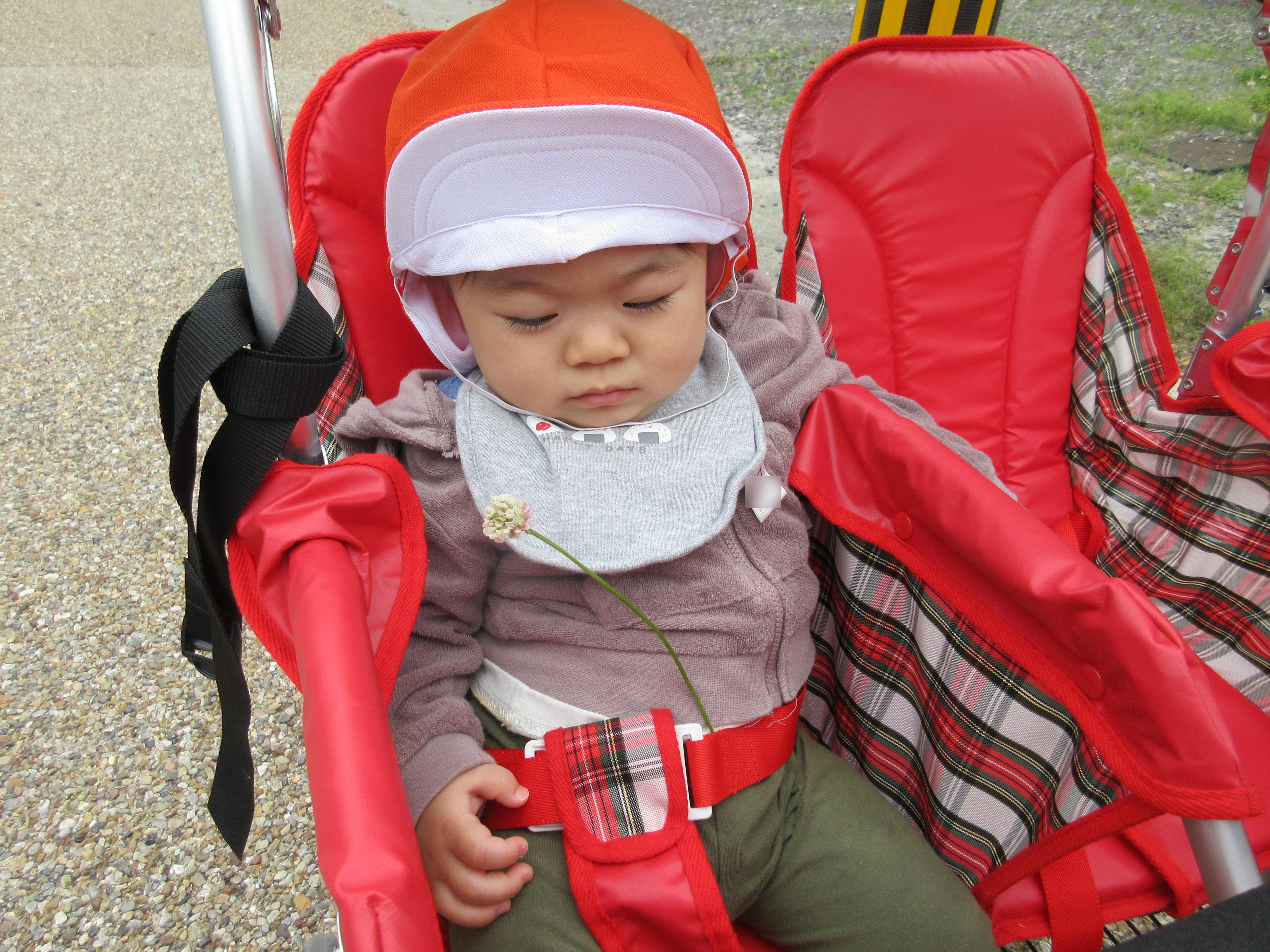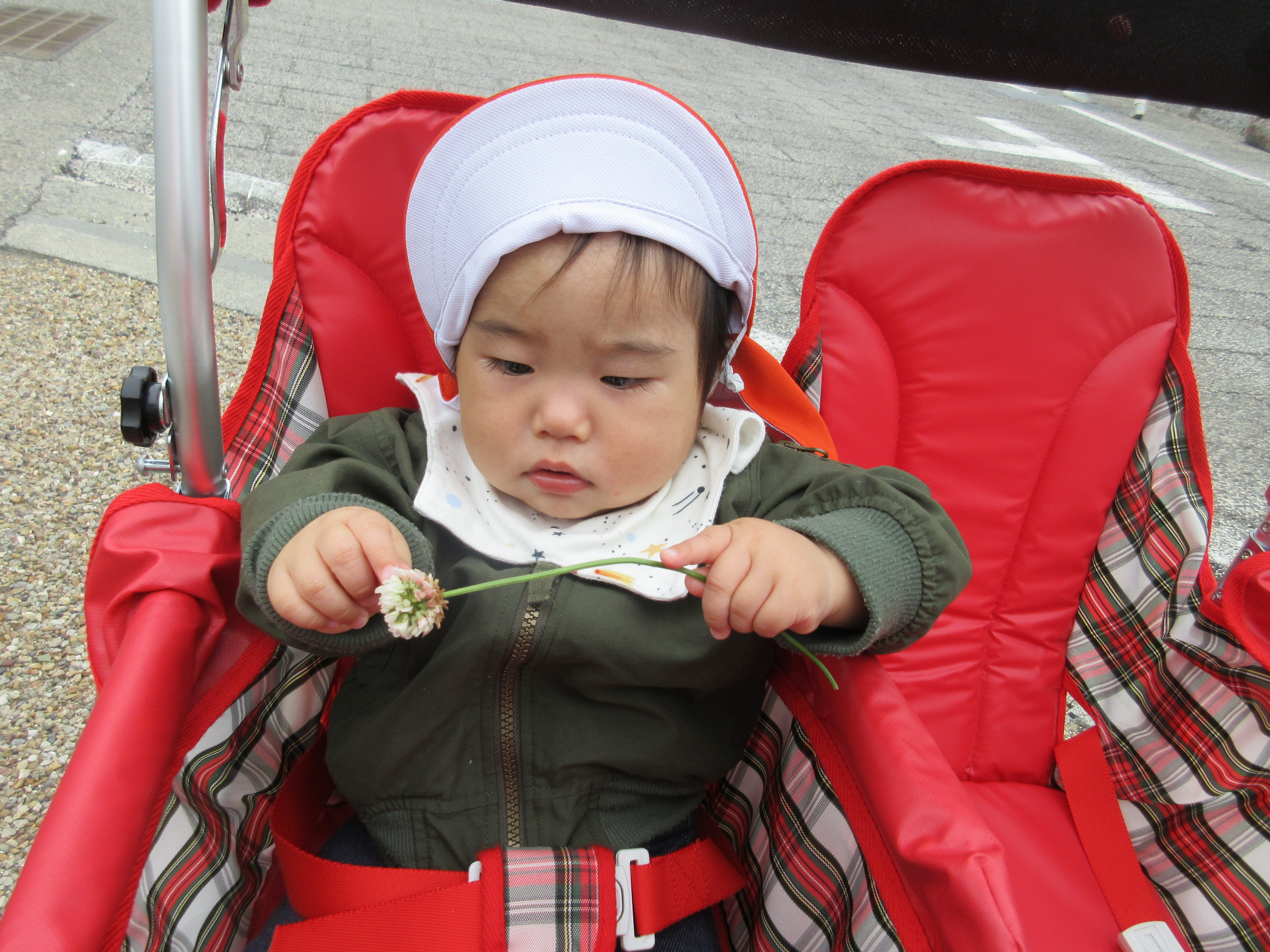 段々慣れてくるとシロツメクサを持ち、触ってみたり、花の部分をちぎって遊んでみたりと思い思いに遊んでいました![]()