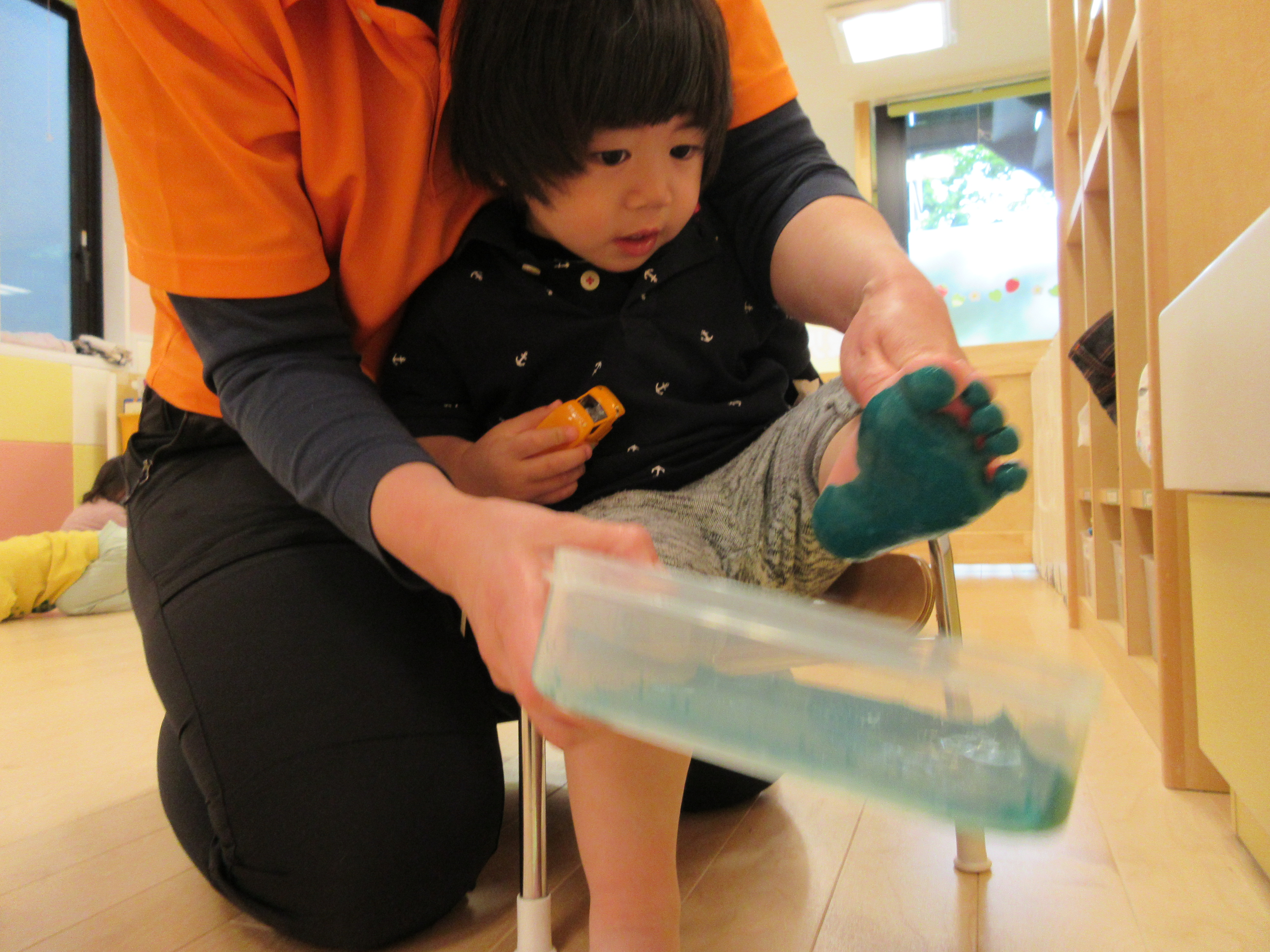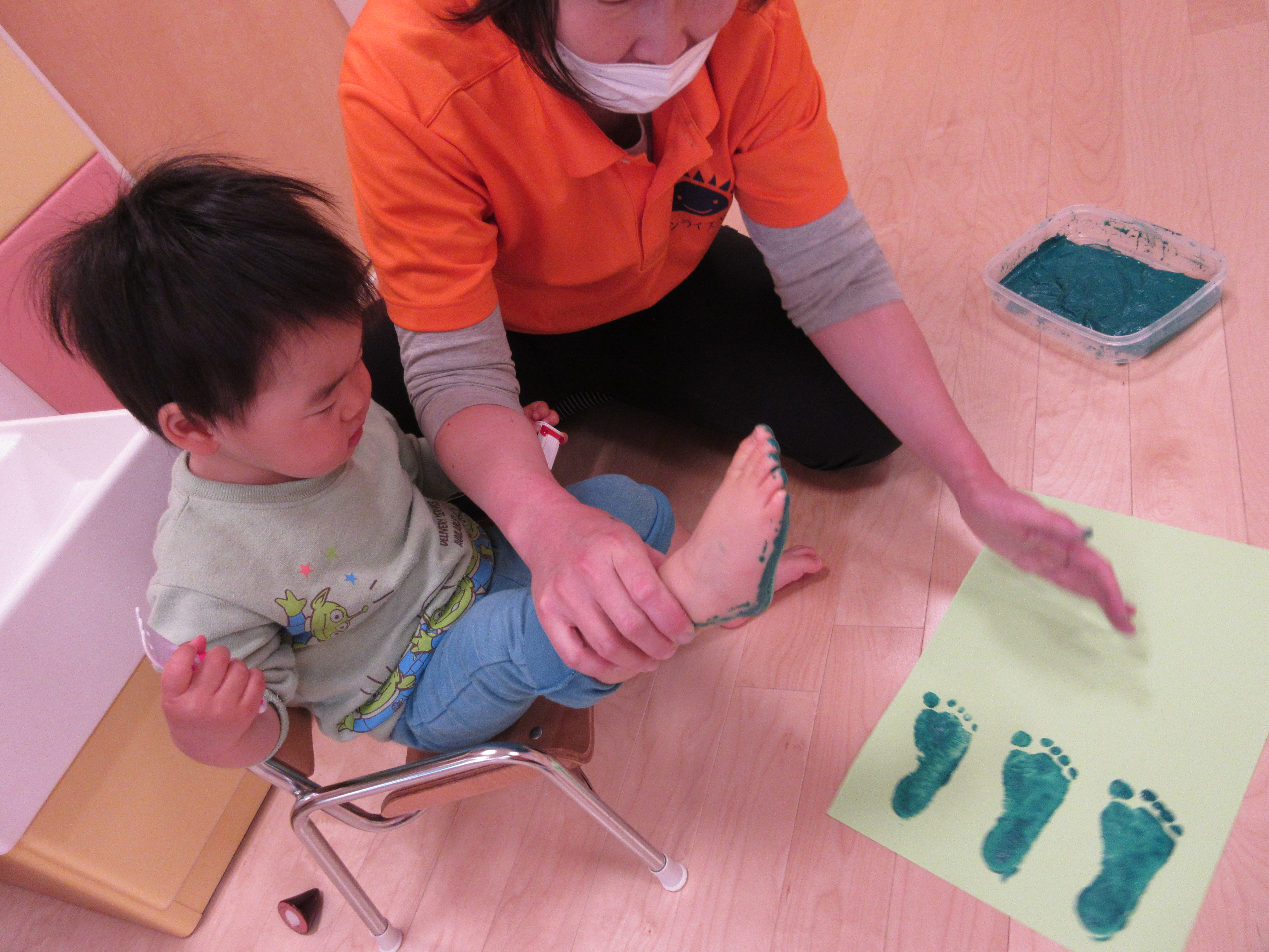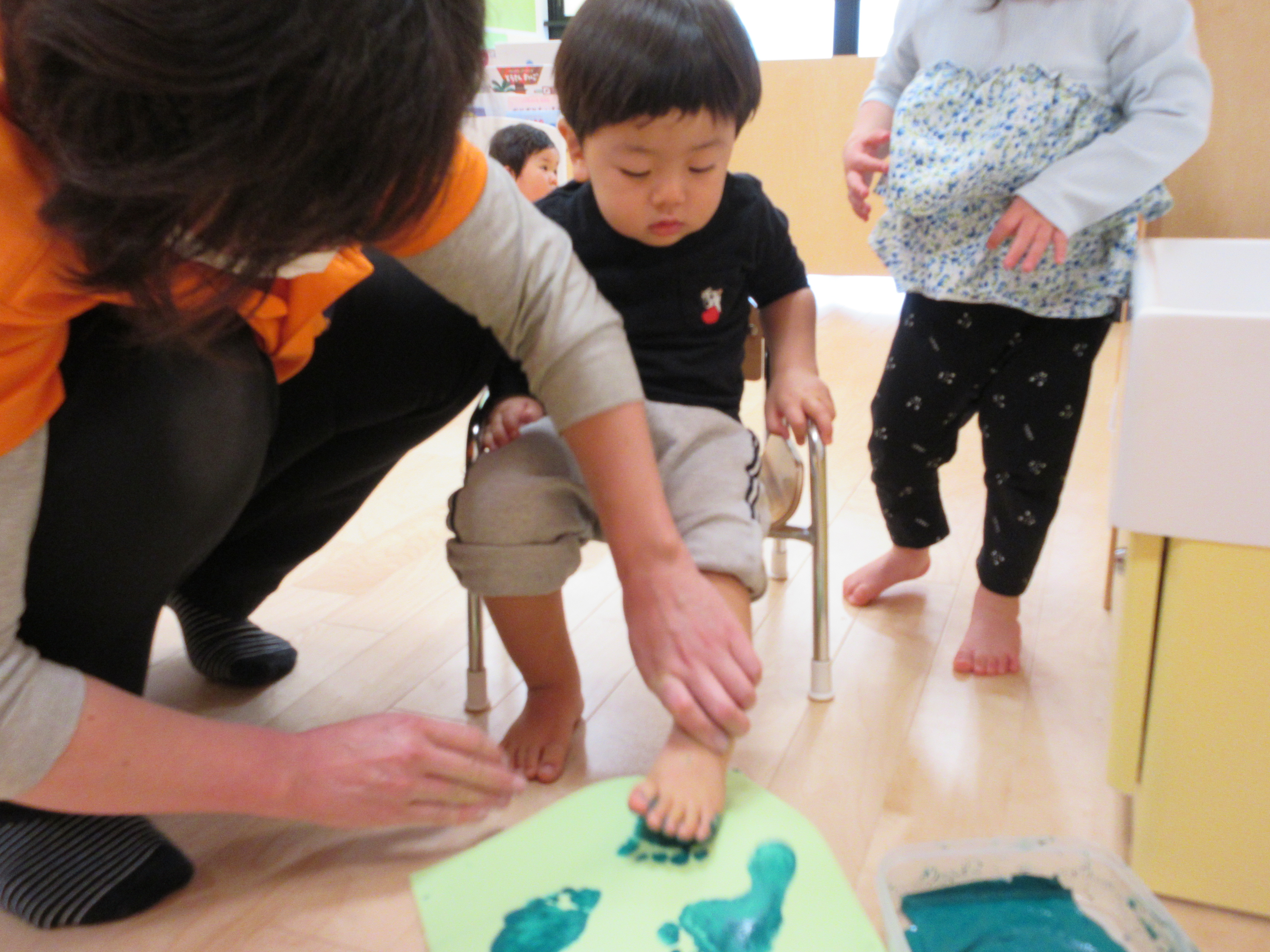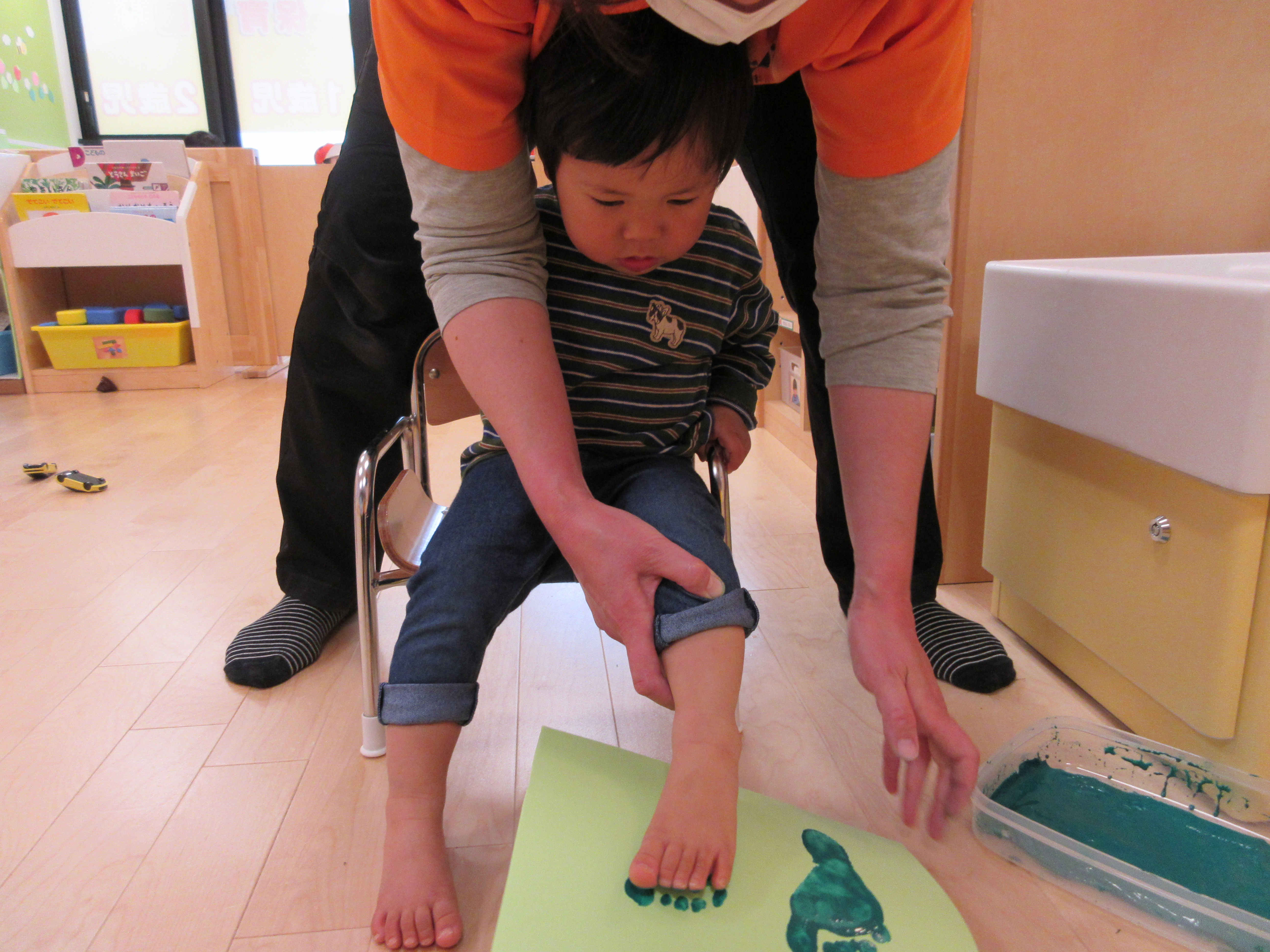 それでも4月に手型をとったこともあってか、少し顔をしかめながらも嫌がらずに画用紙にペタッと足型をおしてくれました![]()