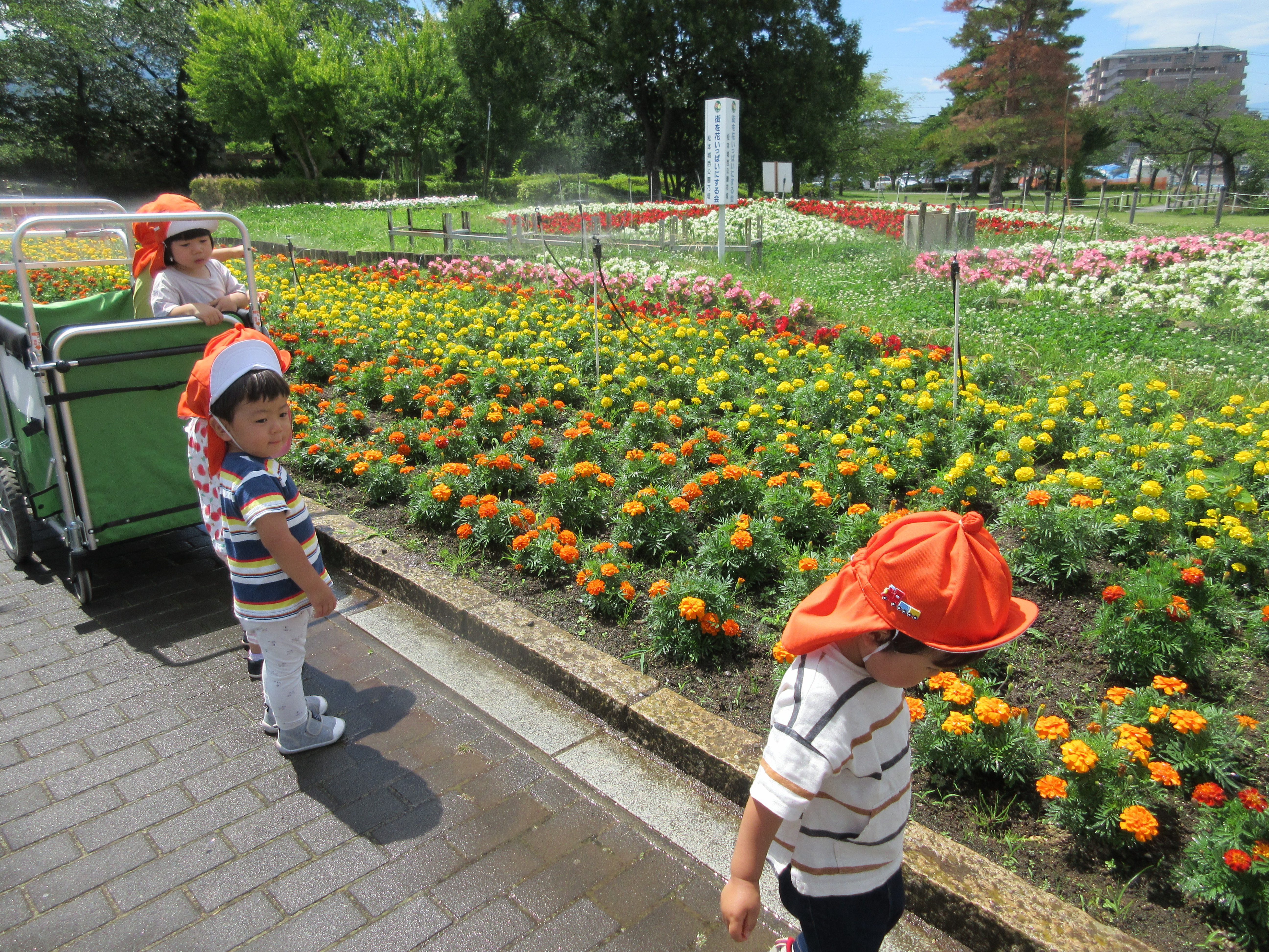 公園の横にある大きな花壇にあるスプリンクラーが少し歩道の方まで届いていてその水をミストのように浴びるのを楽しんでいました![]()