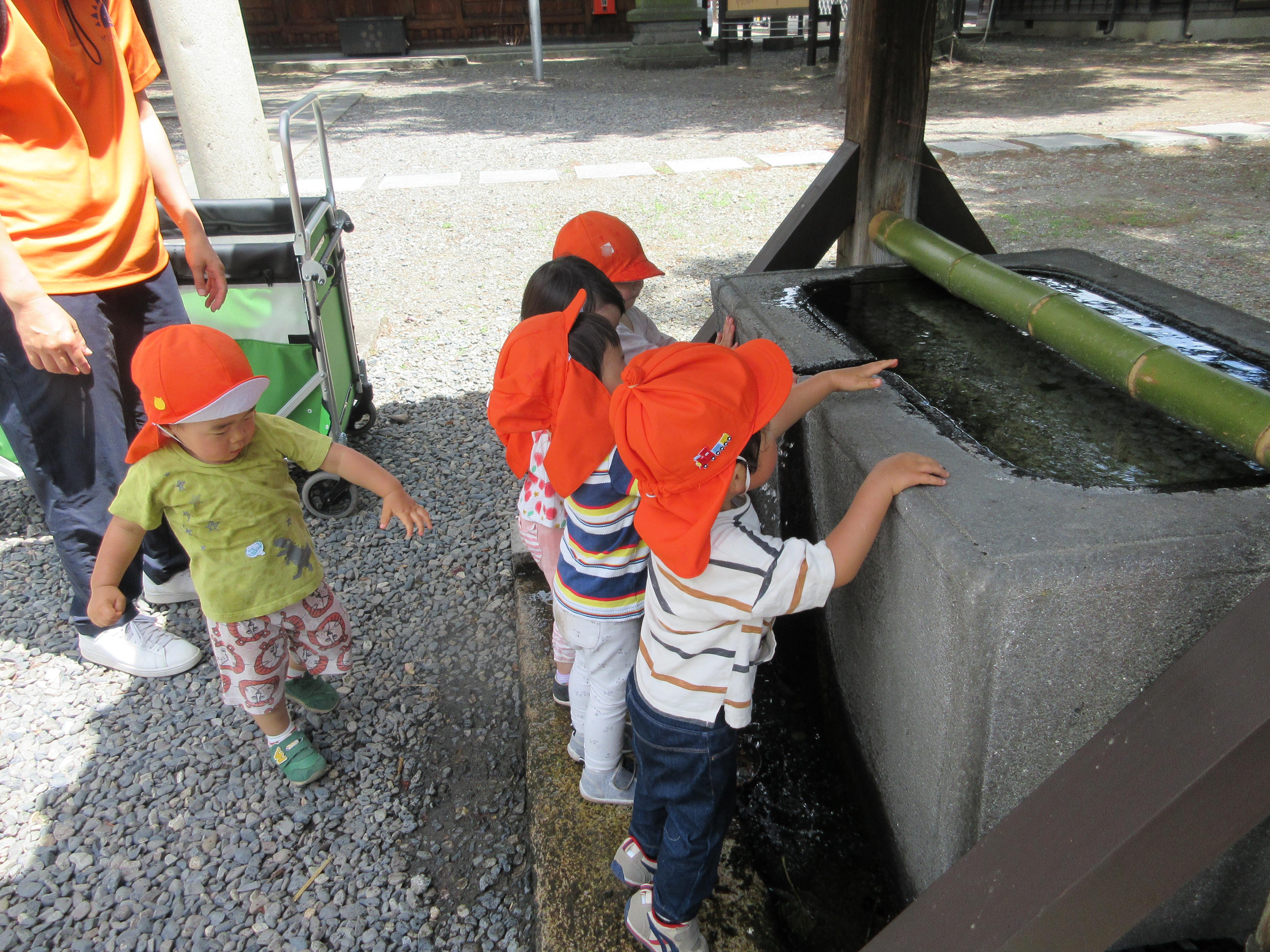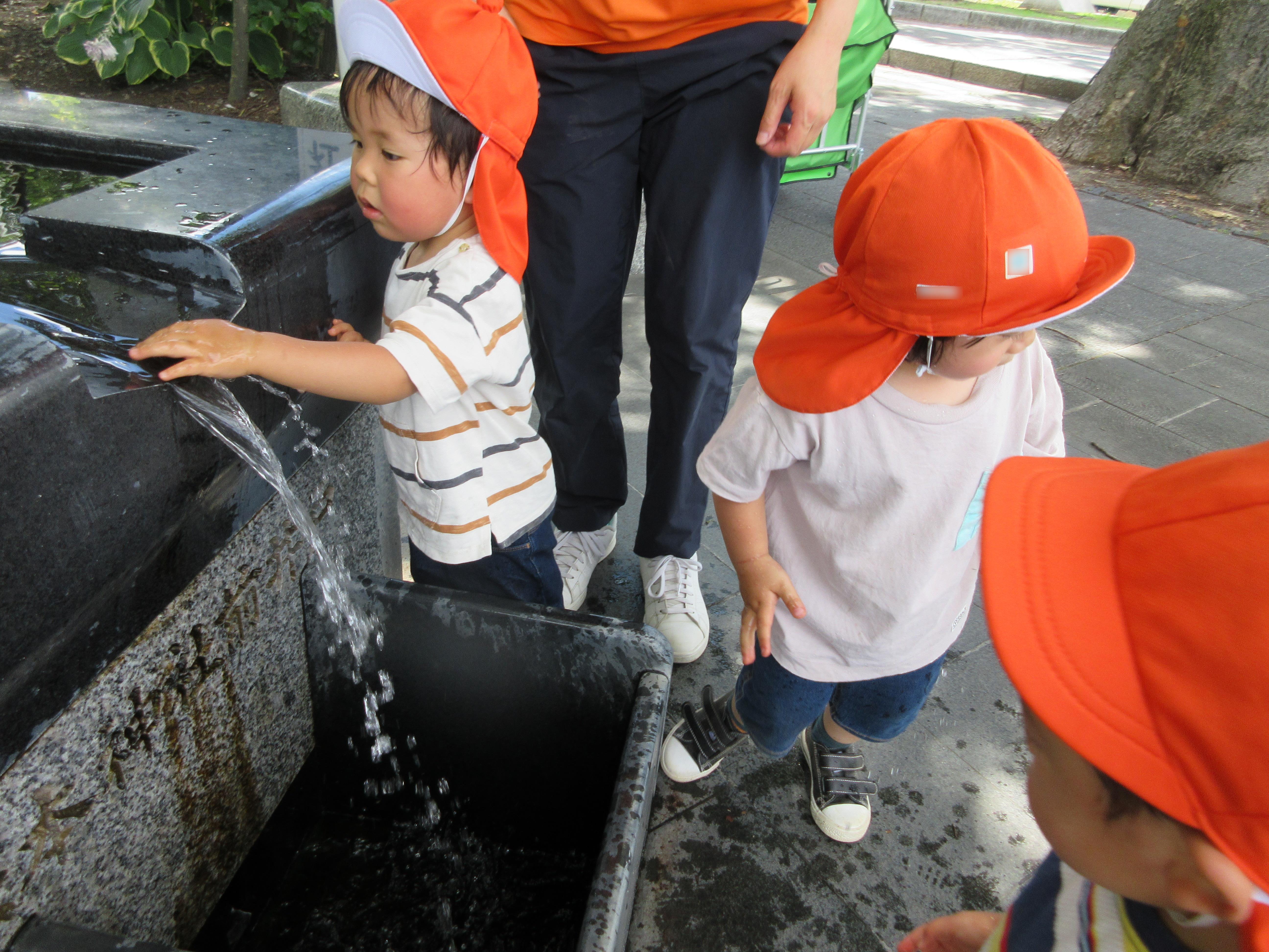 公園の日陰で遊んだ後は松本神社の湧き水を触って楽しみました![]()