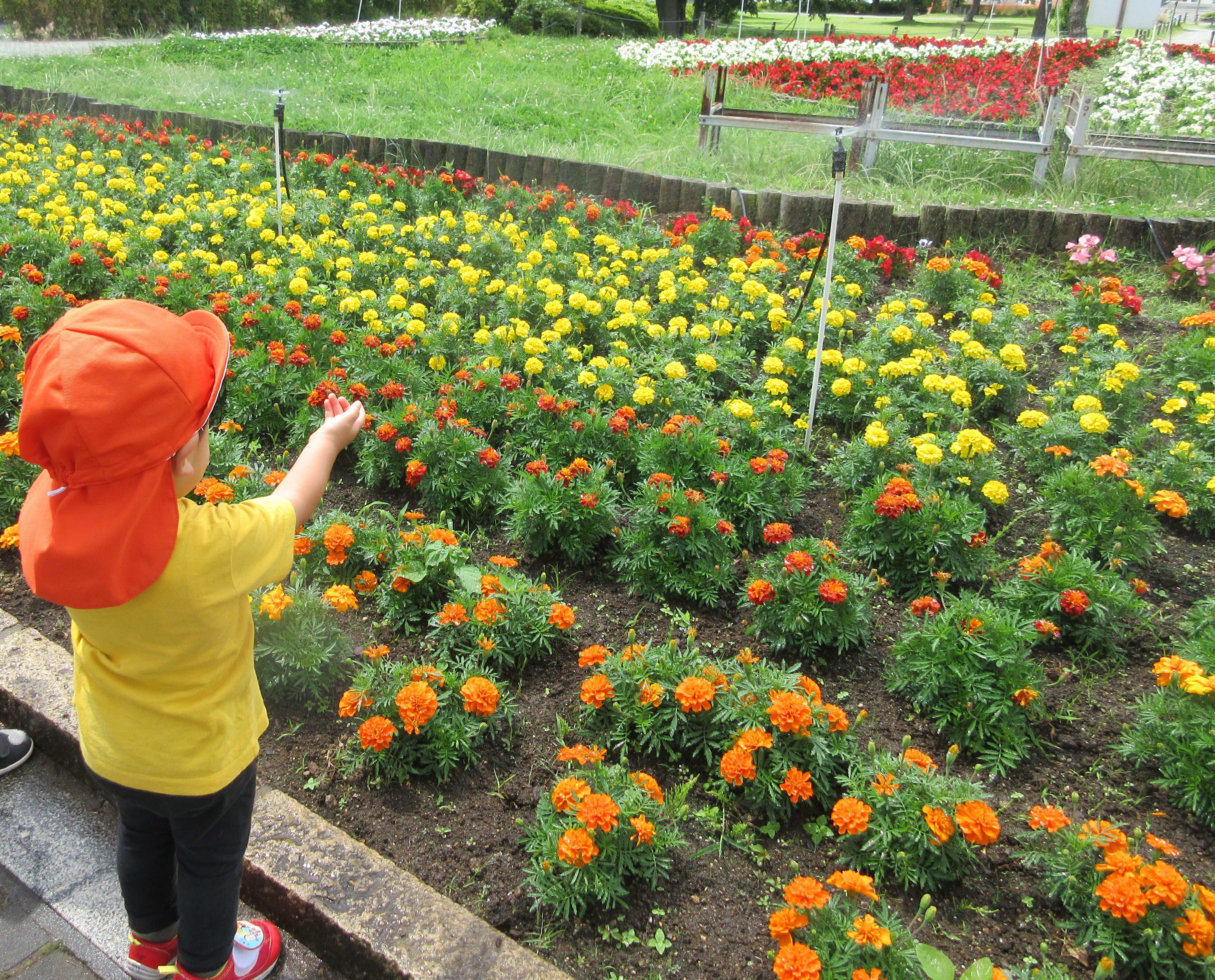公園の横にある大きな花壇にあるスプリンクラーが少し歩道の方まで届いていてその水をミストのように浴びるのを楽しんでいました![]()