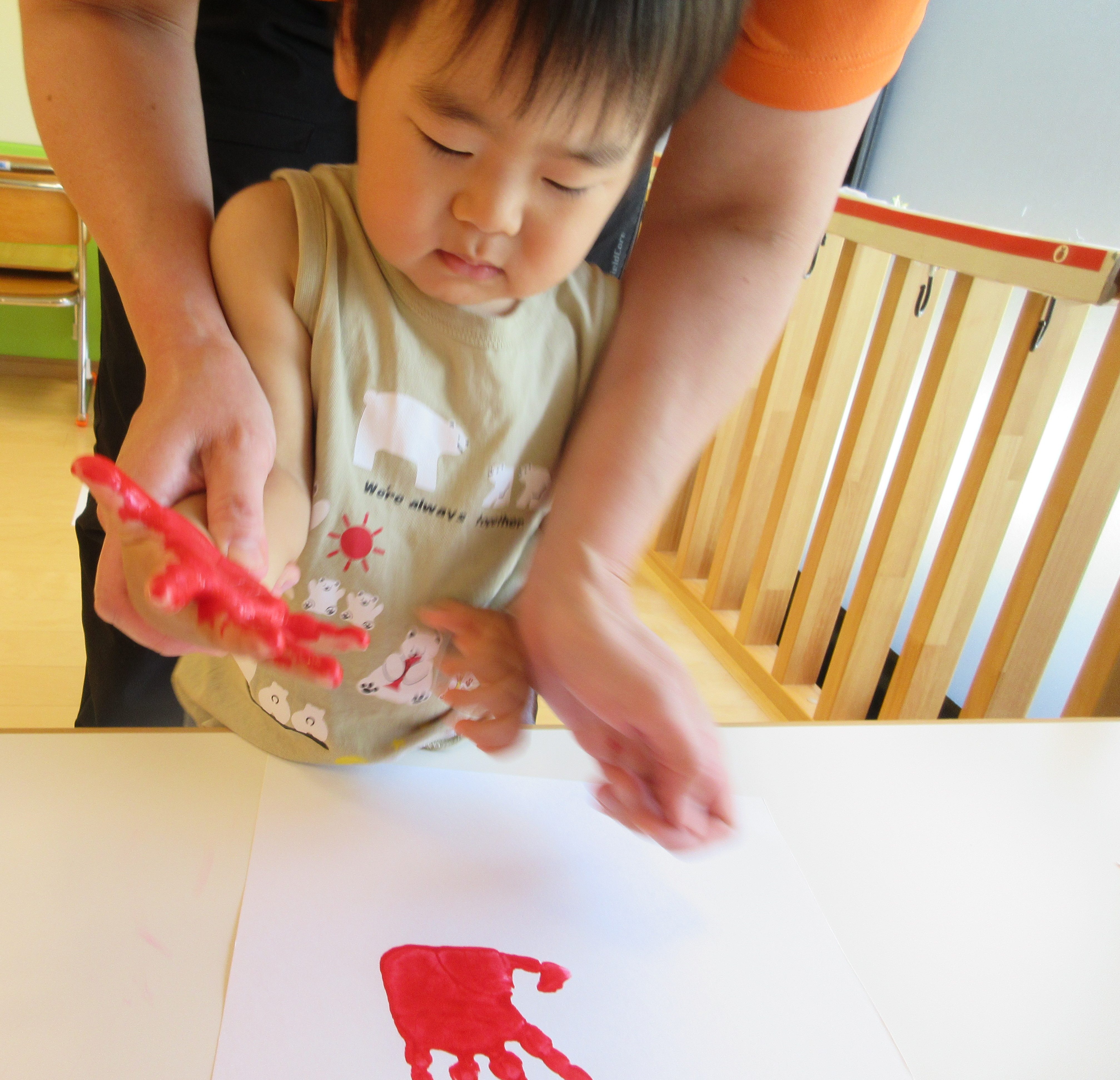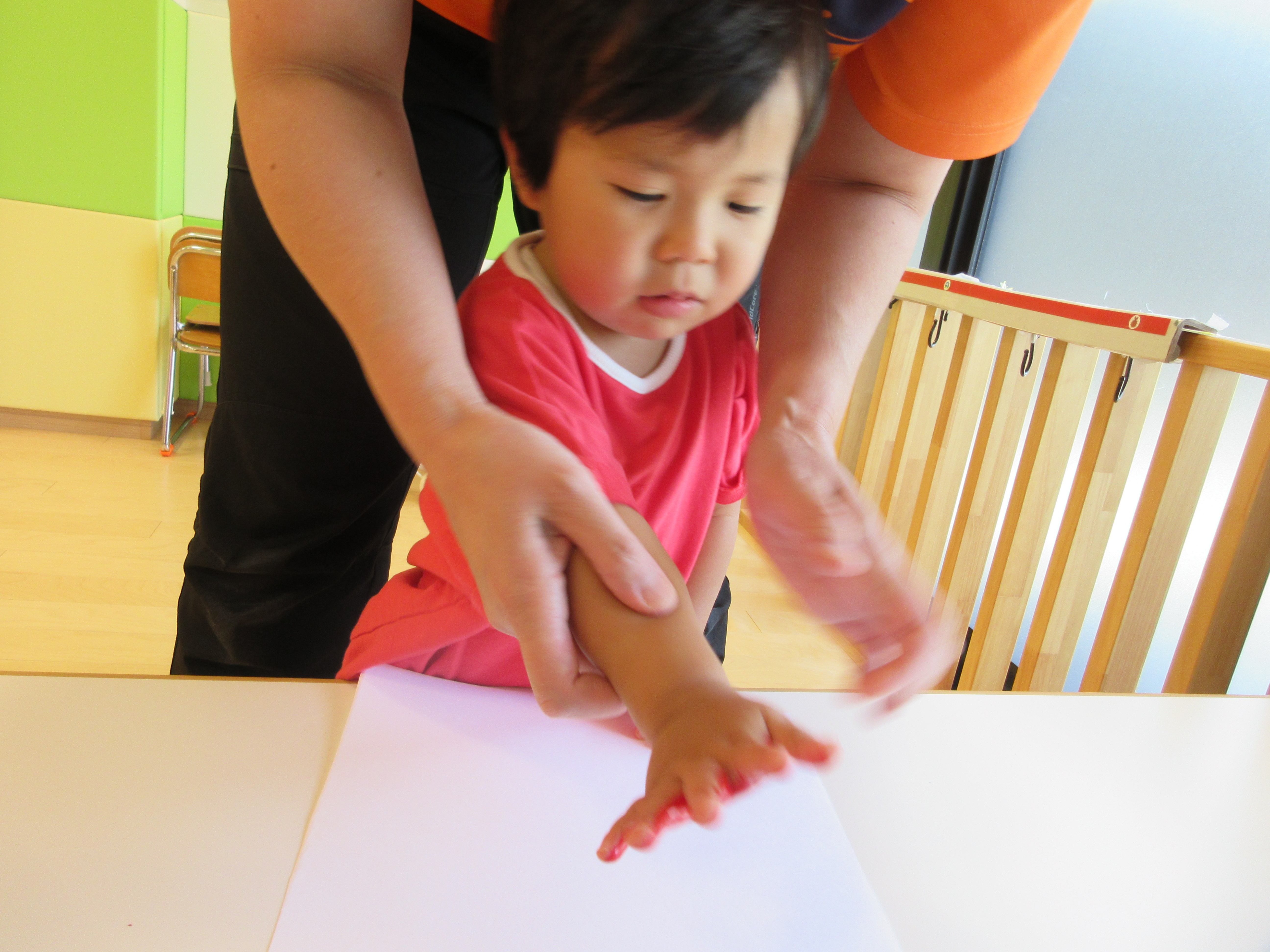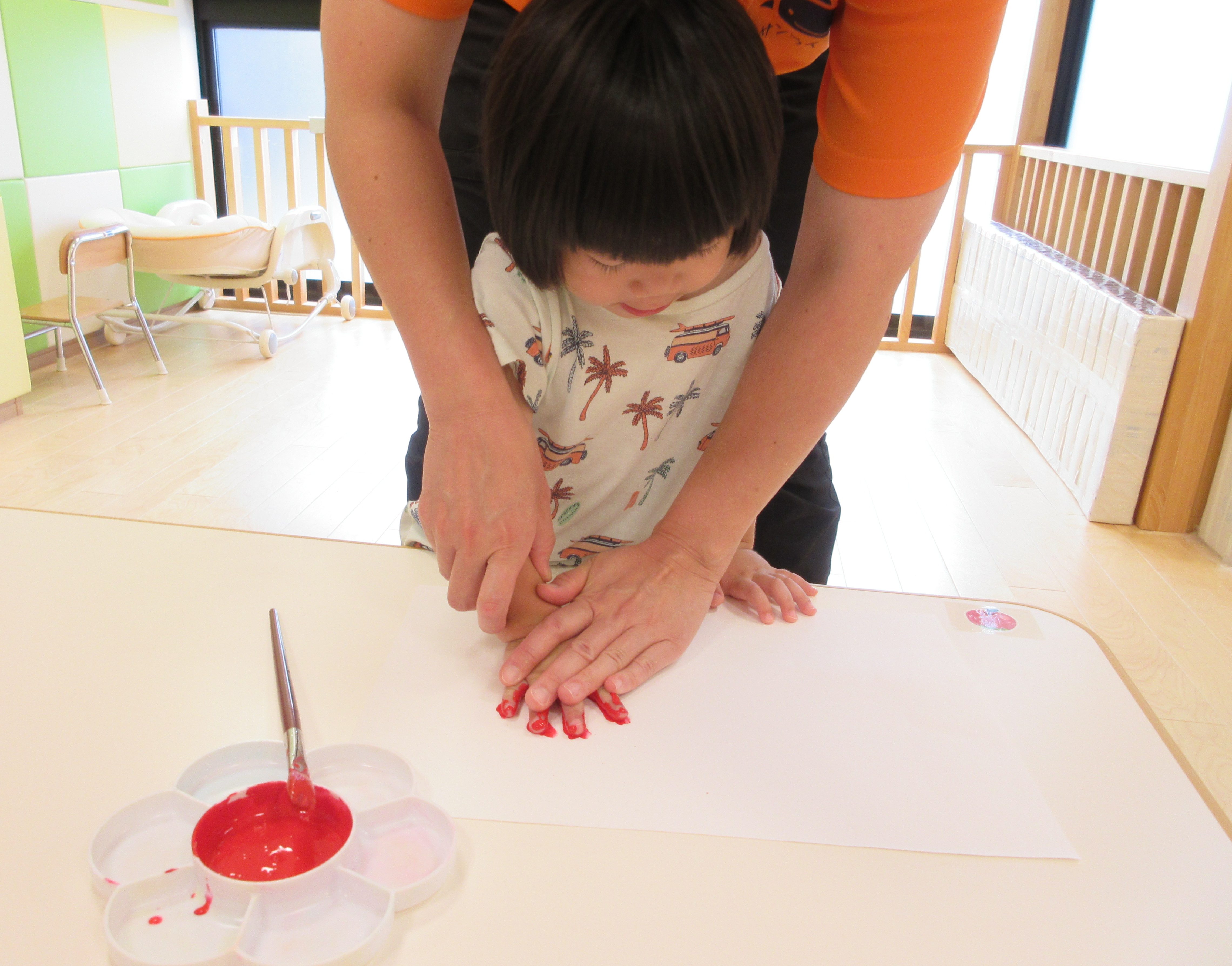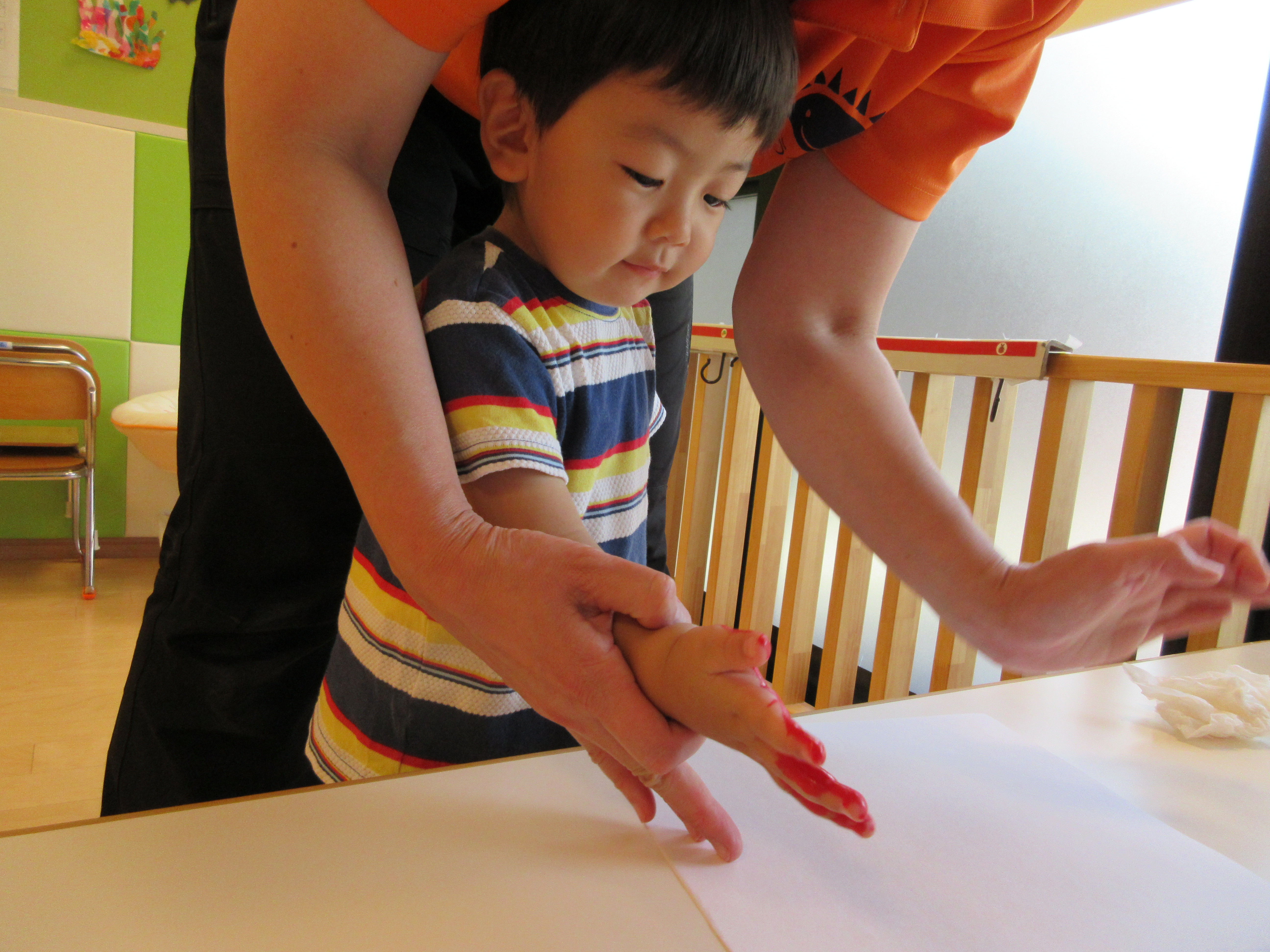 赤い絵の具を筆で手のひらにぬっていくので、しかめてちょっと嫌そうな顔をしている子たちもいましたが、気持ち悪い・・・という感じなのかな?