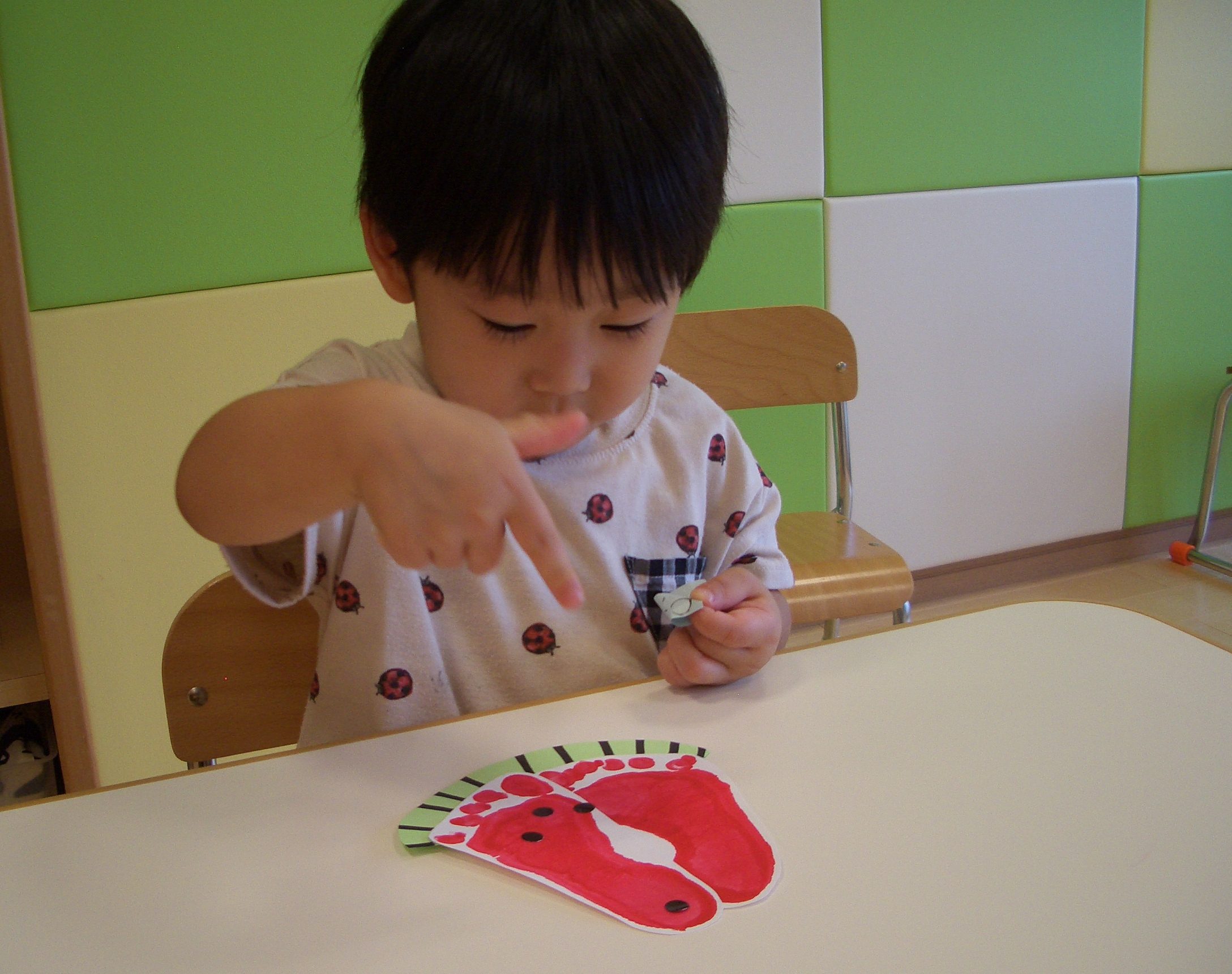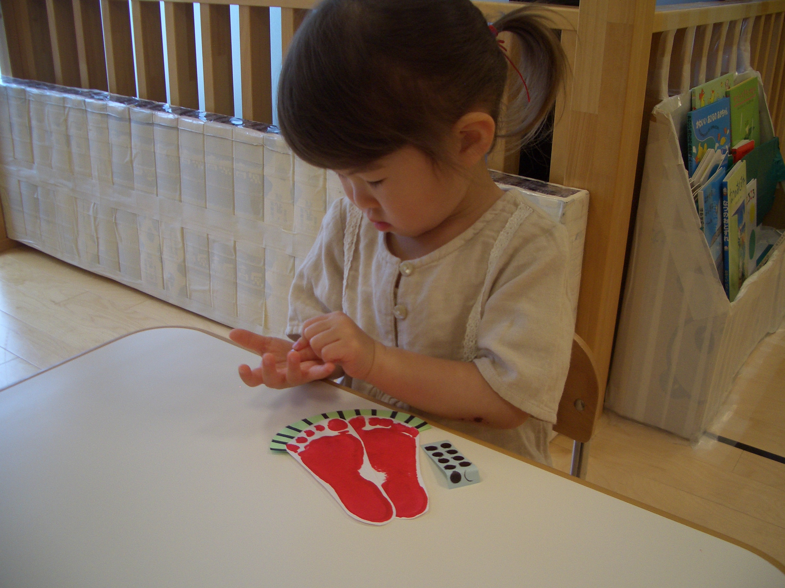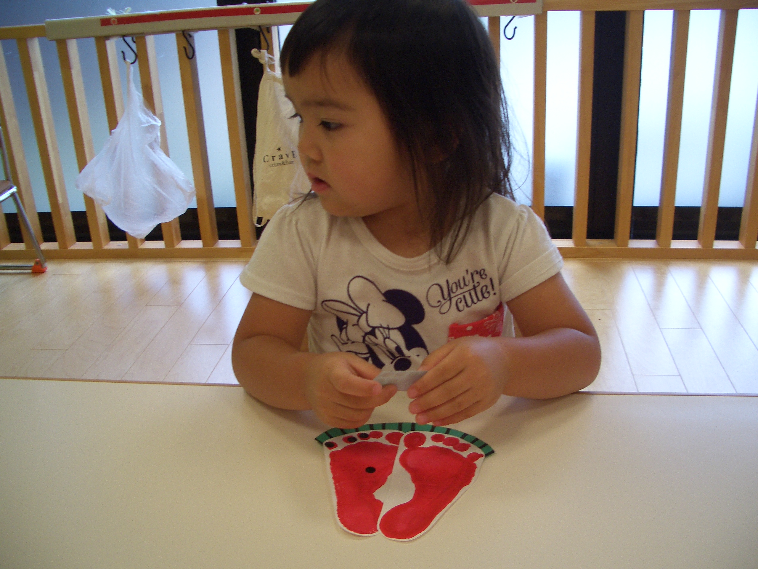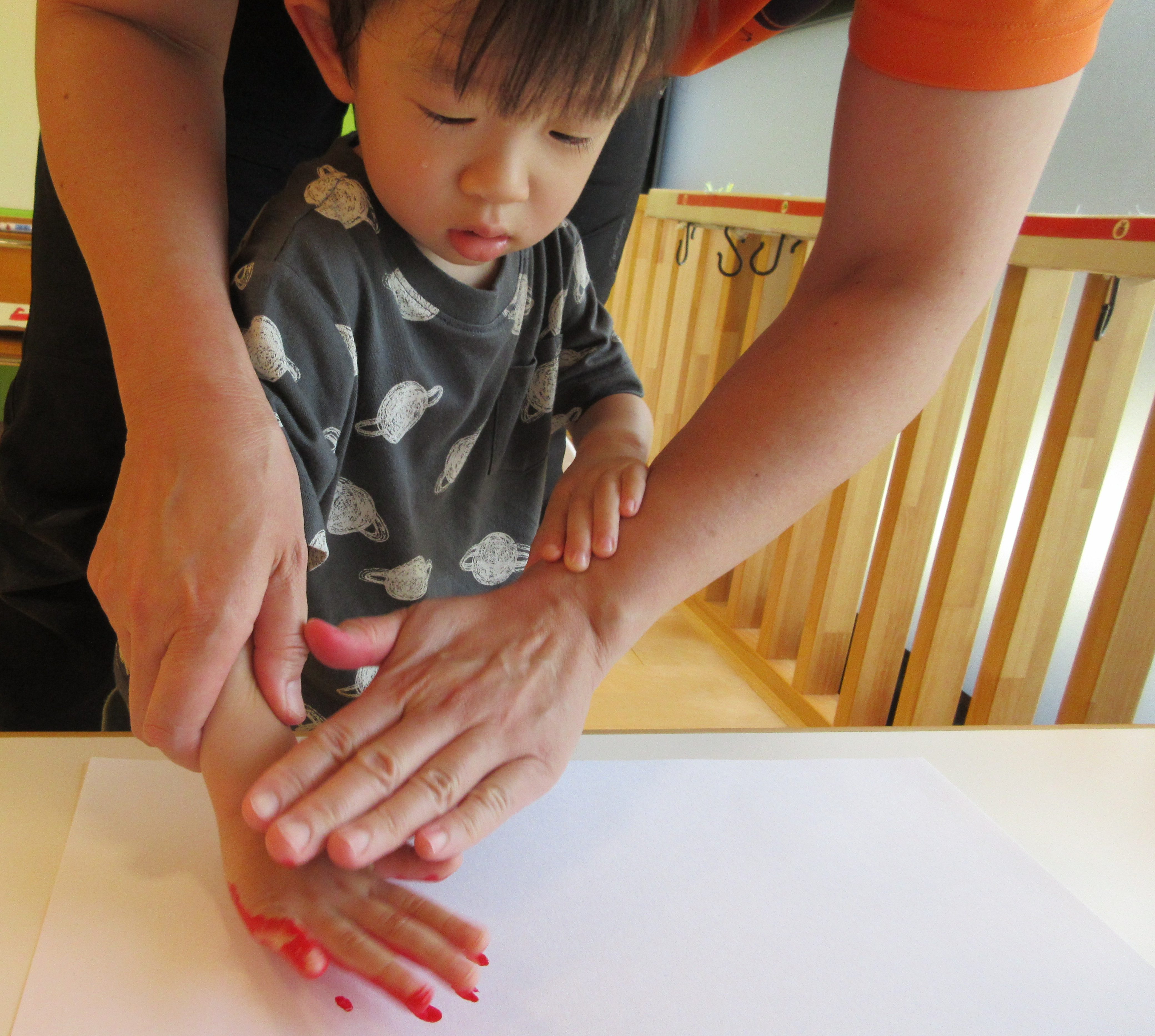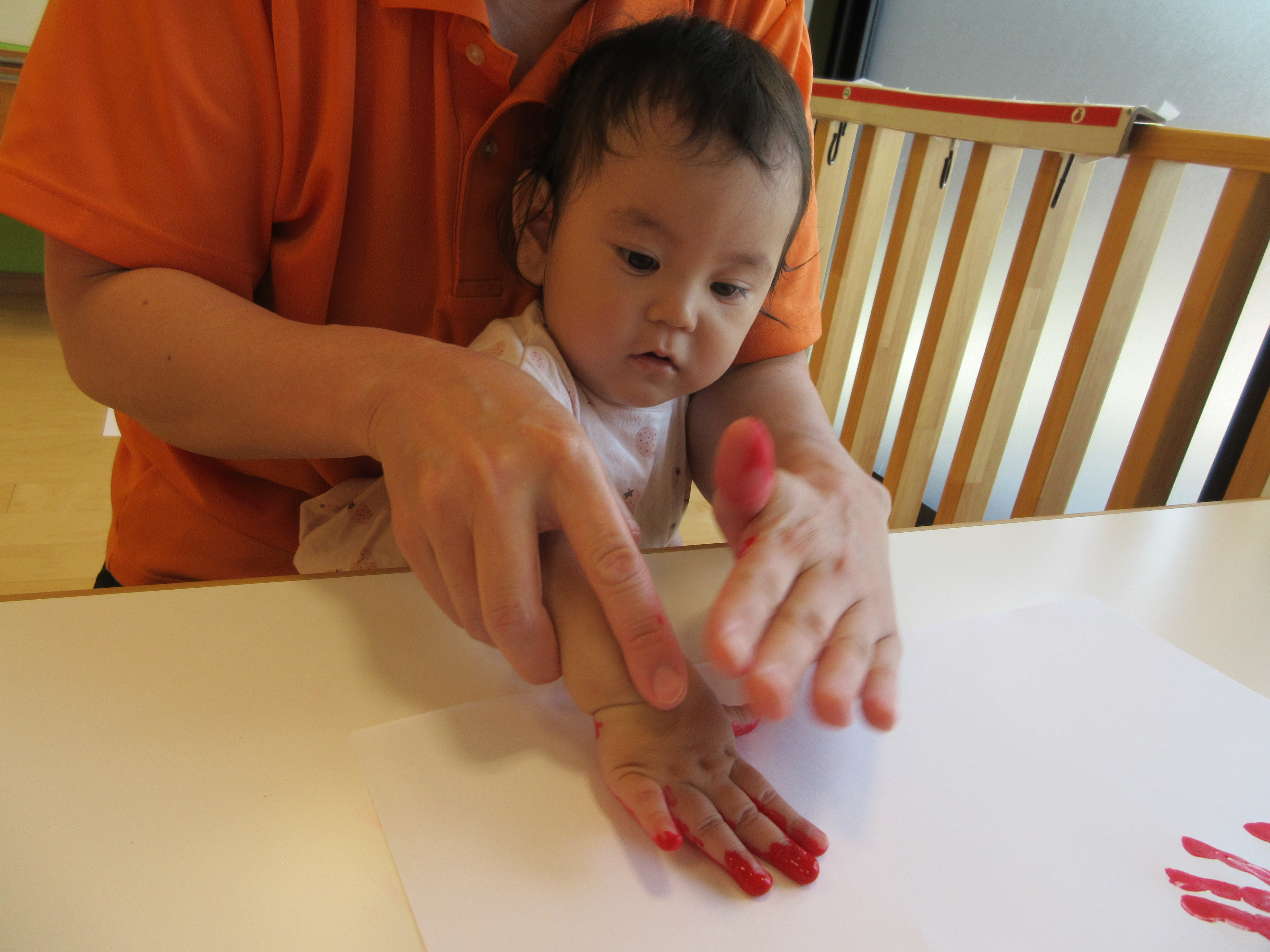 赤い絵の具を筆で手のひらにぬっていくので、しかめてちょっと嫌そうな顔をしている子たちもいましたが、気持ち悪い・・・という感じなのかな?
