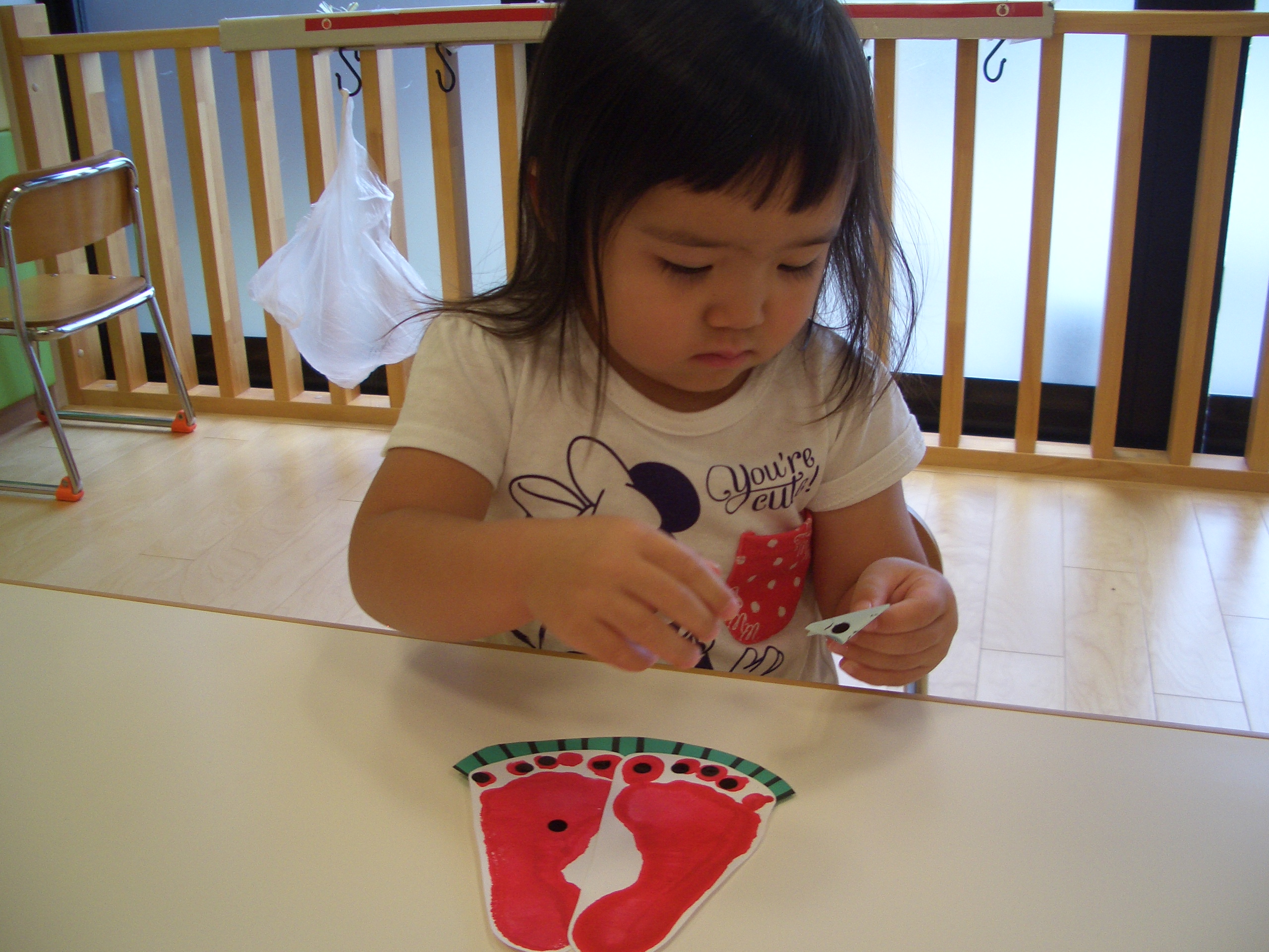 スイカは自分の足型に黒い丸シール(種)を貼ってもらいました。