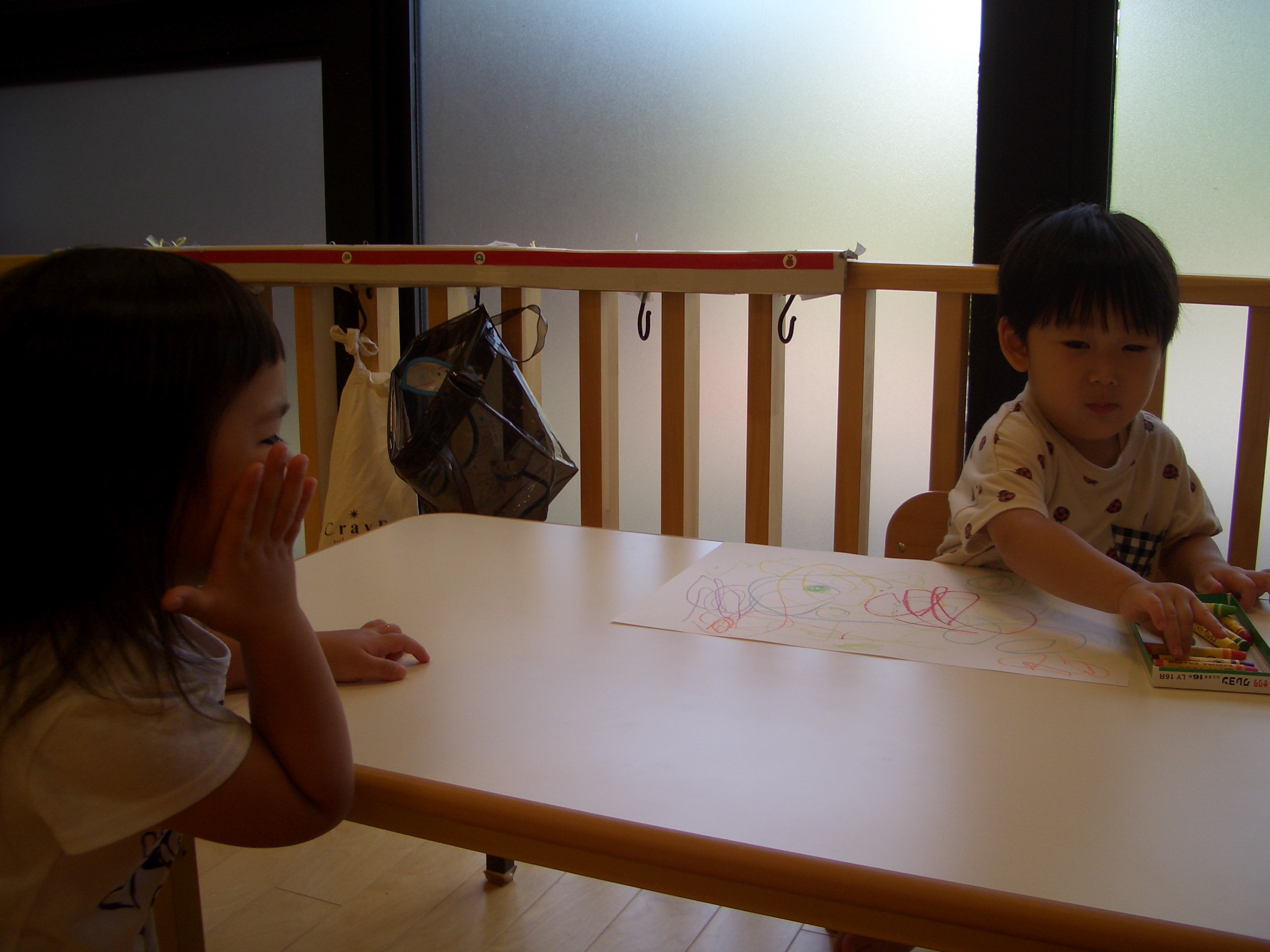 新しく入ってきたお友だちの中に絵の具はイヤ・・・とする子はいないかな?と思いましたが、2人とも嫌がることなく上手に行うことができました![]()