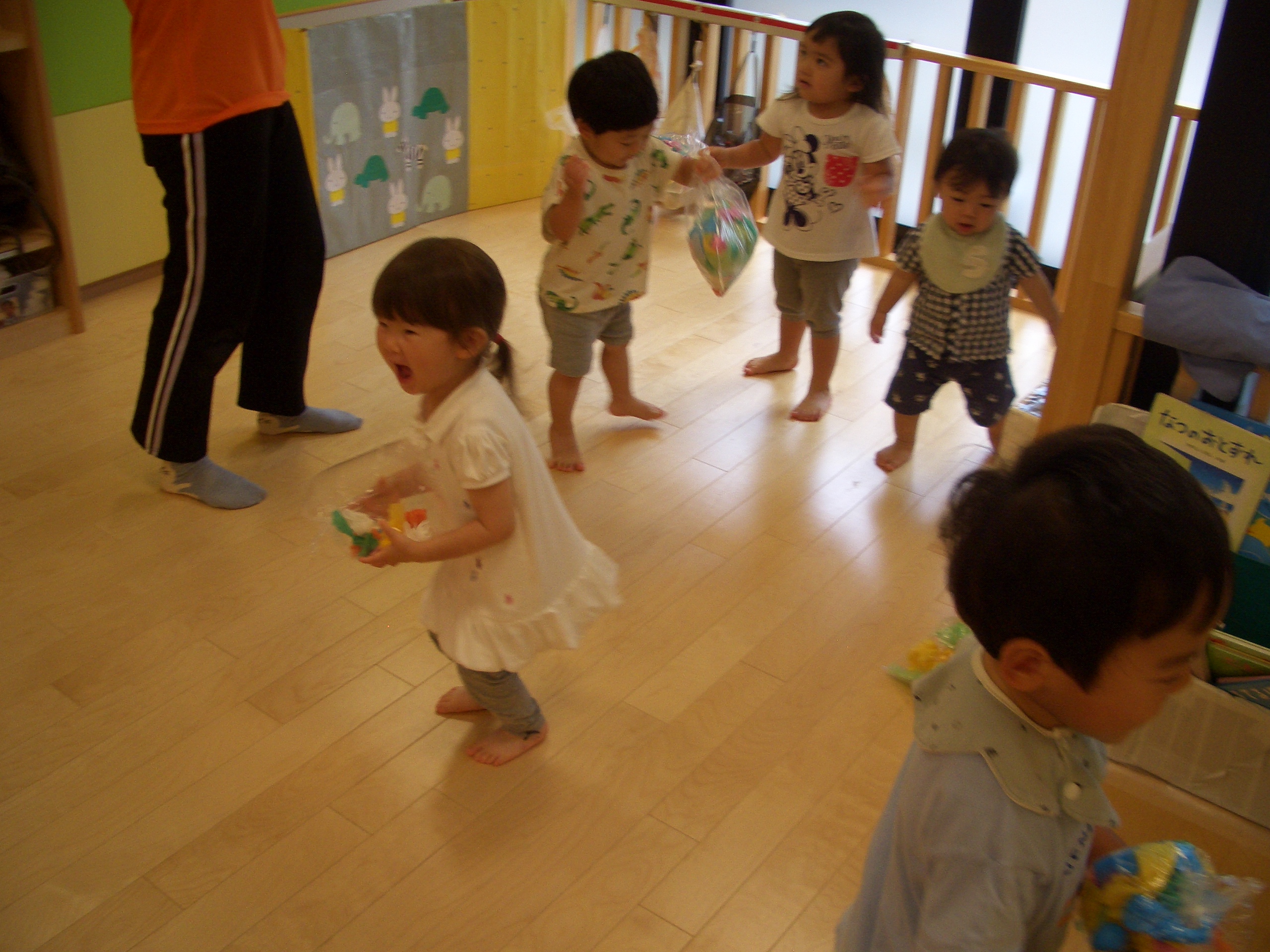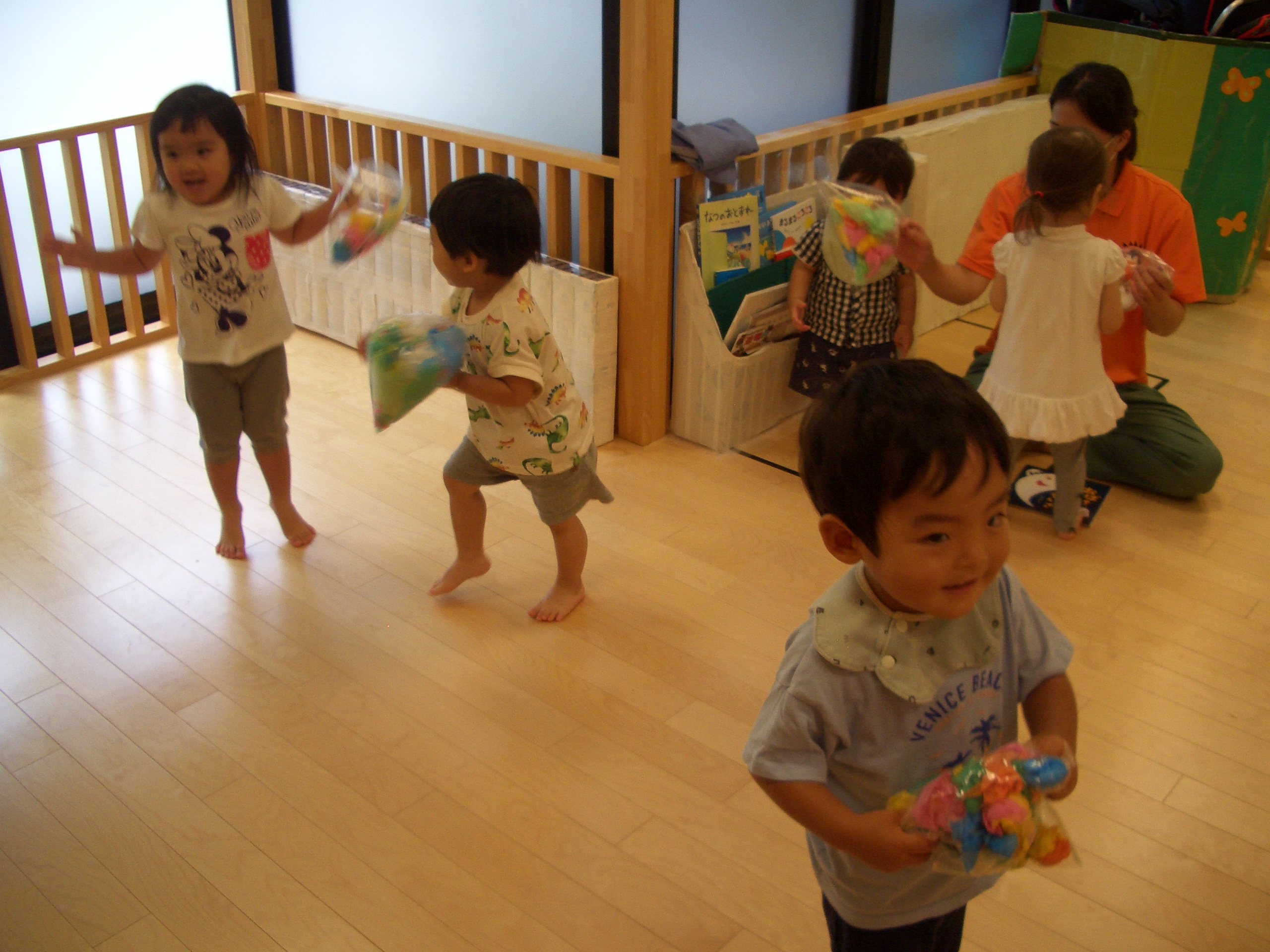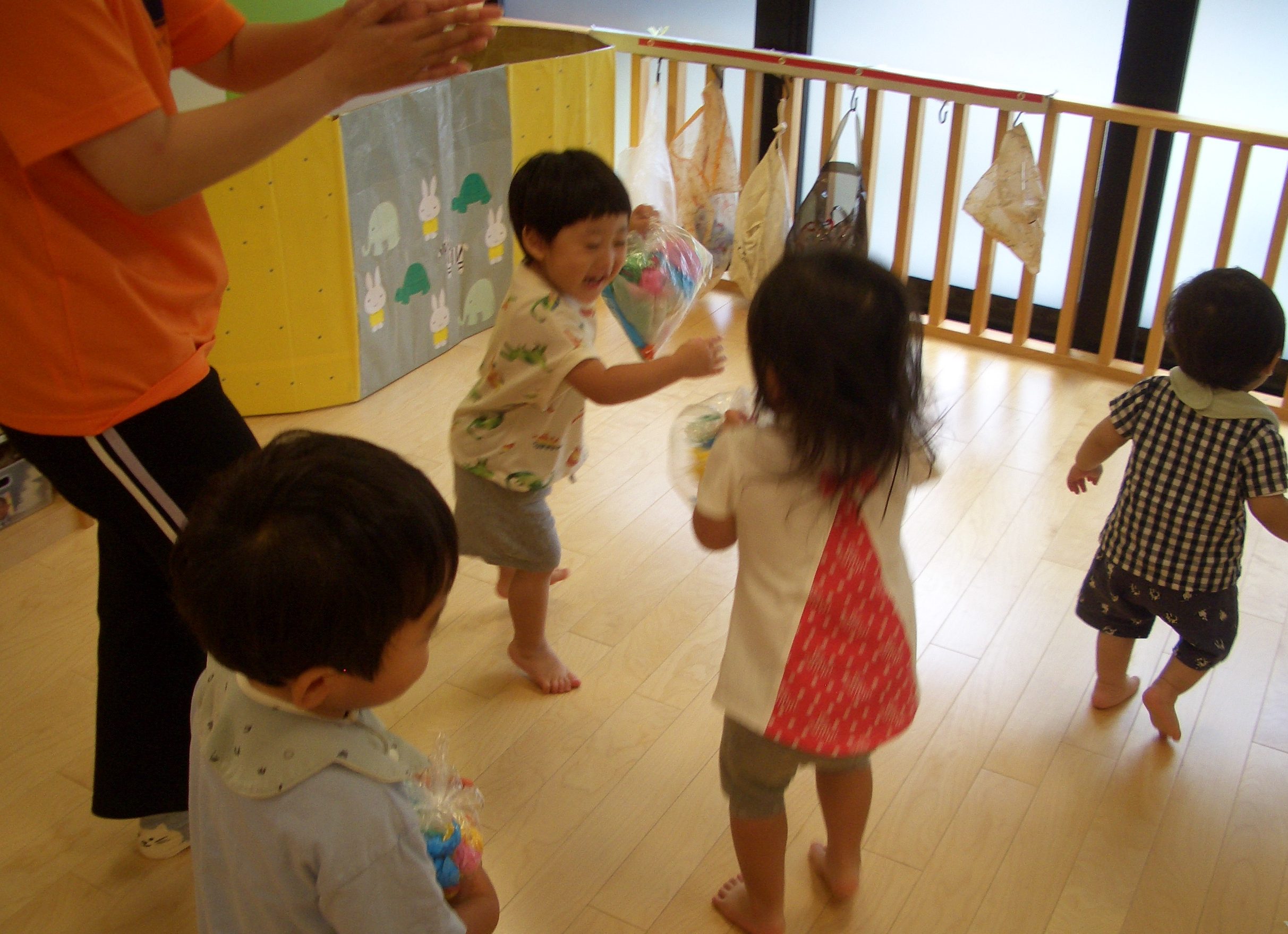 袋を叩いてみたり、振ってみたりと思い思いに踊るりんごぐみさんたちでした。