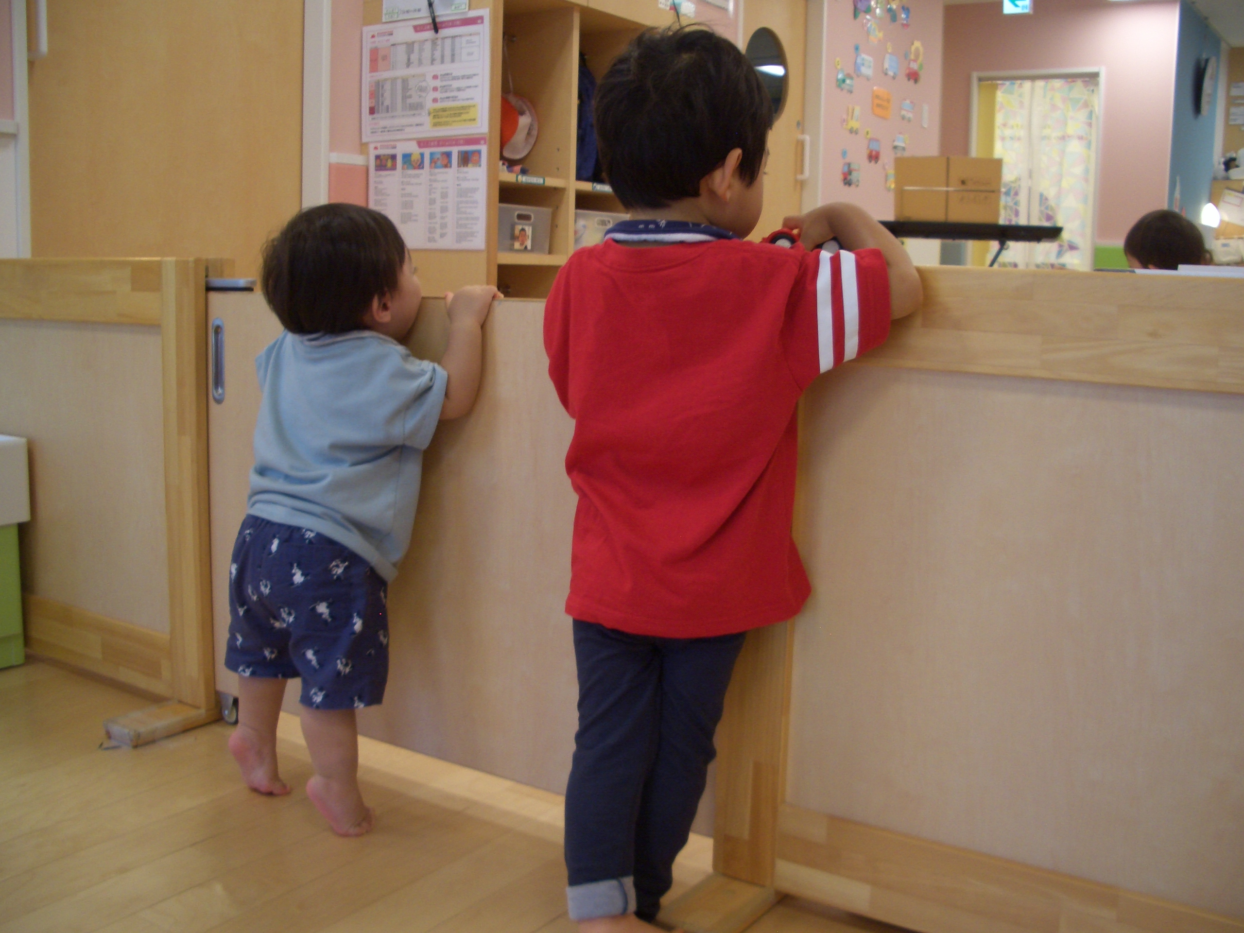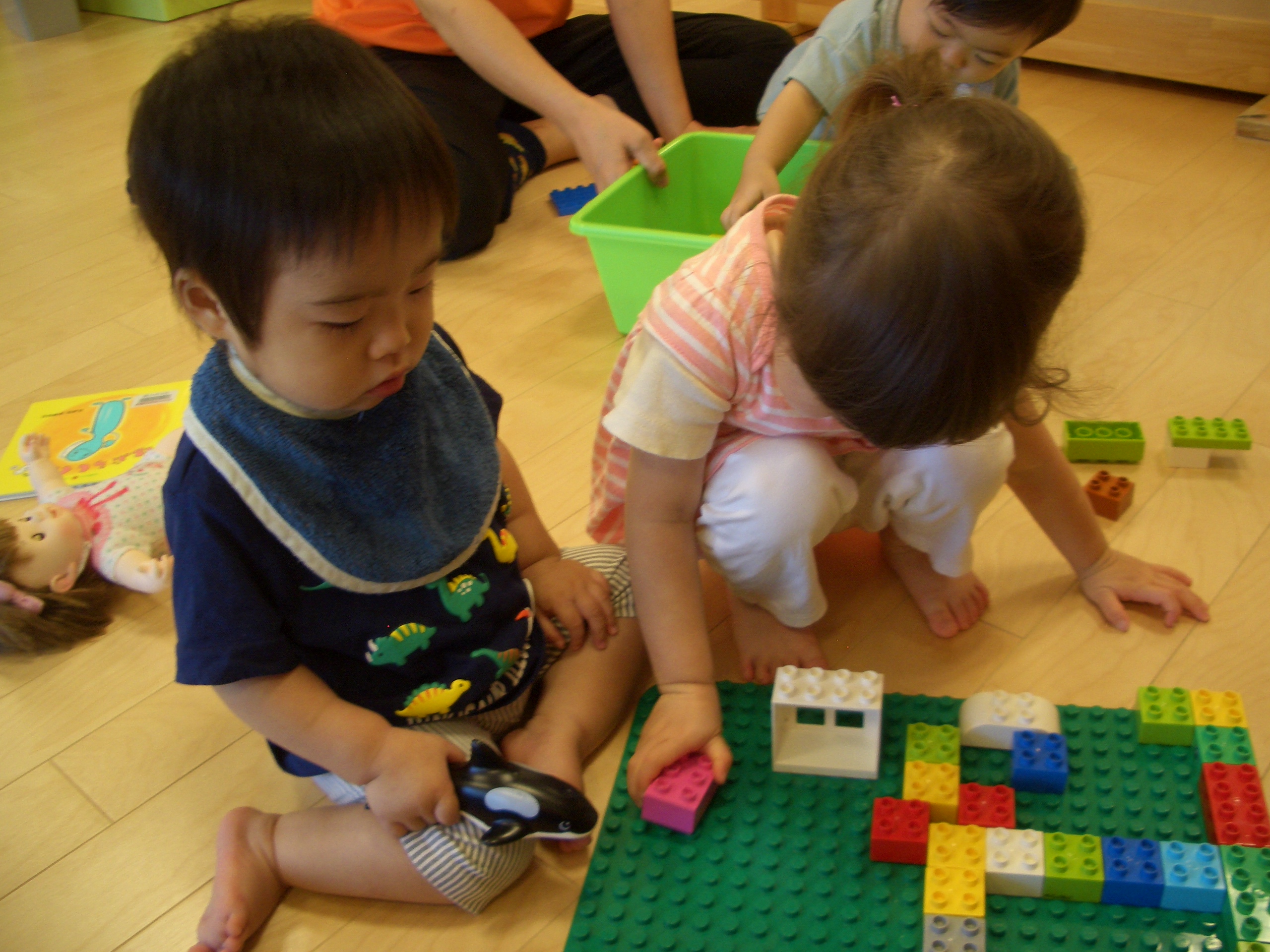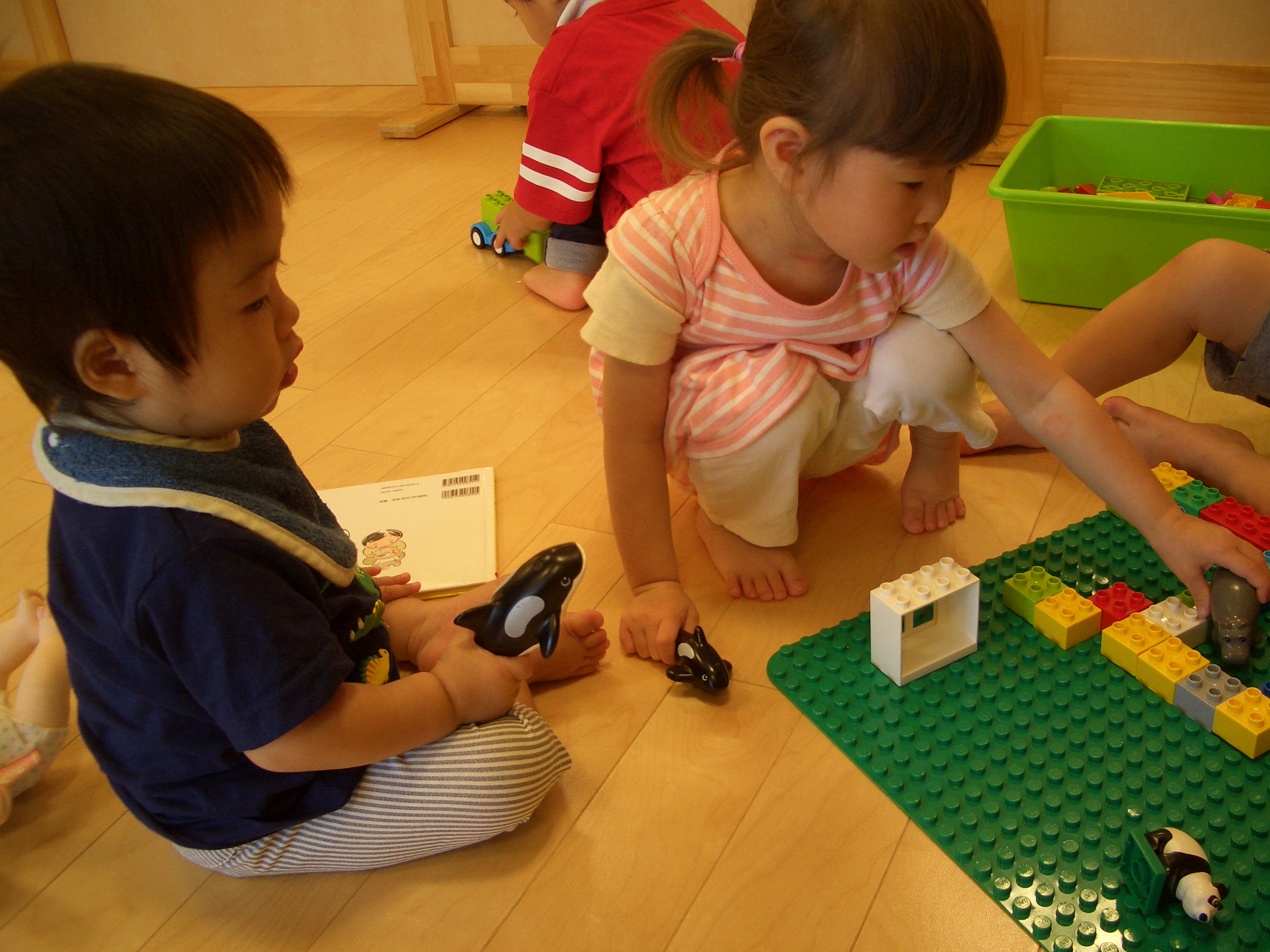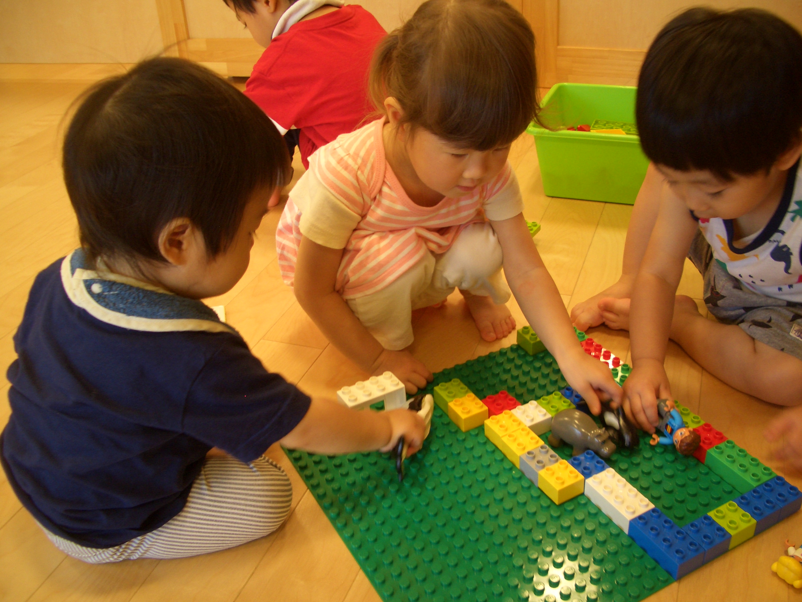 レゴブロックをやっているお友だちの側に行き、「ぼくもまぜてよー」と見つめています⇩