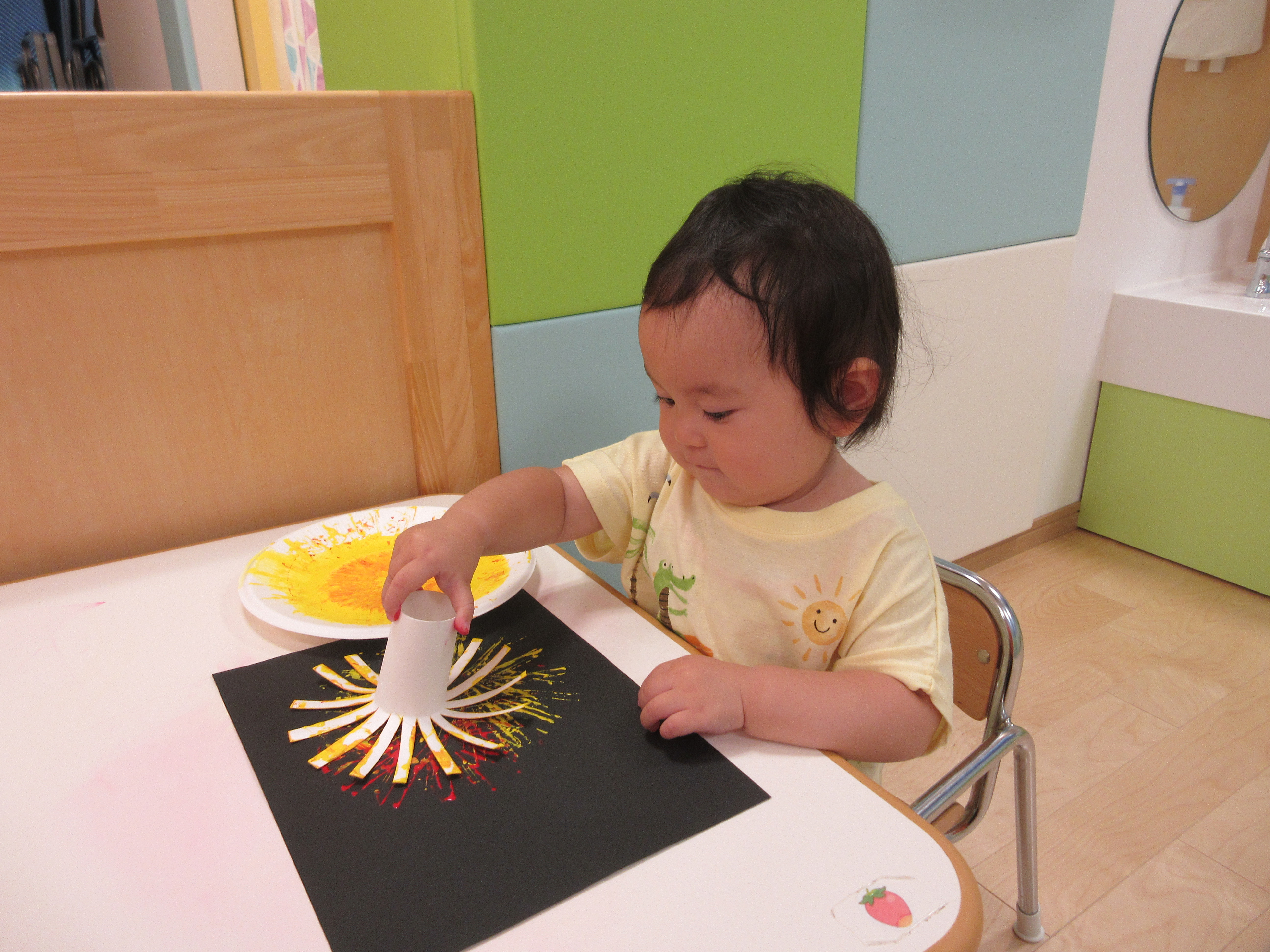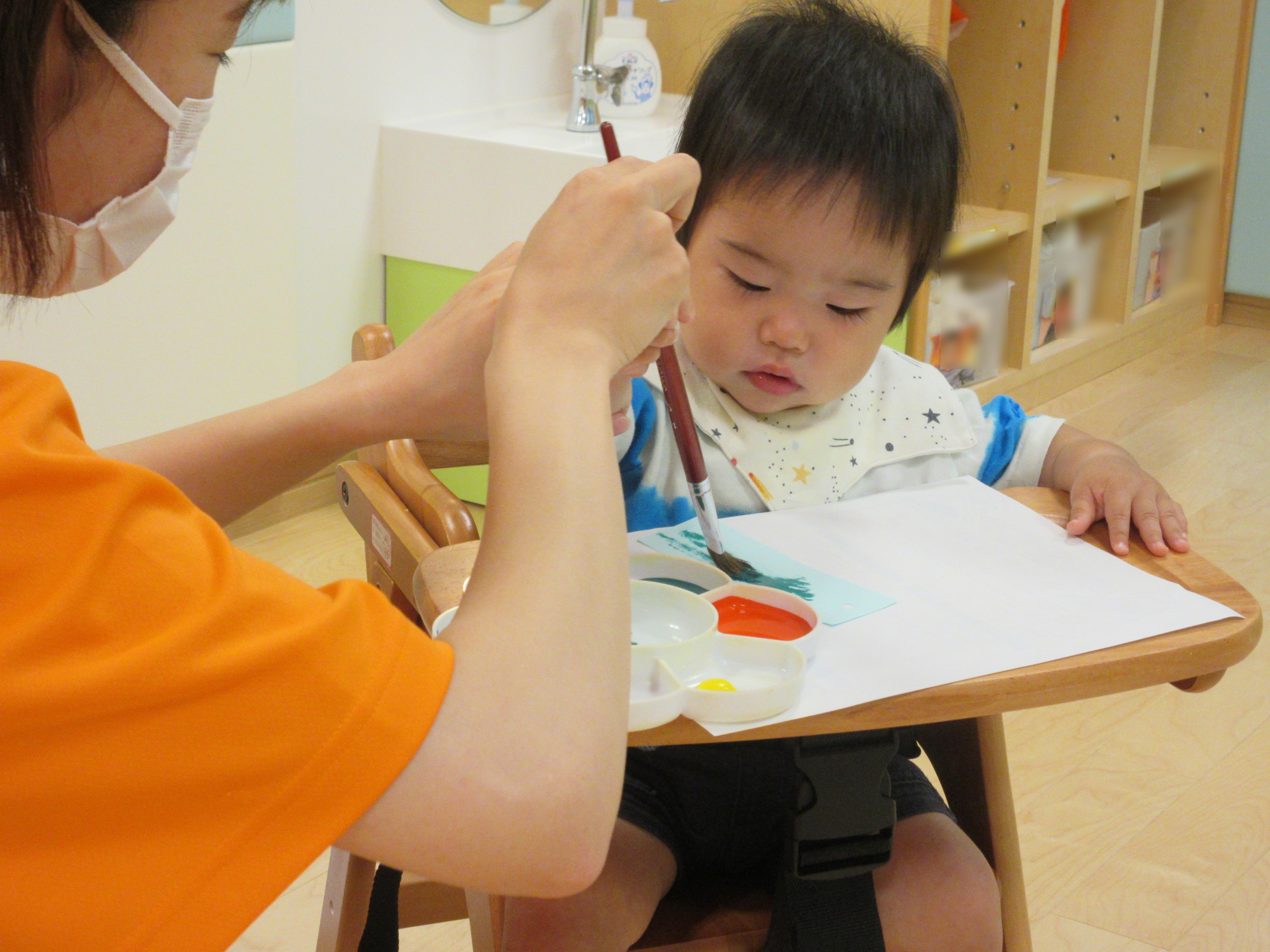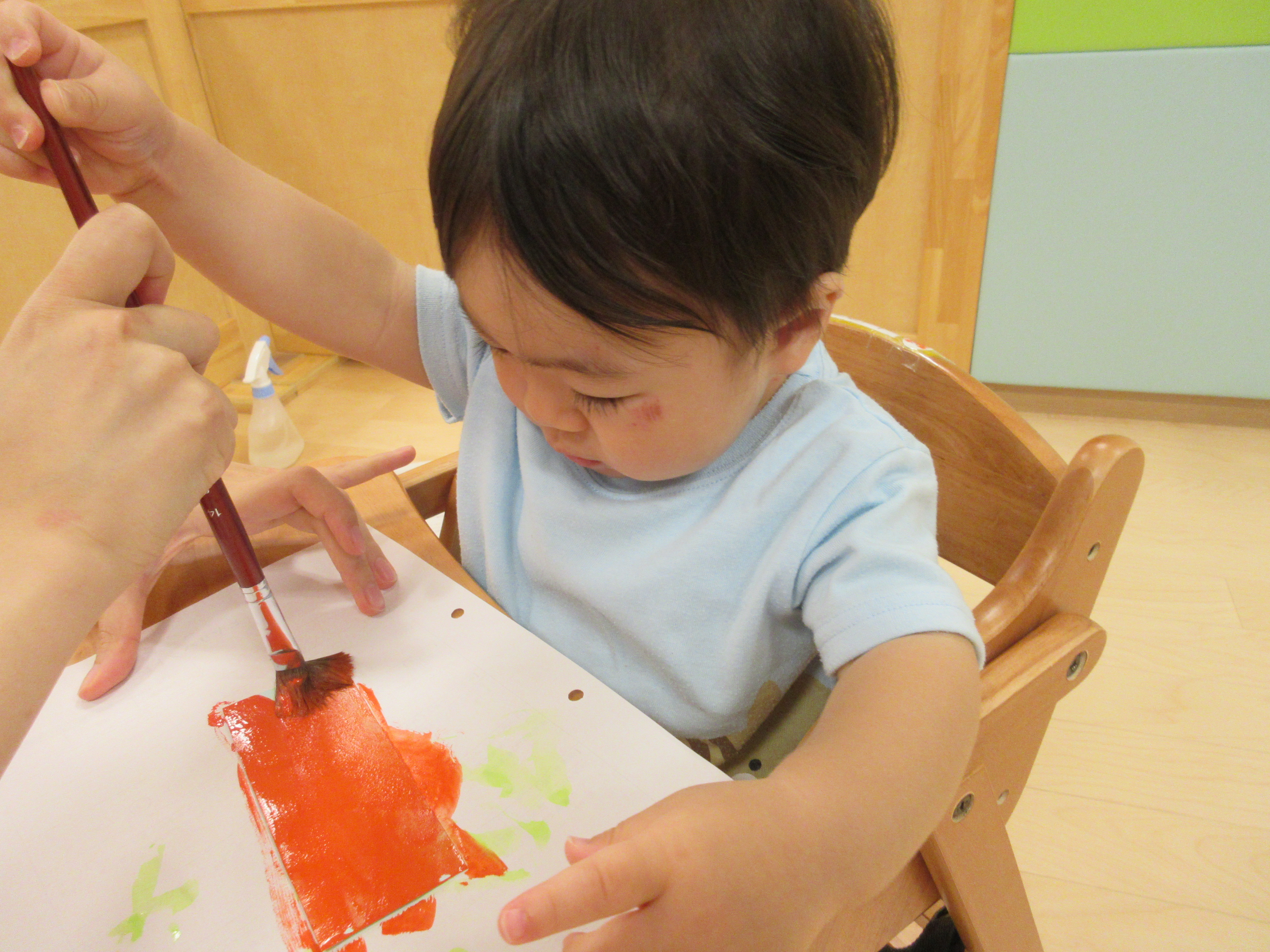 最後は好きな色の絵の具を選び、先生と一緒に筆を持って画用紙に色づけをしました![]()