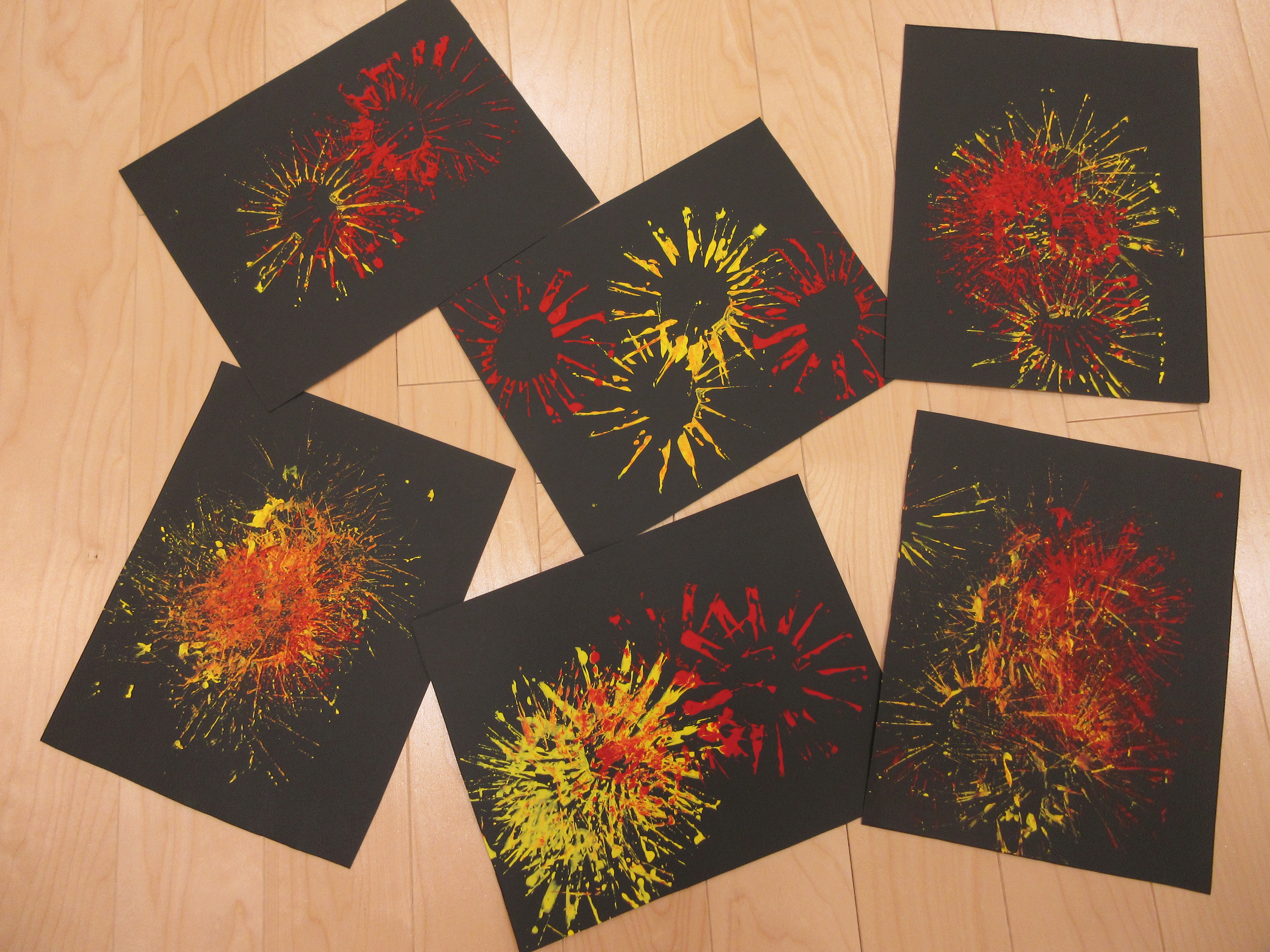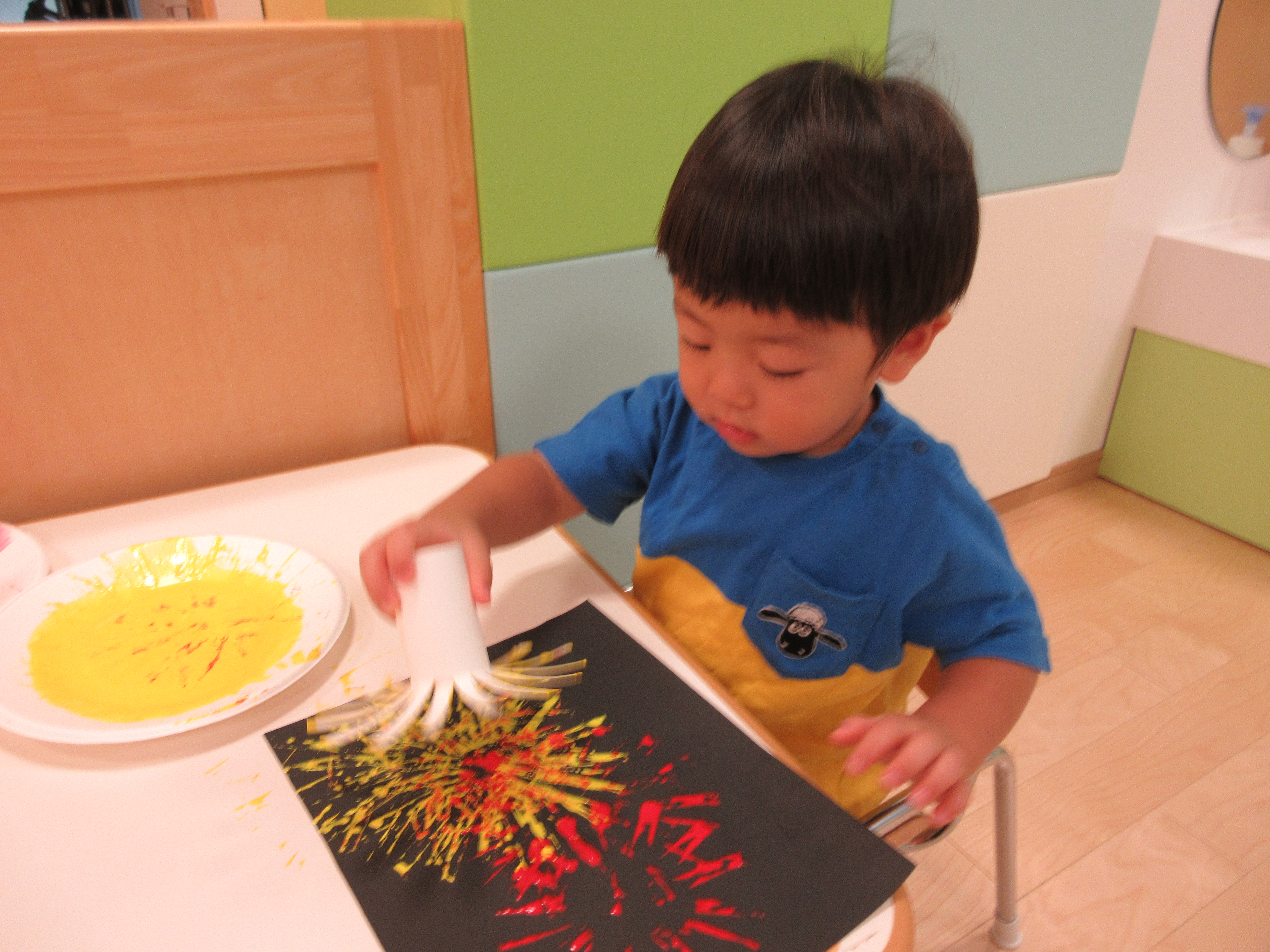 黒い画用紙に赤や黄色の絵の具の色が鮮やかにつくのが楽しいですね![]()