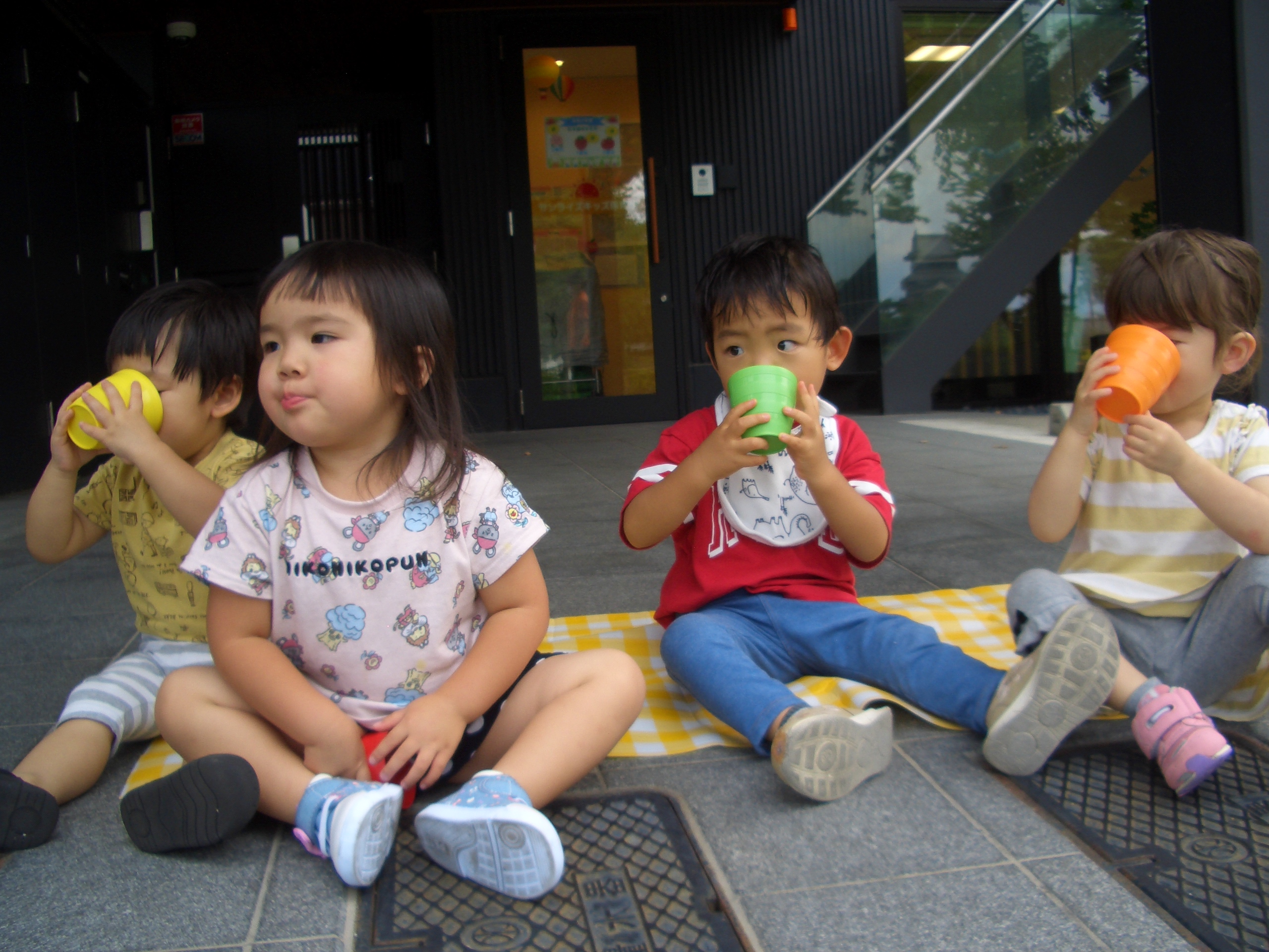 別の日ですが沐浴した後、保育園の前の軒下に出て、シートを敷きお茶を飲みました![]()