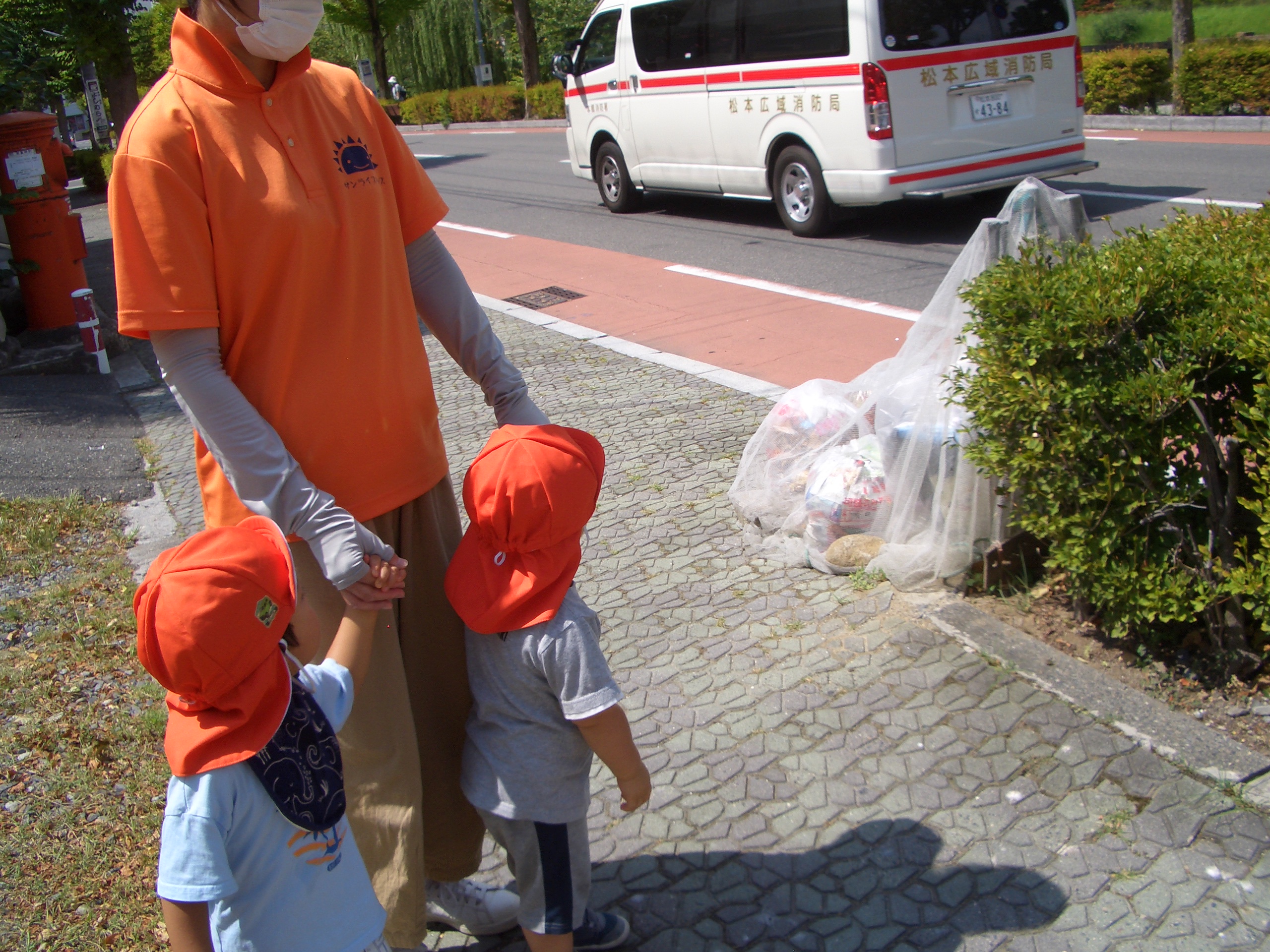 保育園に着く少し前に救急車を見ることができ、大興奮の子どもたちでした。
