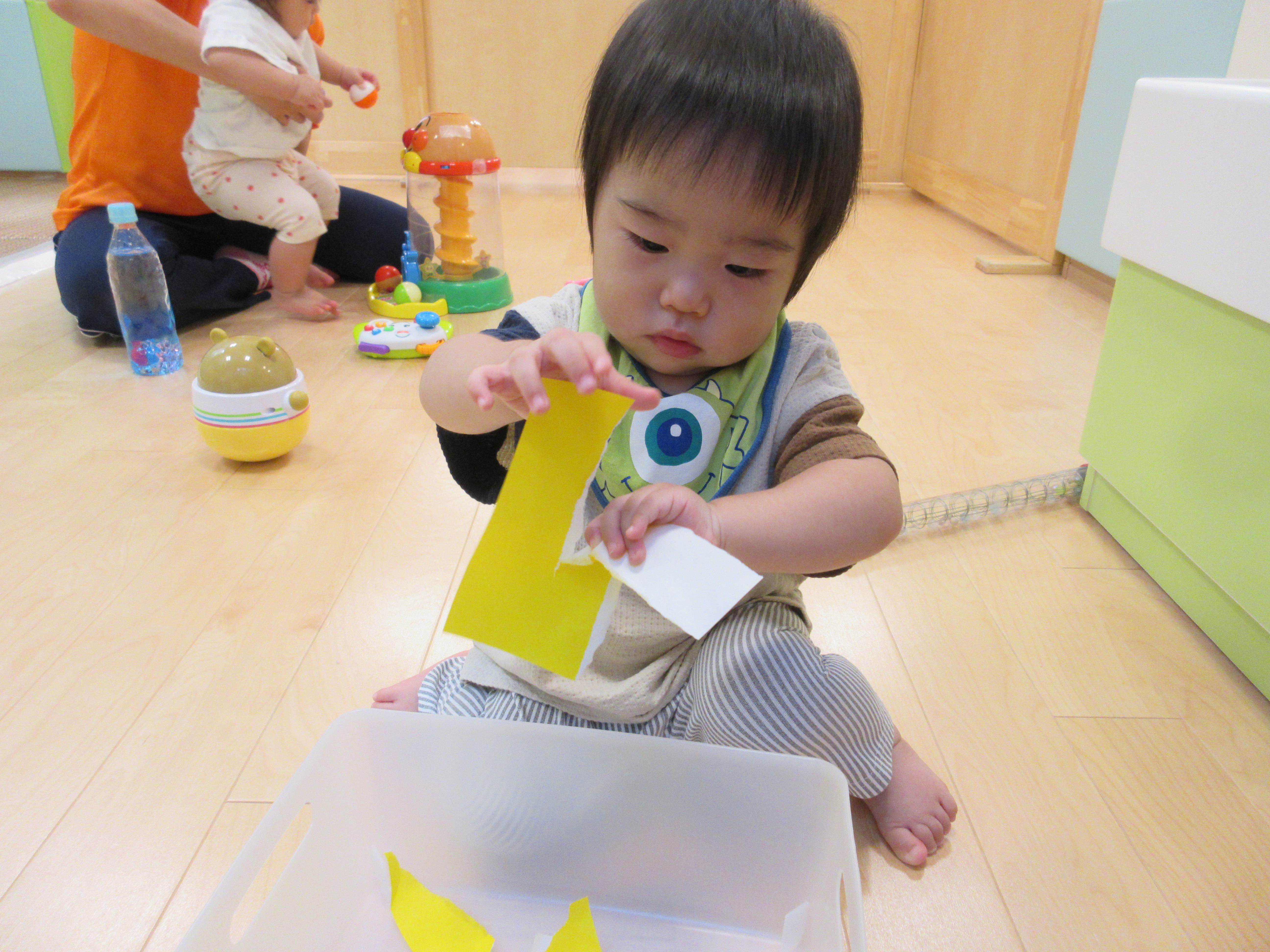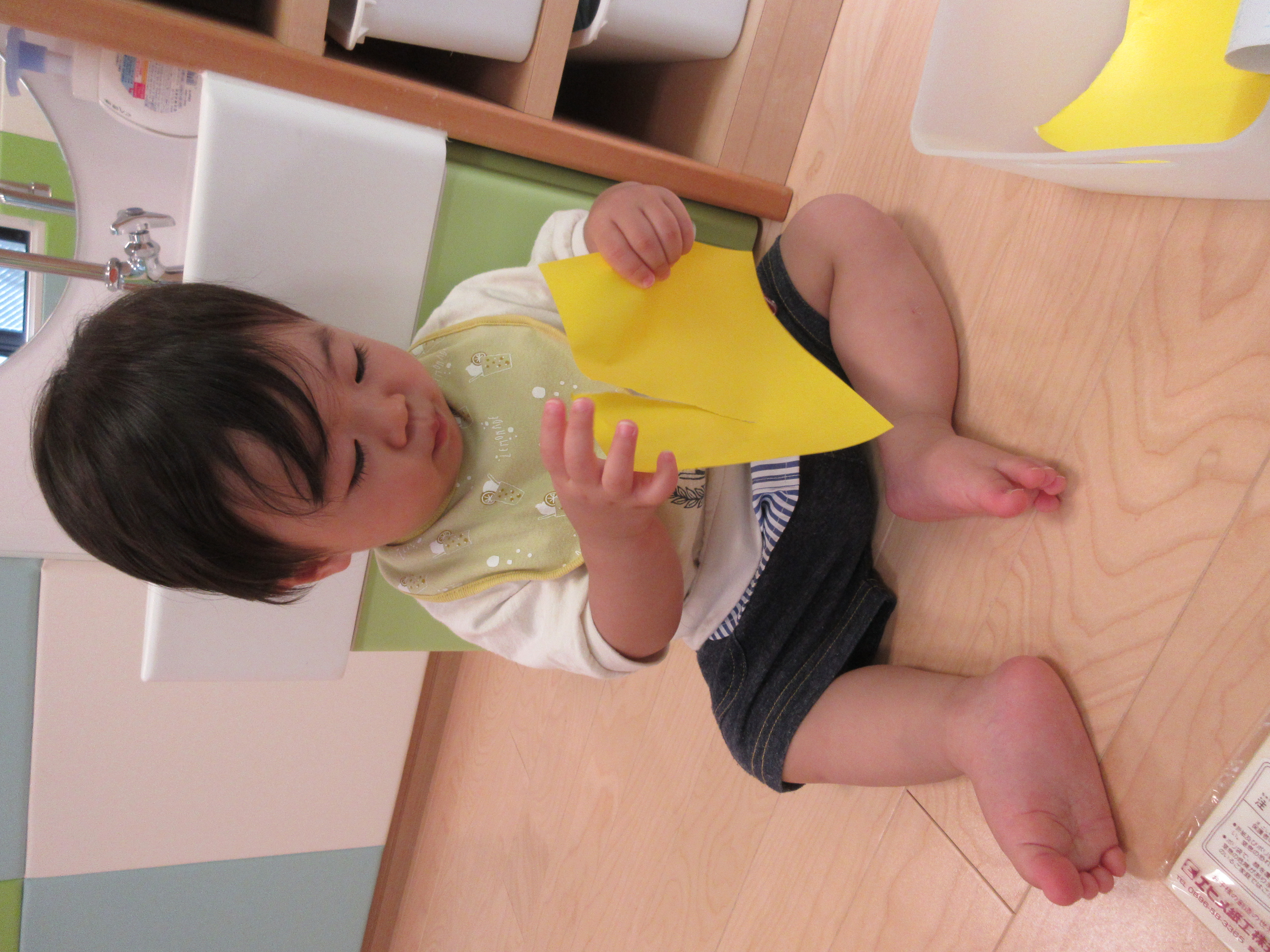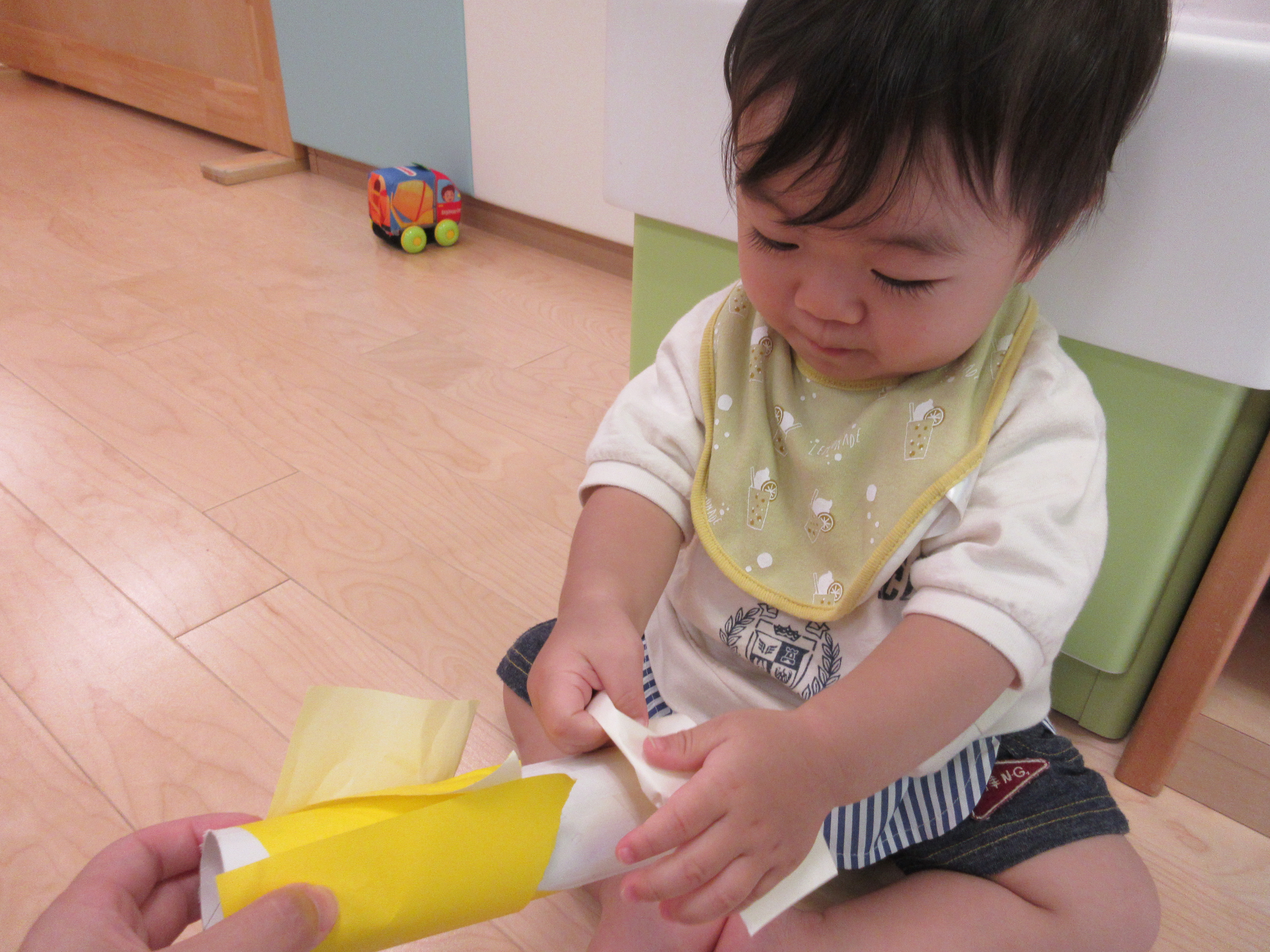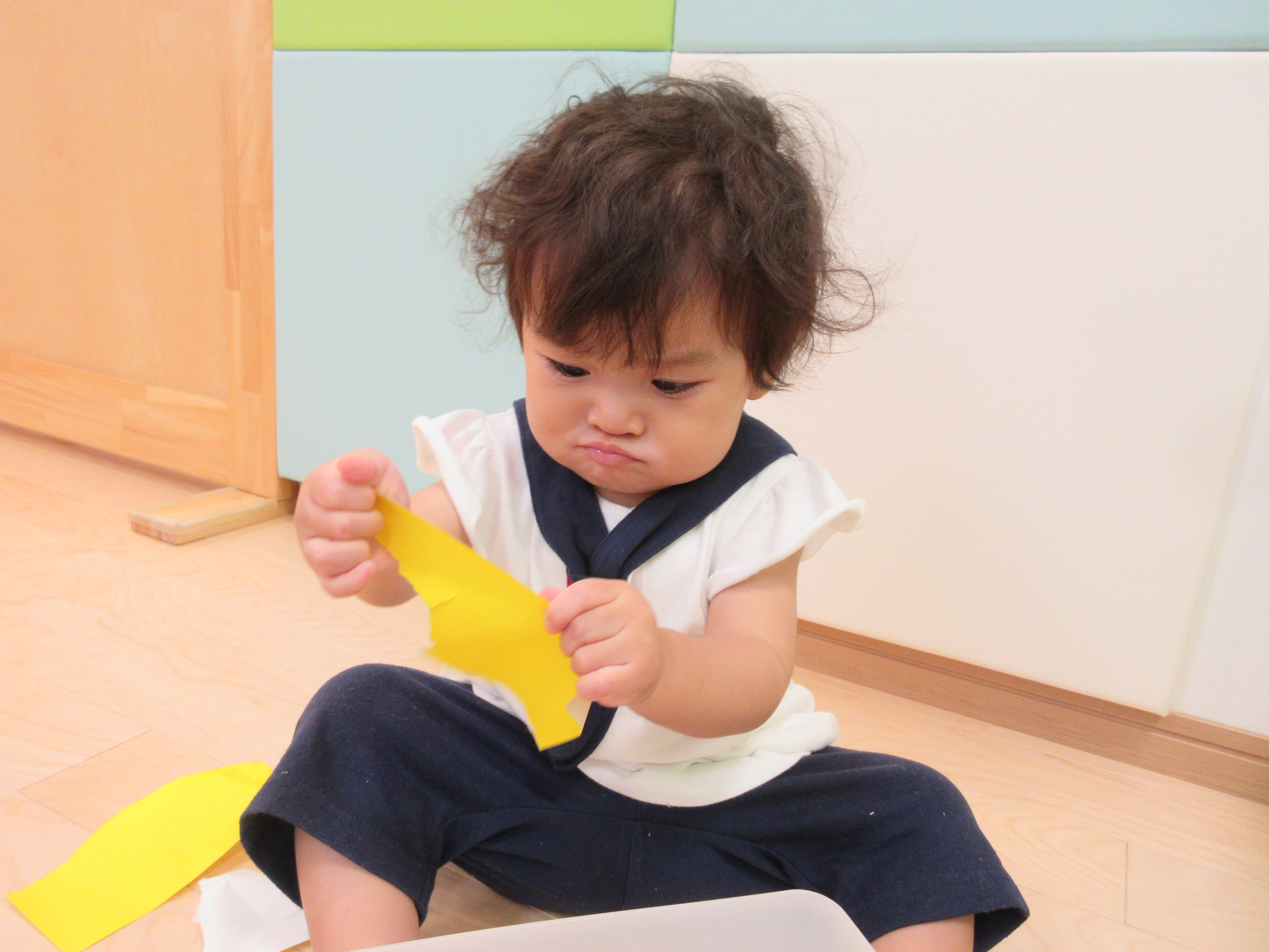 手首をひねって破くのはなかなか難しく、横に引っ張っている子が多かったです![]()