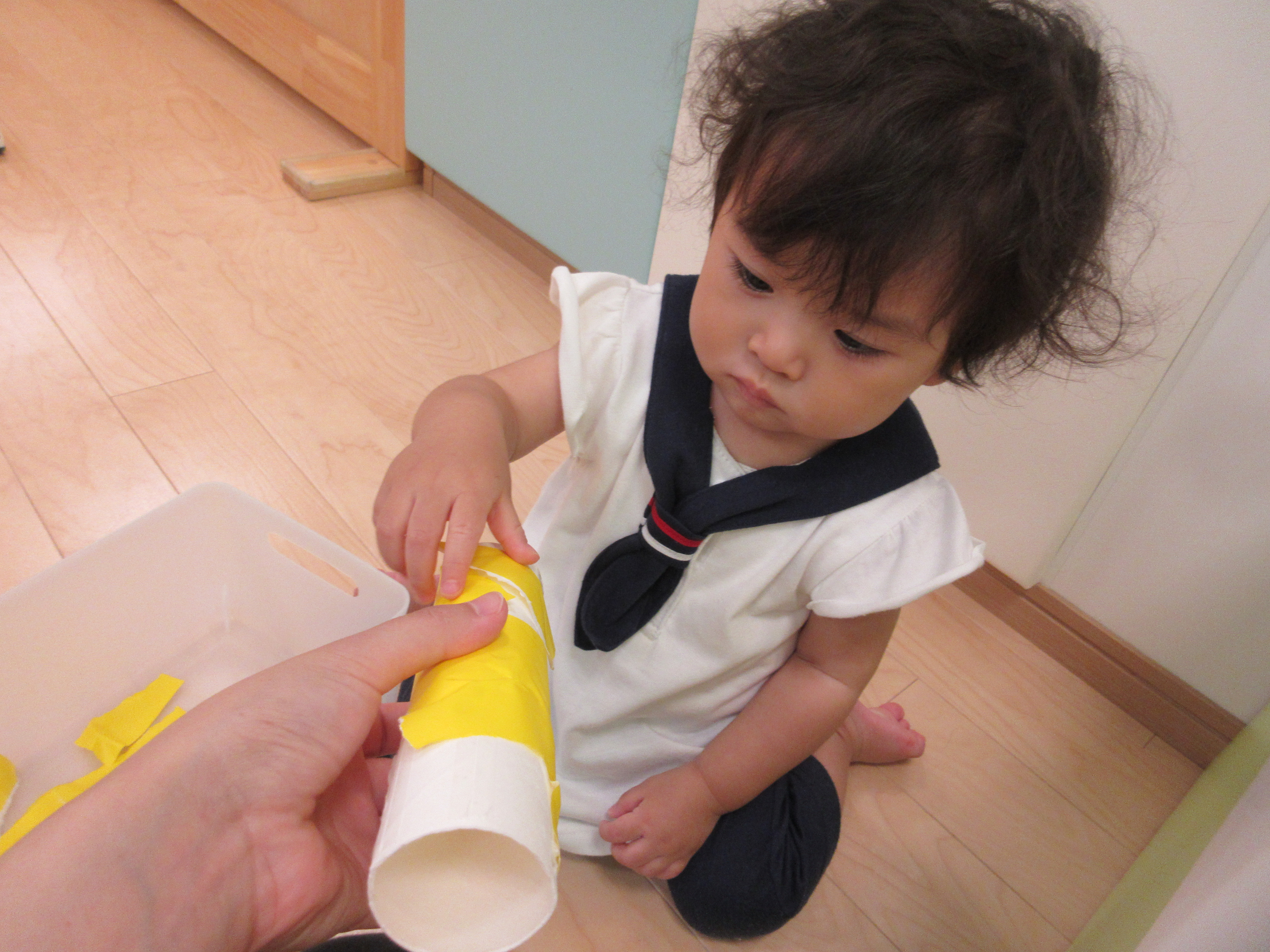 トイレットペーパーの芯に両面テープを貼っていたため、手がくっつくのを不思議そうにする子もいました。