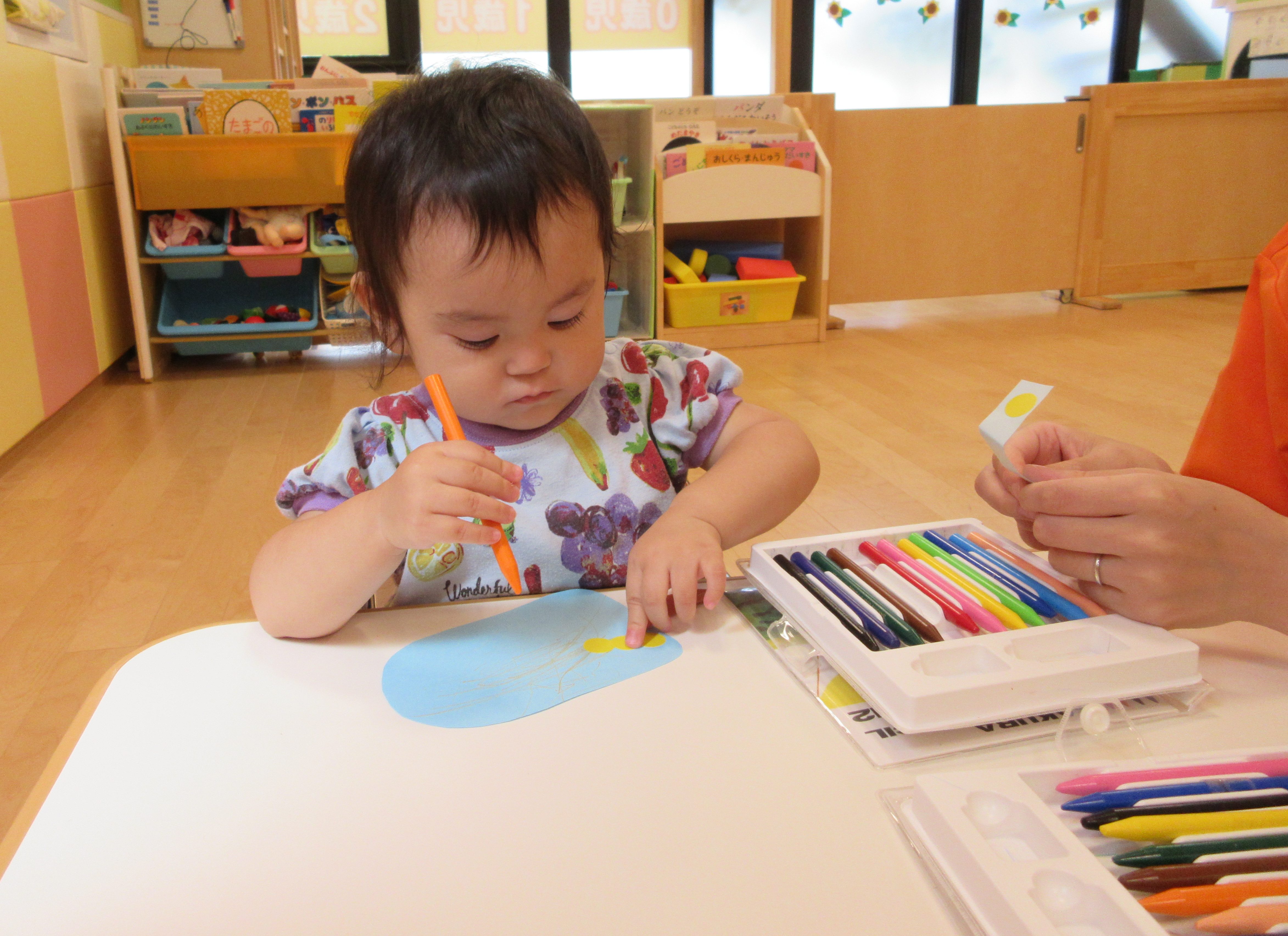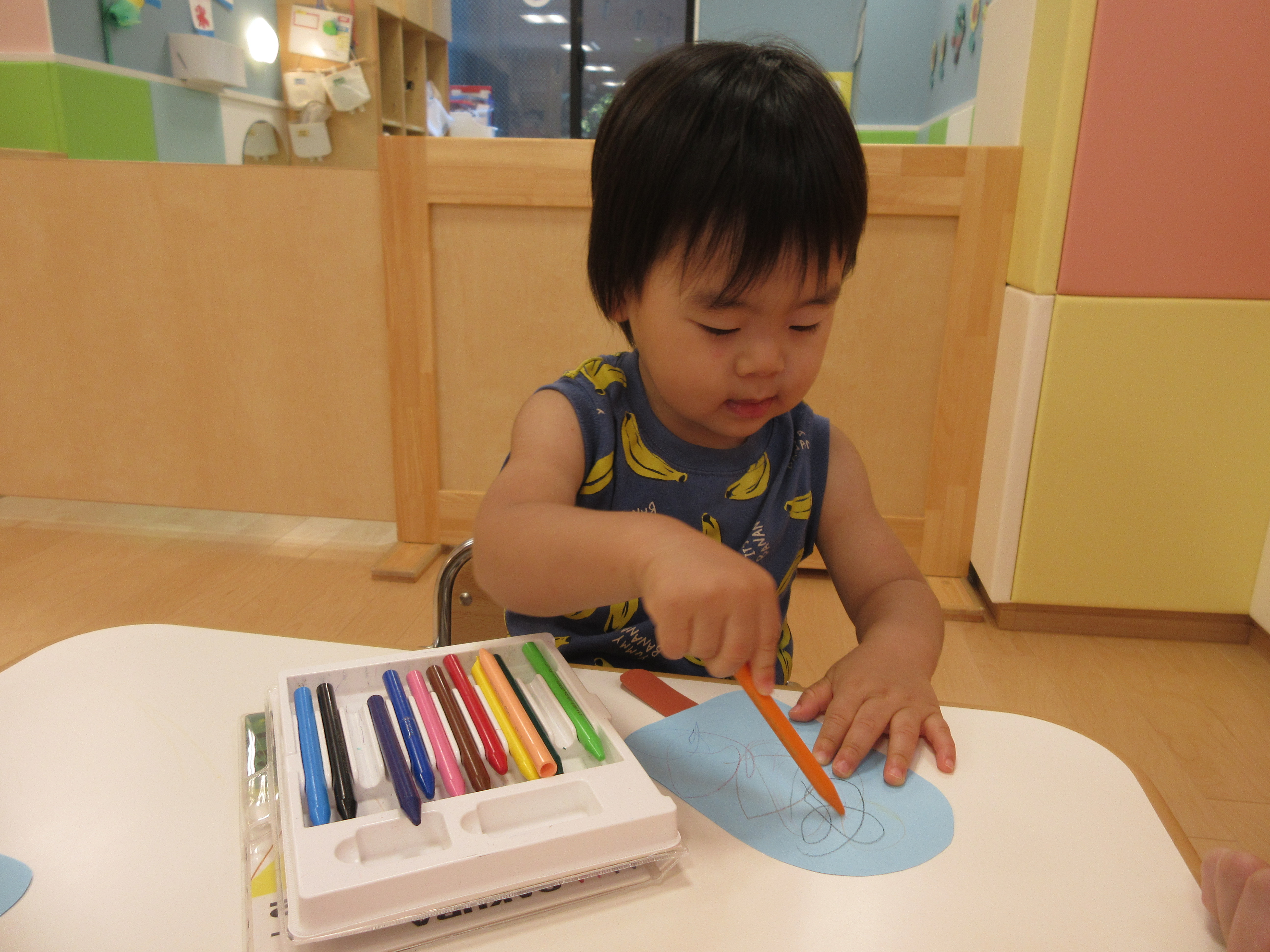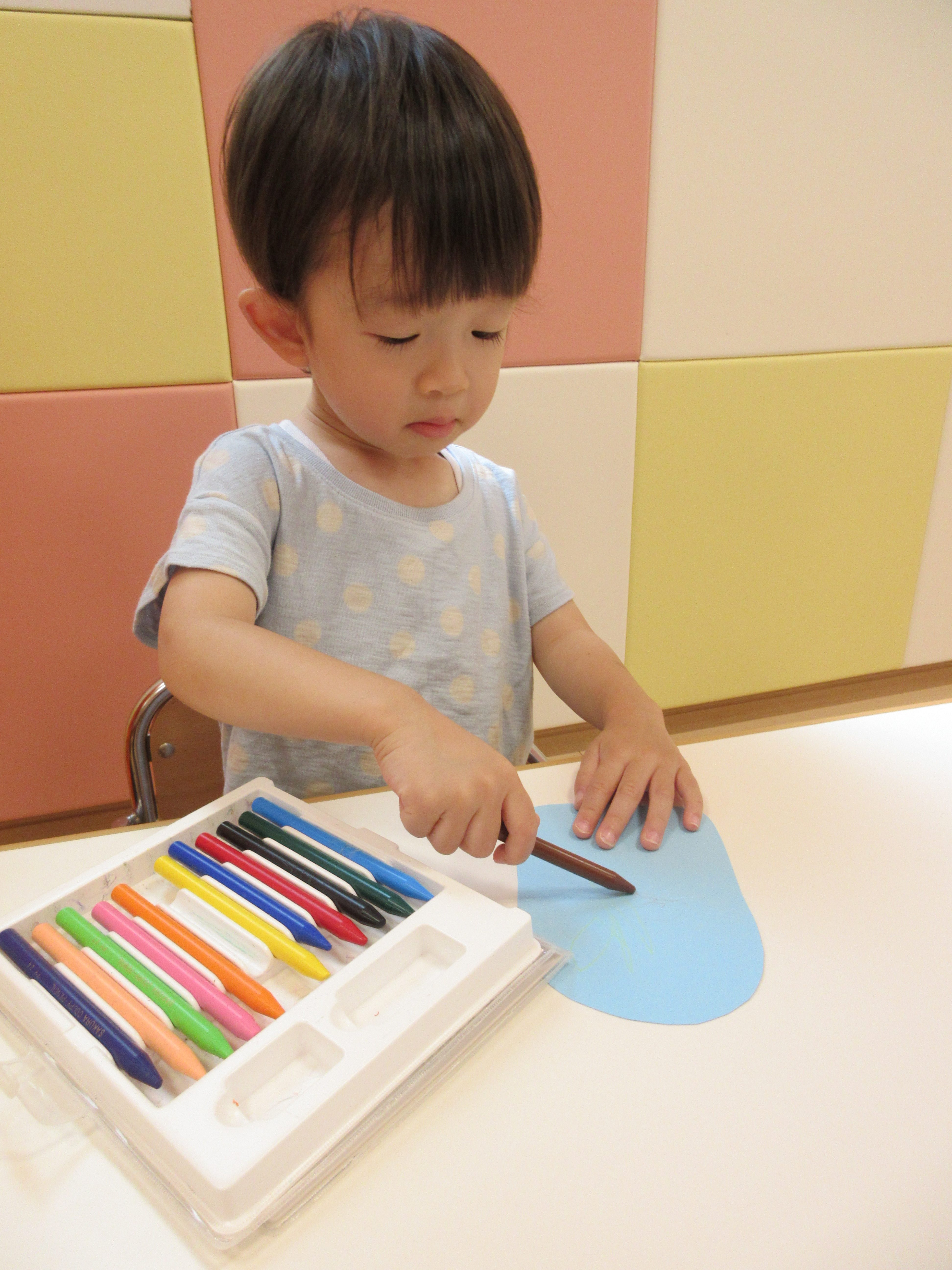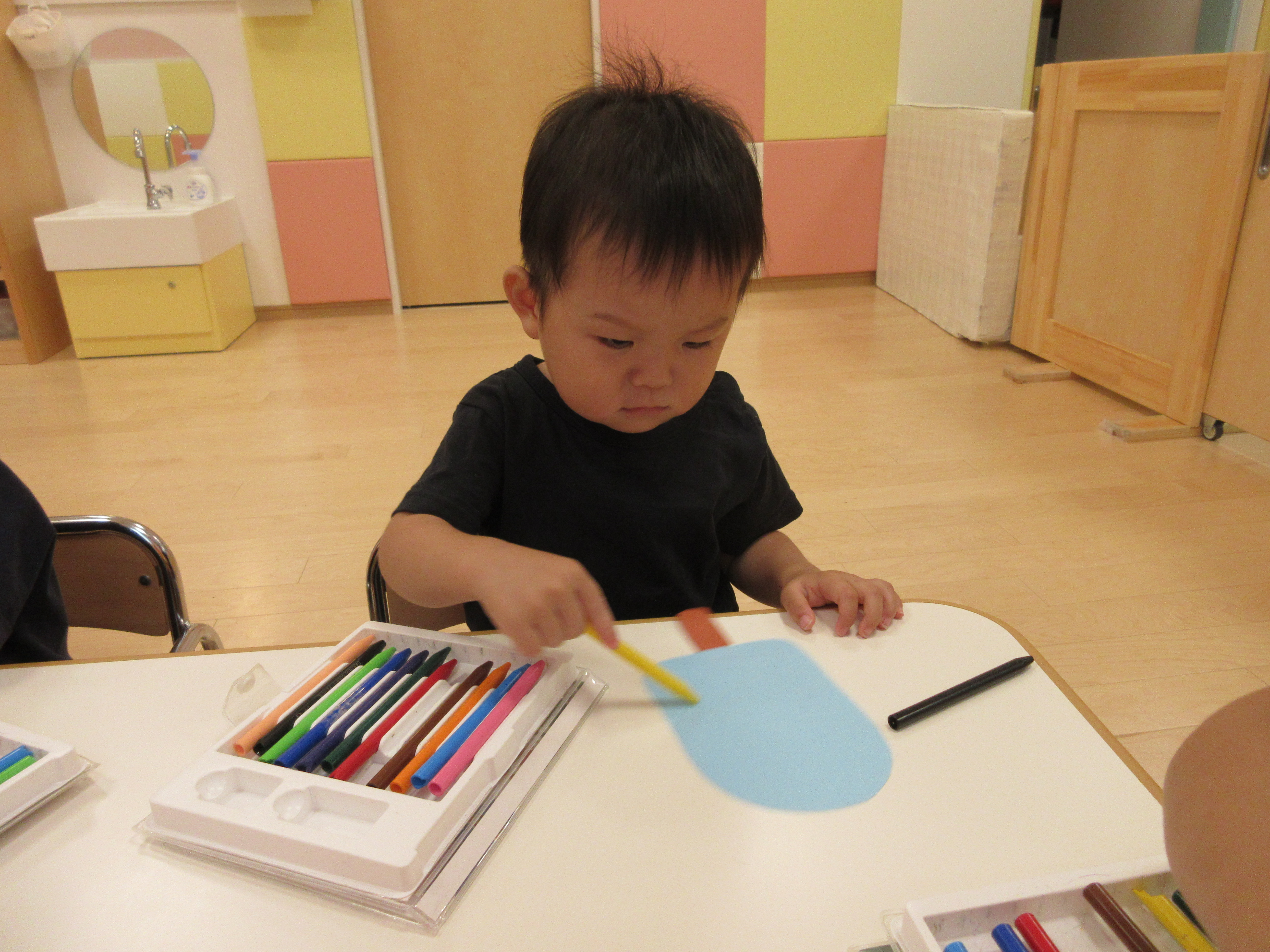 アイスの土台とクーピーを配るとそれぞれ好きな色を手に取り、力強く描いたり、優しく描いたりして色を付けていました。