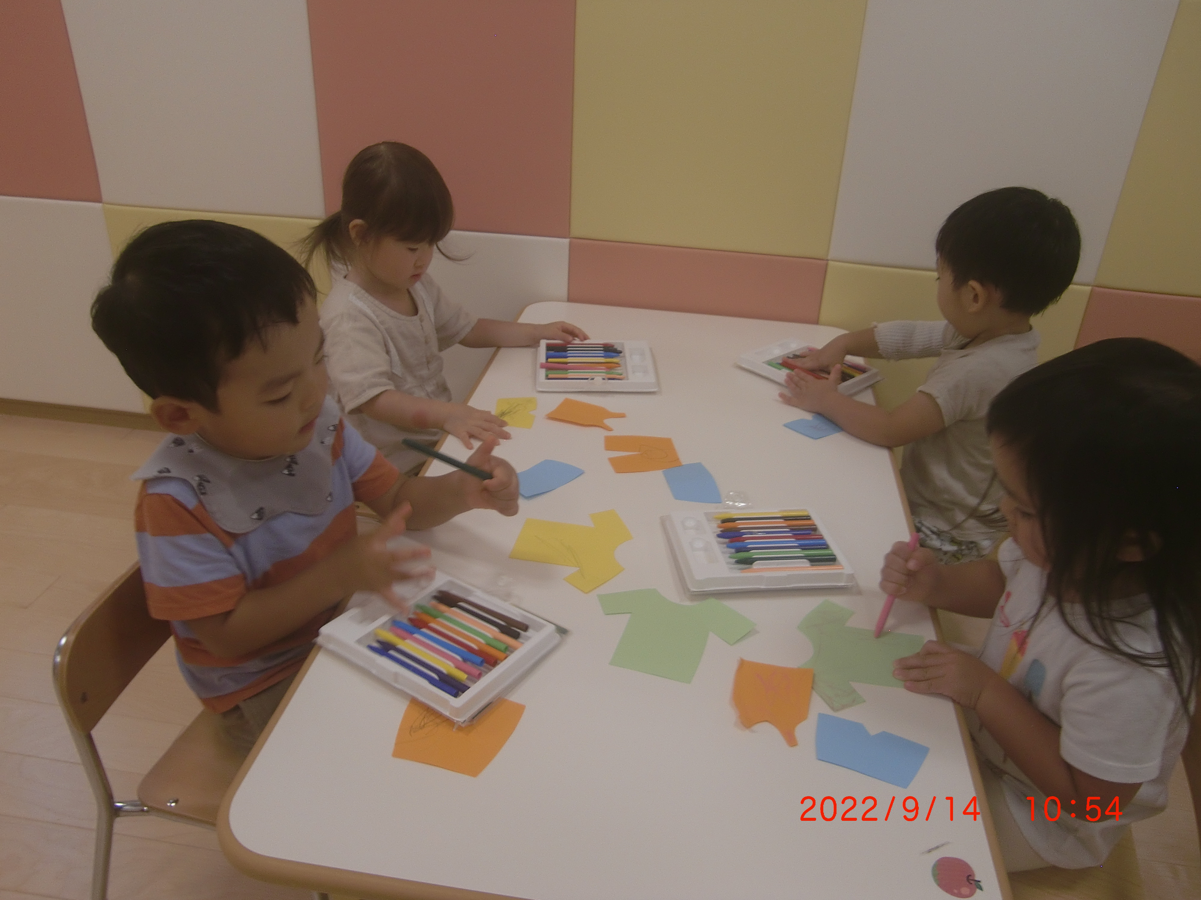 最初はクーピーで色を付けてからシール貼りをしたのですが、どの子も真剣な表情でキノコを作っていましたよ![]()
