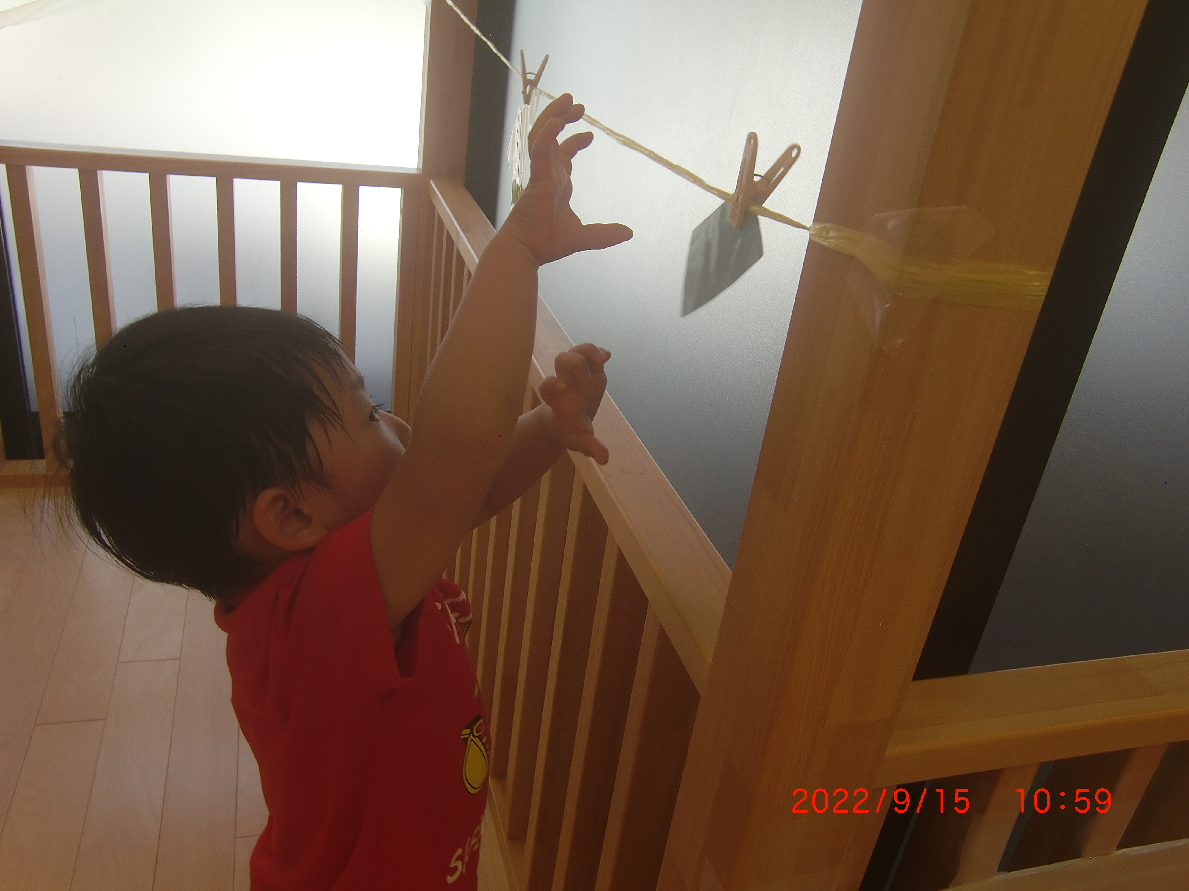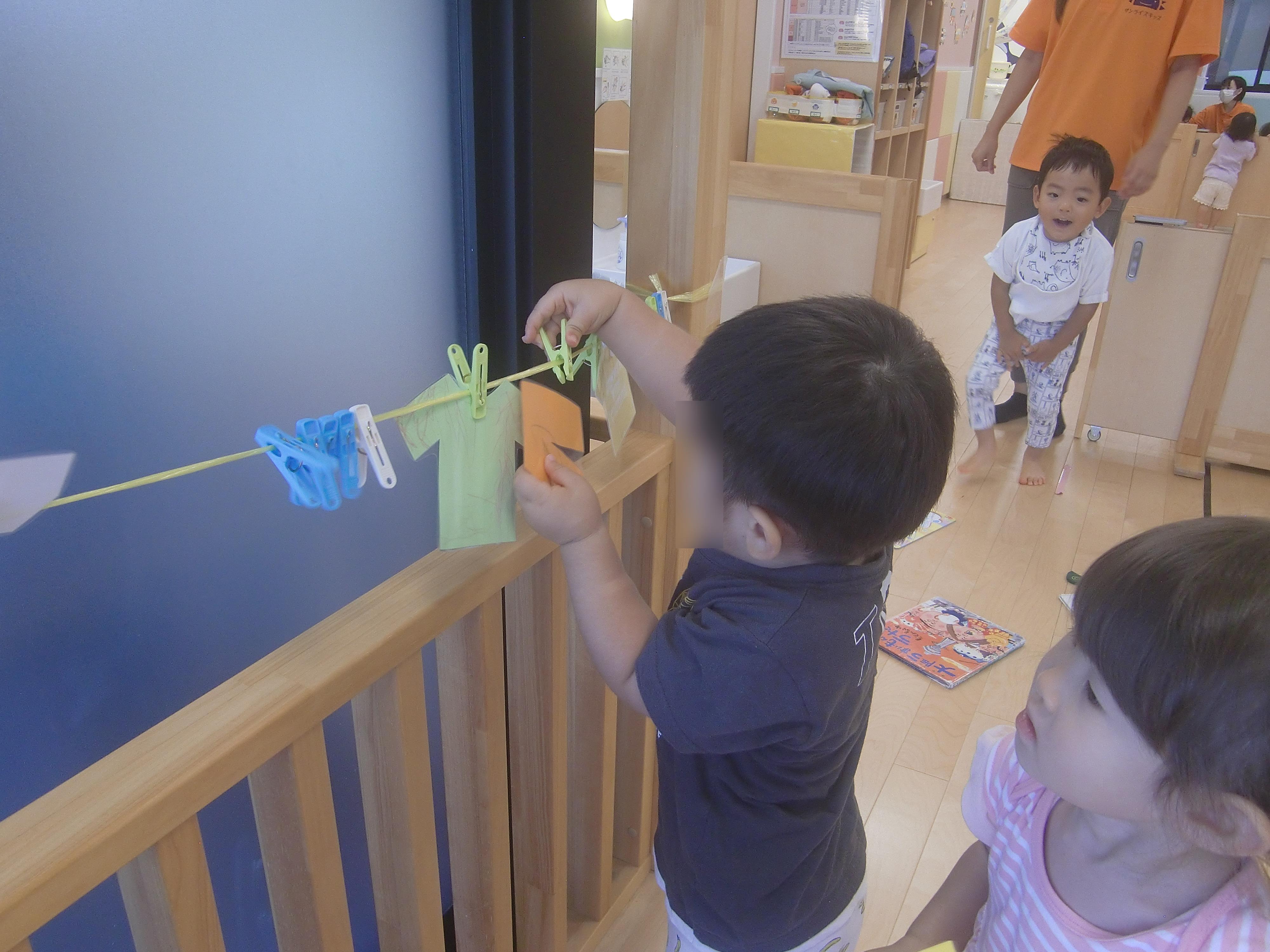 お家でお母さんやお父さんの洗濯物を干す姿を見ているからか、一生懸命干そうとしていましたよ。