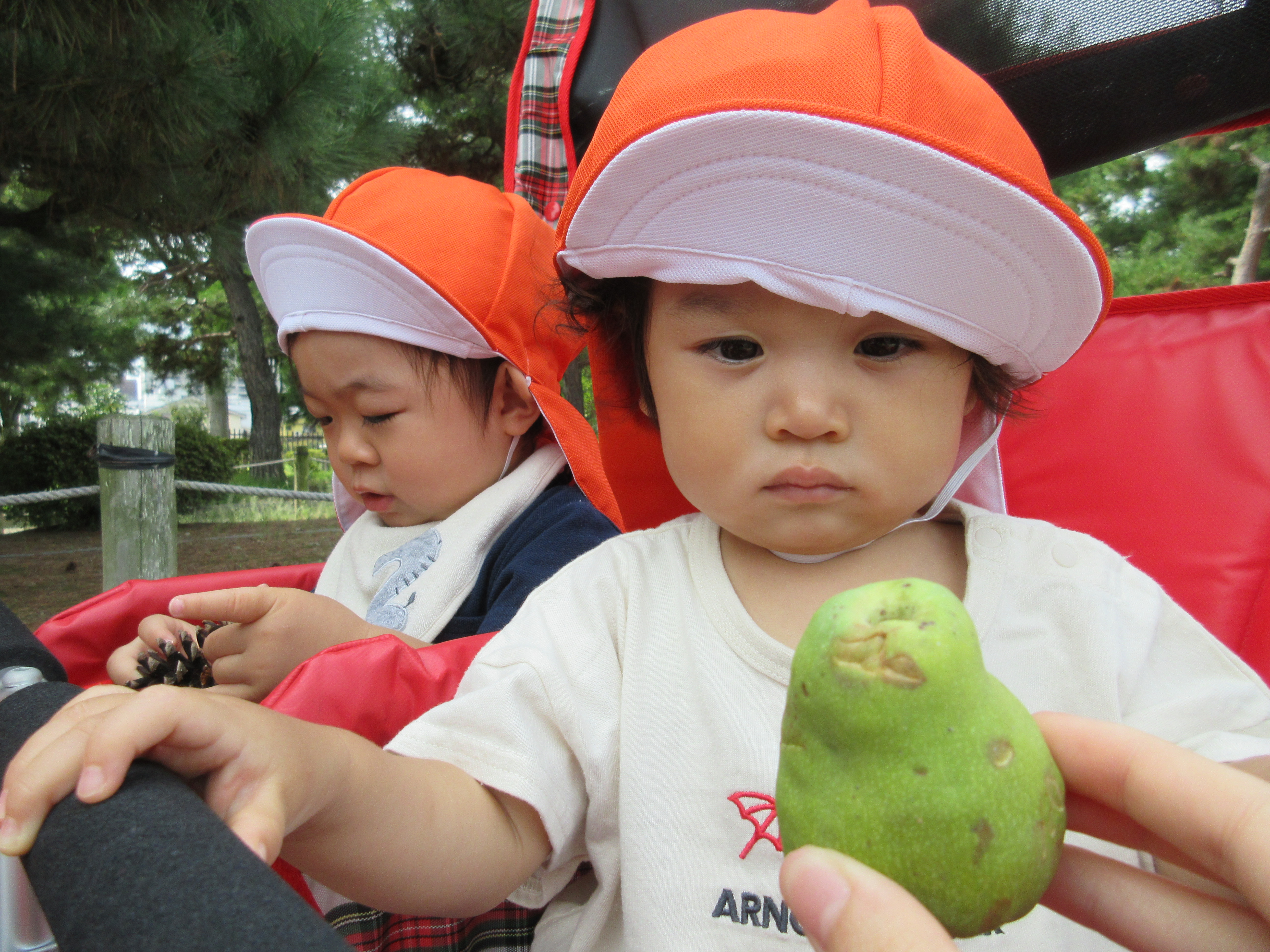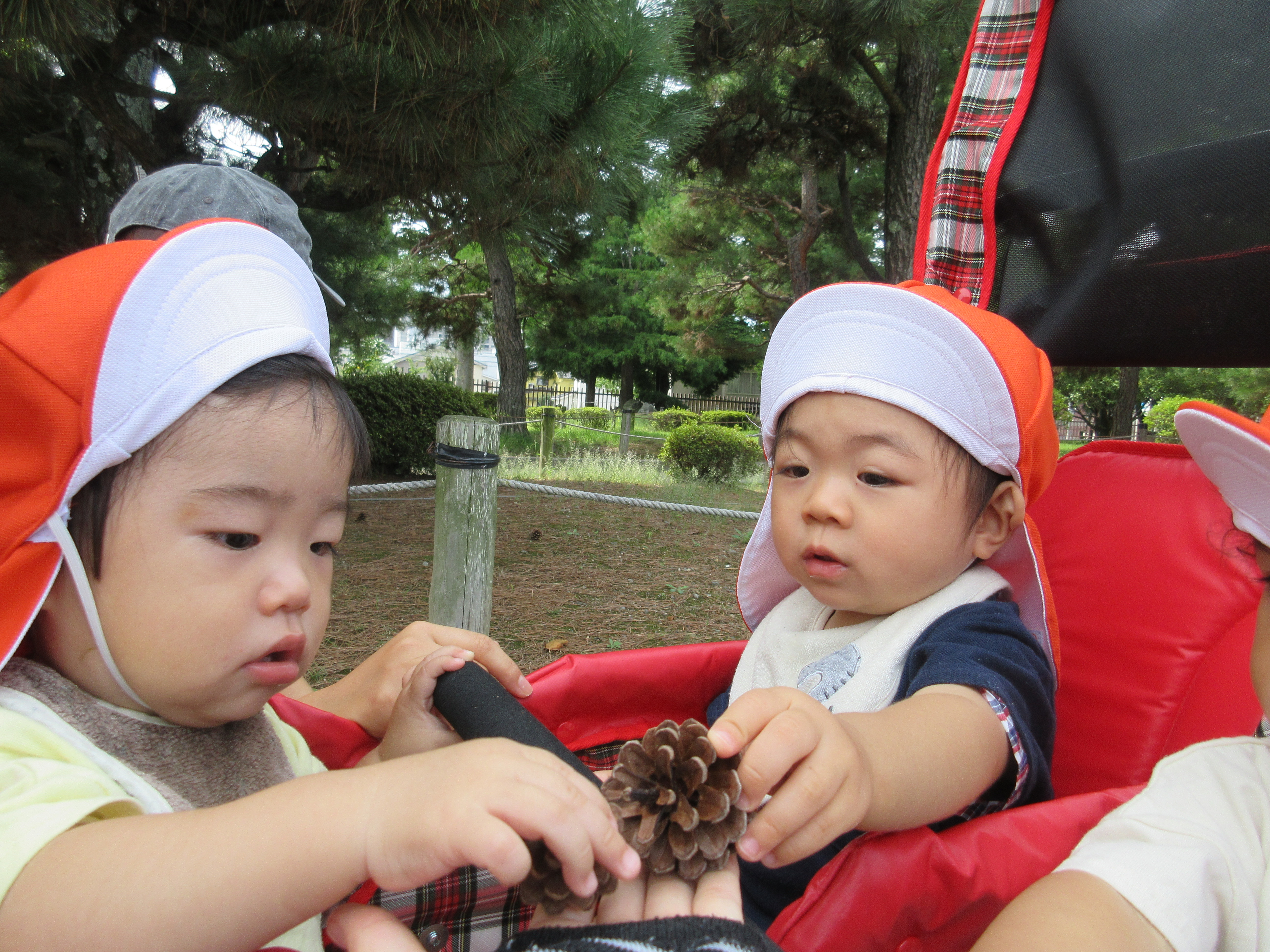 「どうぞ」と先生がまつぼっくりを渡すと2人で仲良く触って感触を確かめていましたよ。