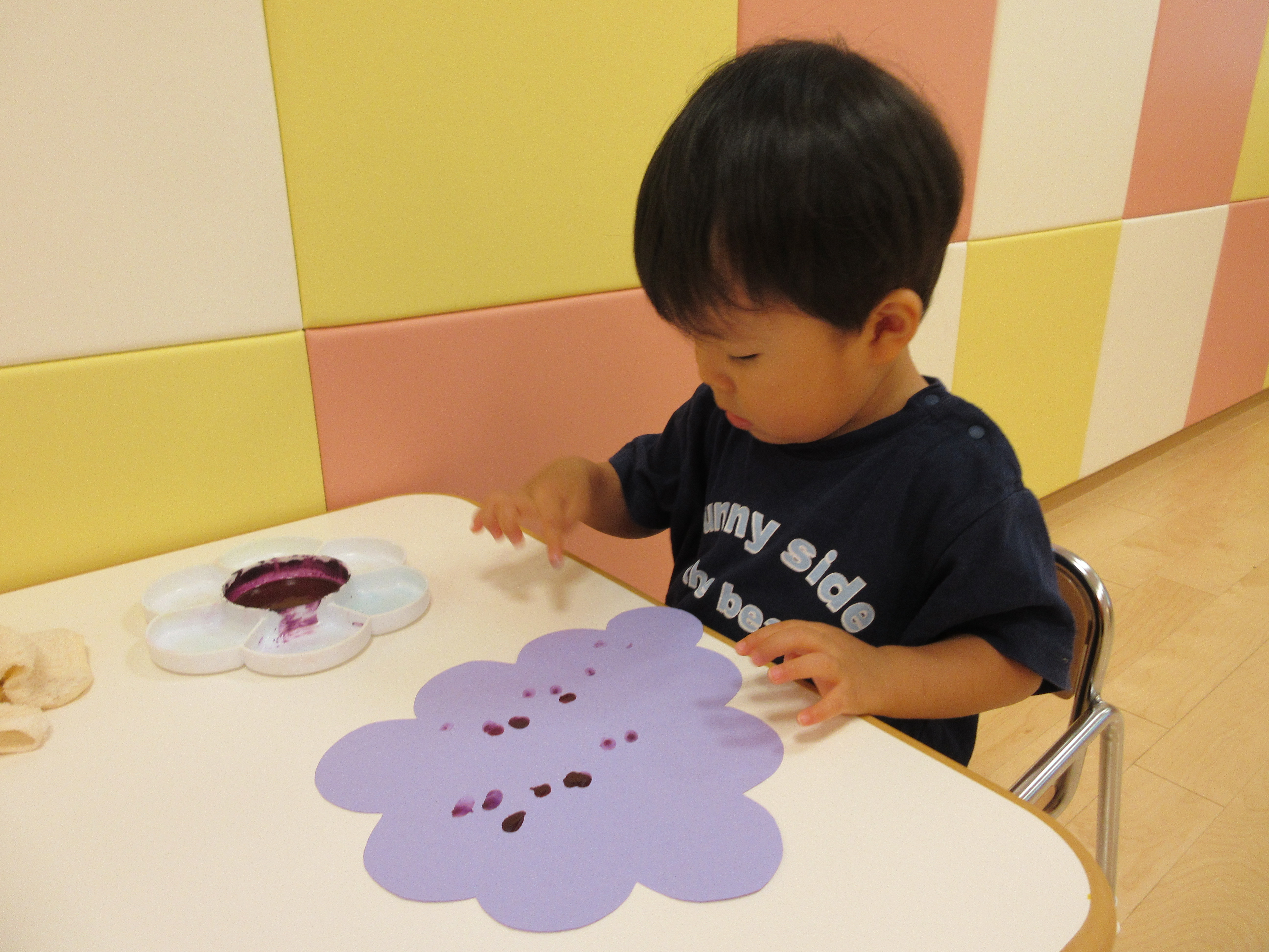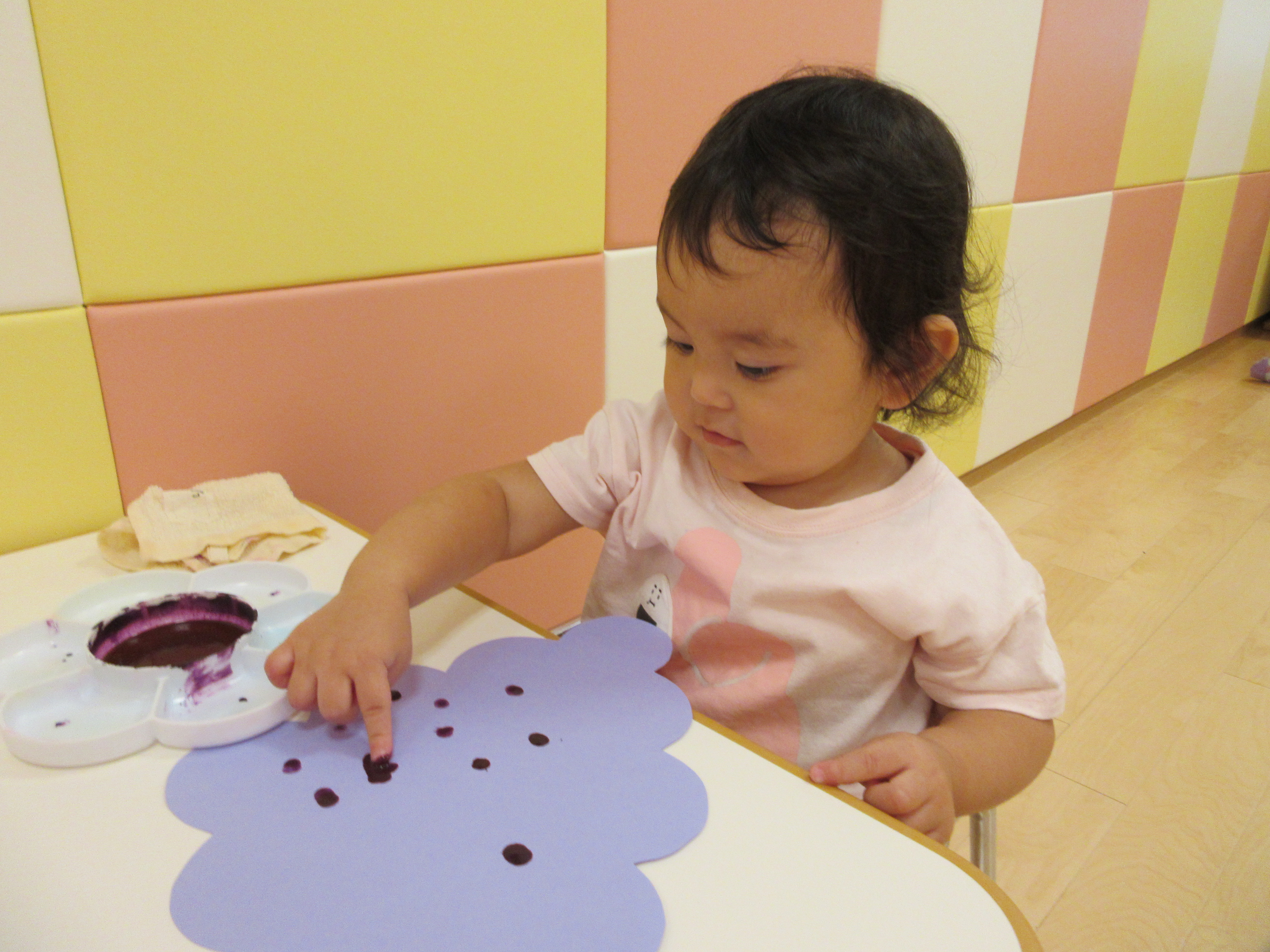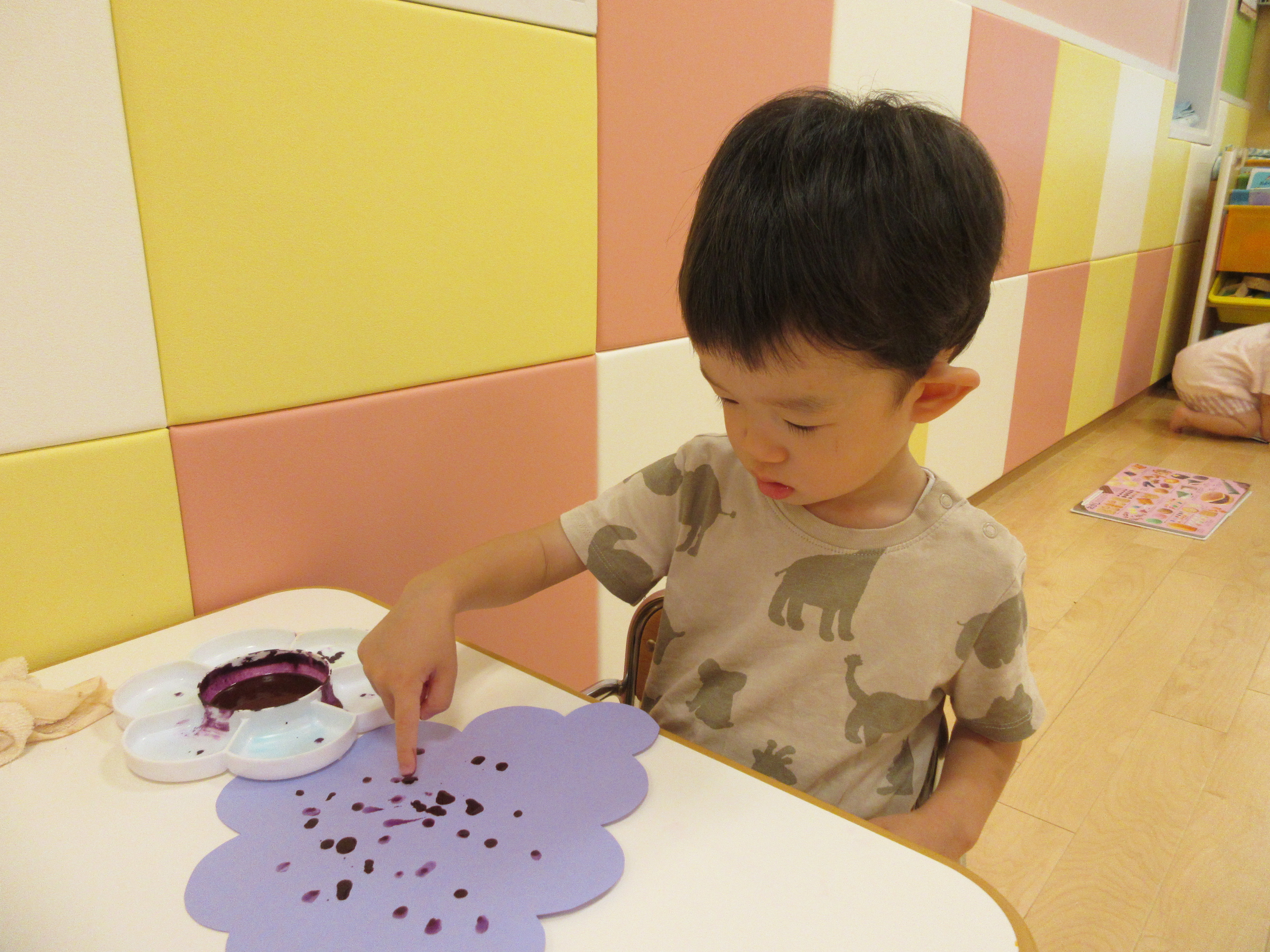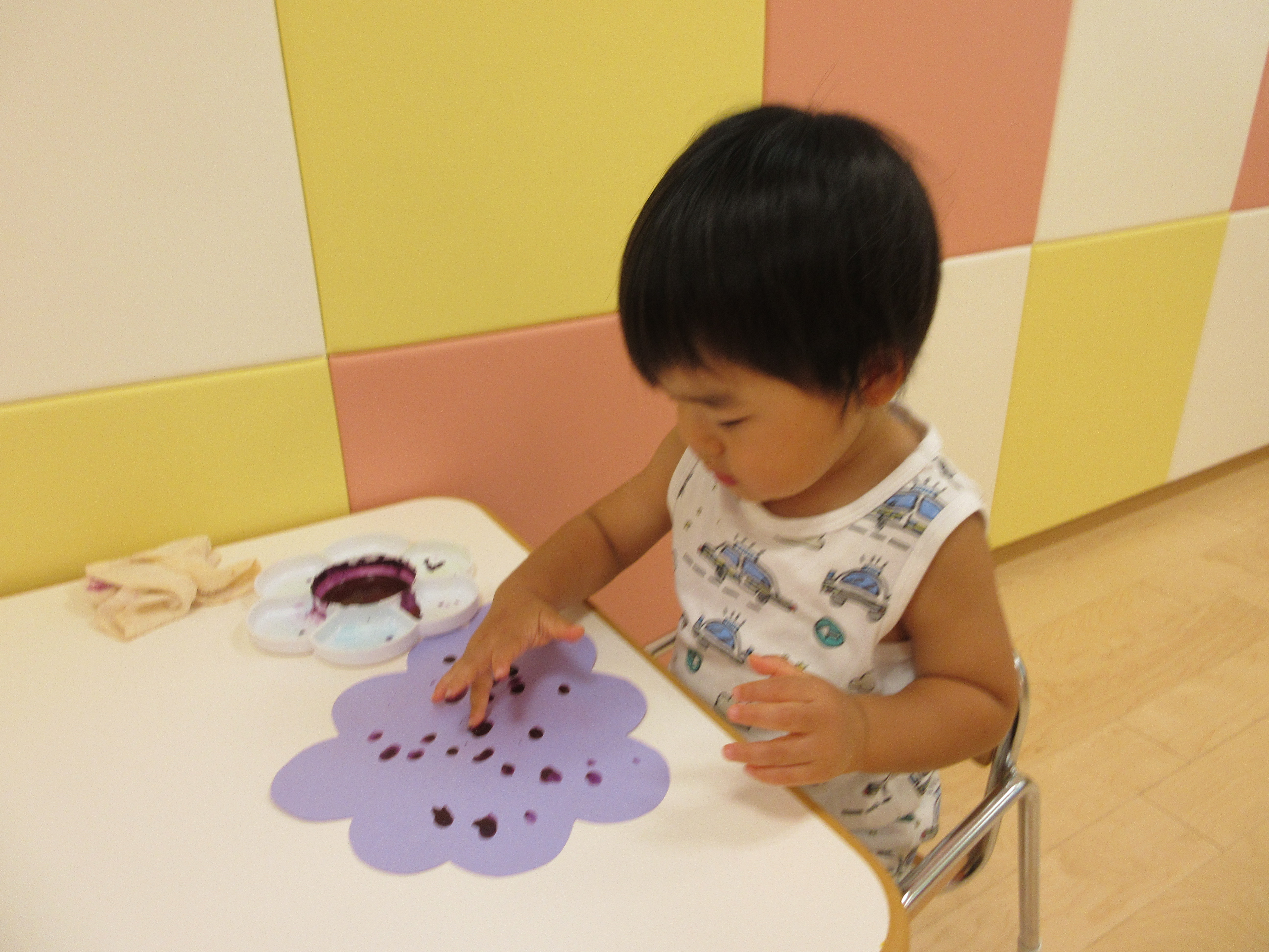 はじめは指に絵の具をつけることに抵抗がある子もいましたが、ひとつスタンプをはじめてみると楽しくて、繰り返し絵の具を指先につけてはペタっと押すことを楽しんでいました![]()