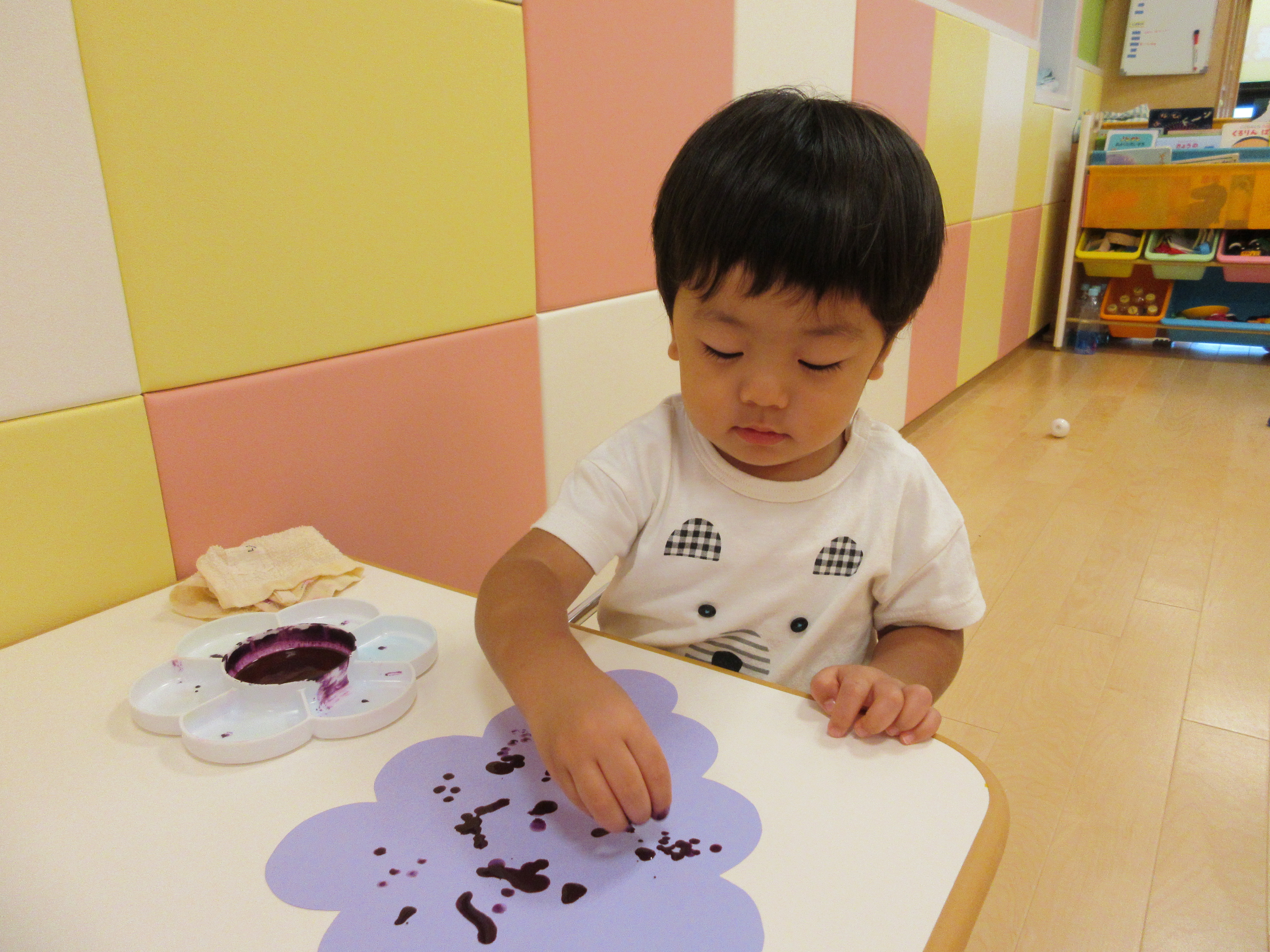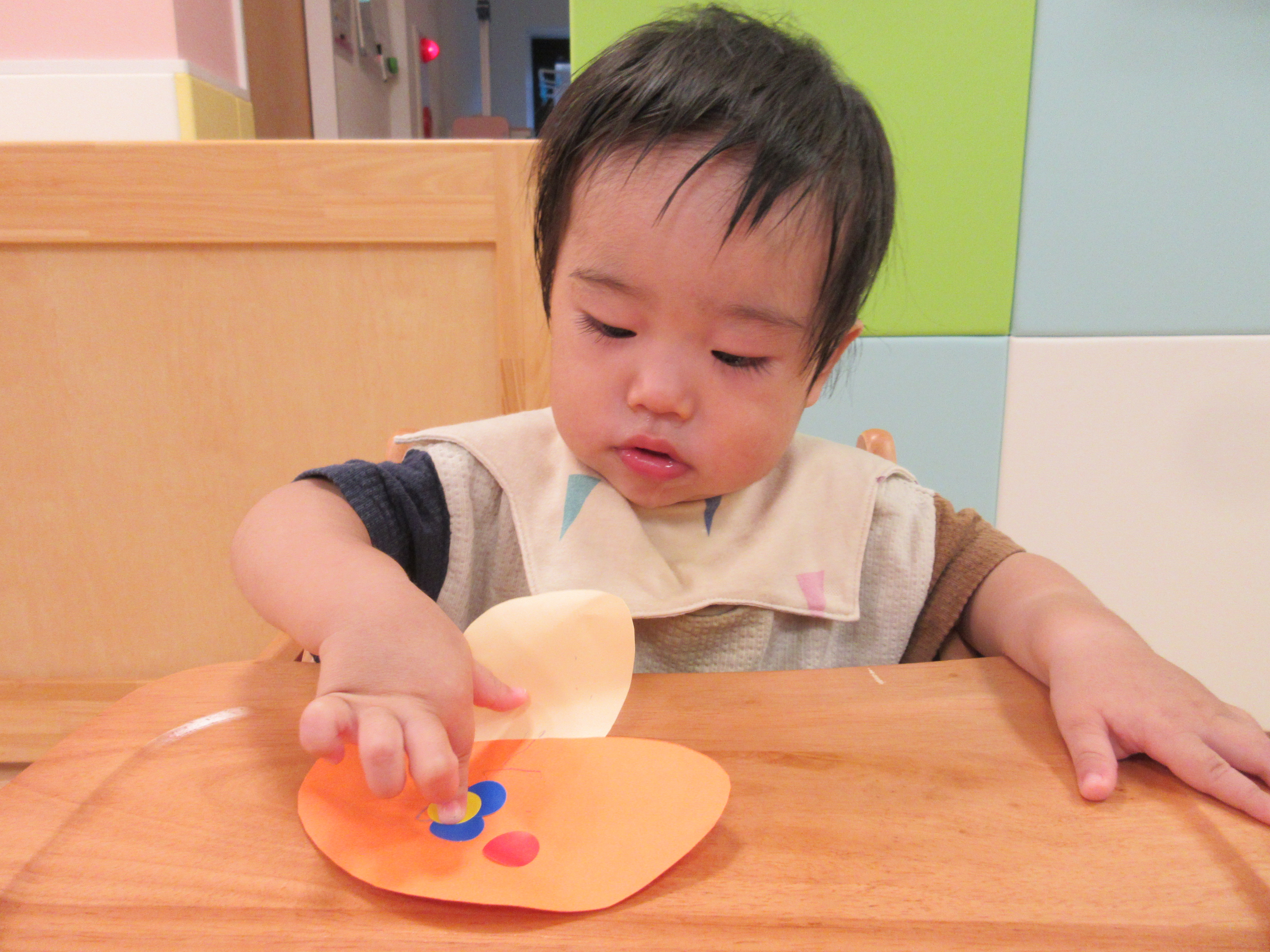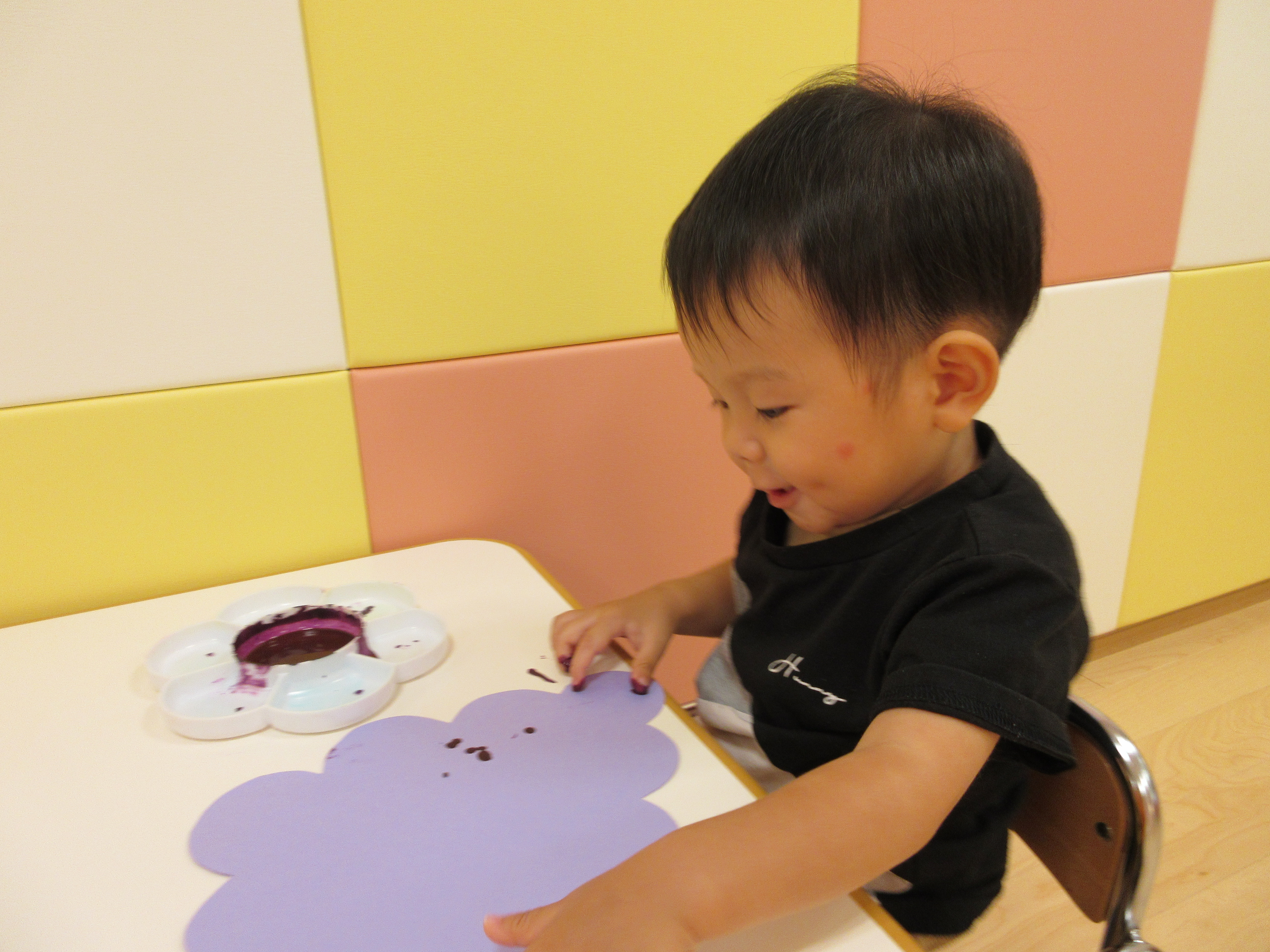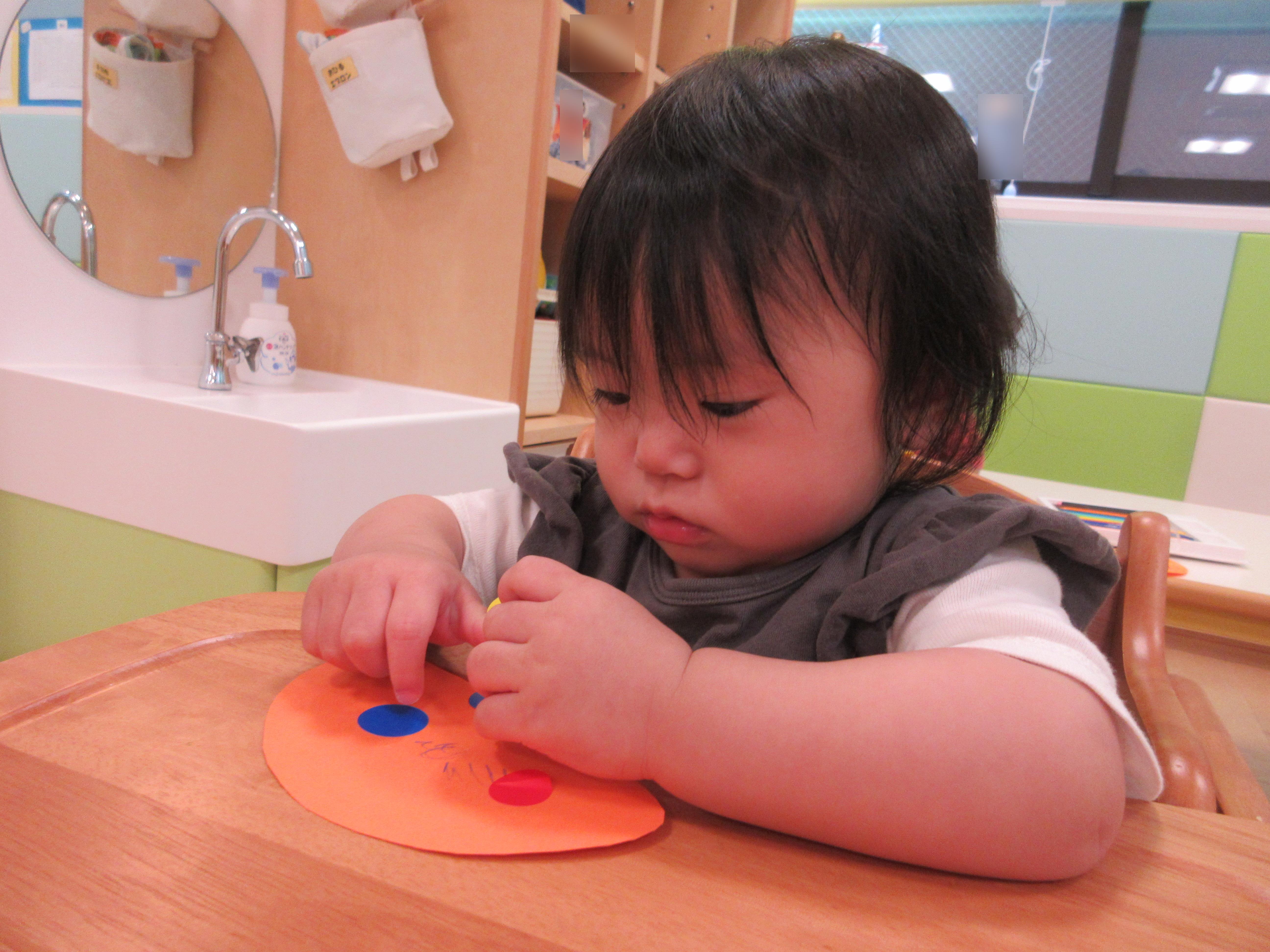 はじめは指に絵の具をつけることに抵抗がある子もいましたが、ひとつスタンプをはじめてみると楽しくて、繰り返し絵の具を指先につけてはペタっと押すことを楽しんでいました![]()