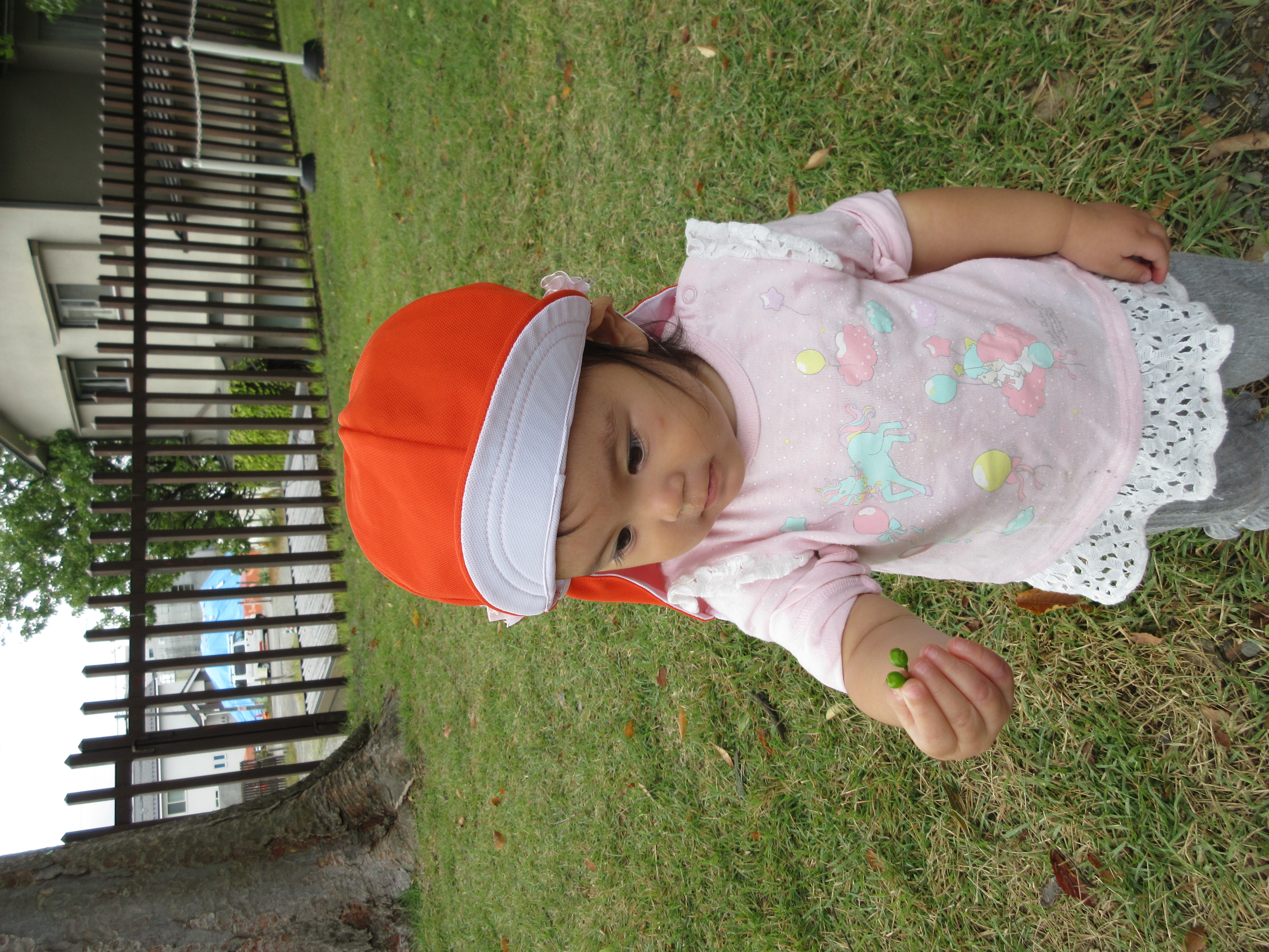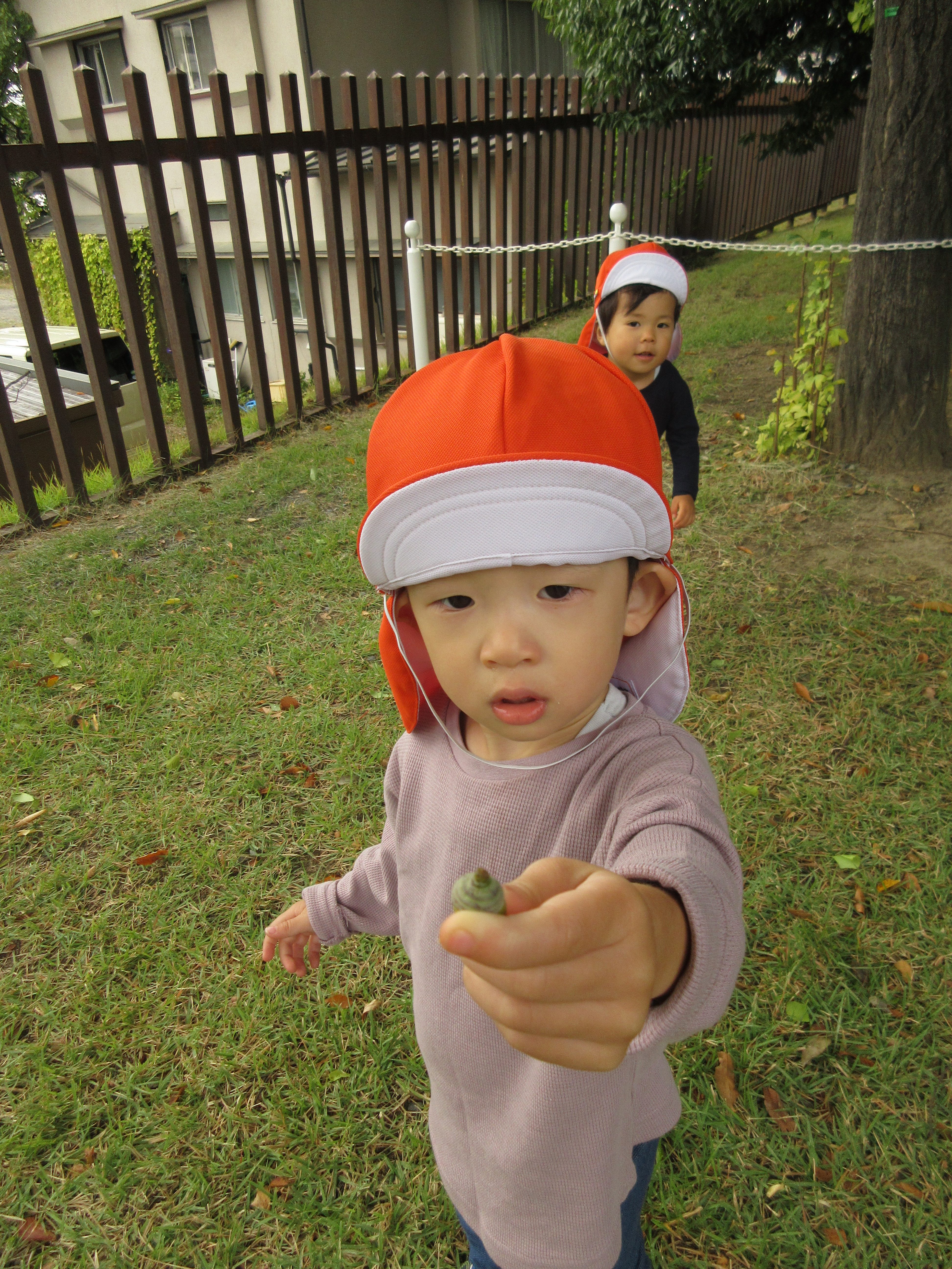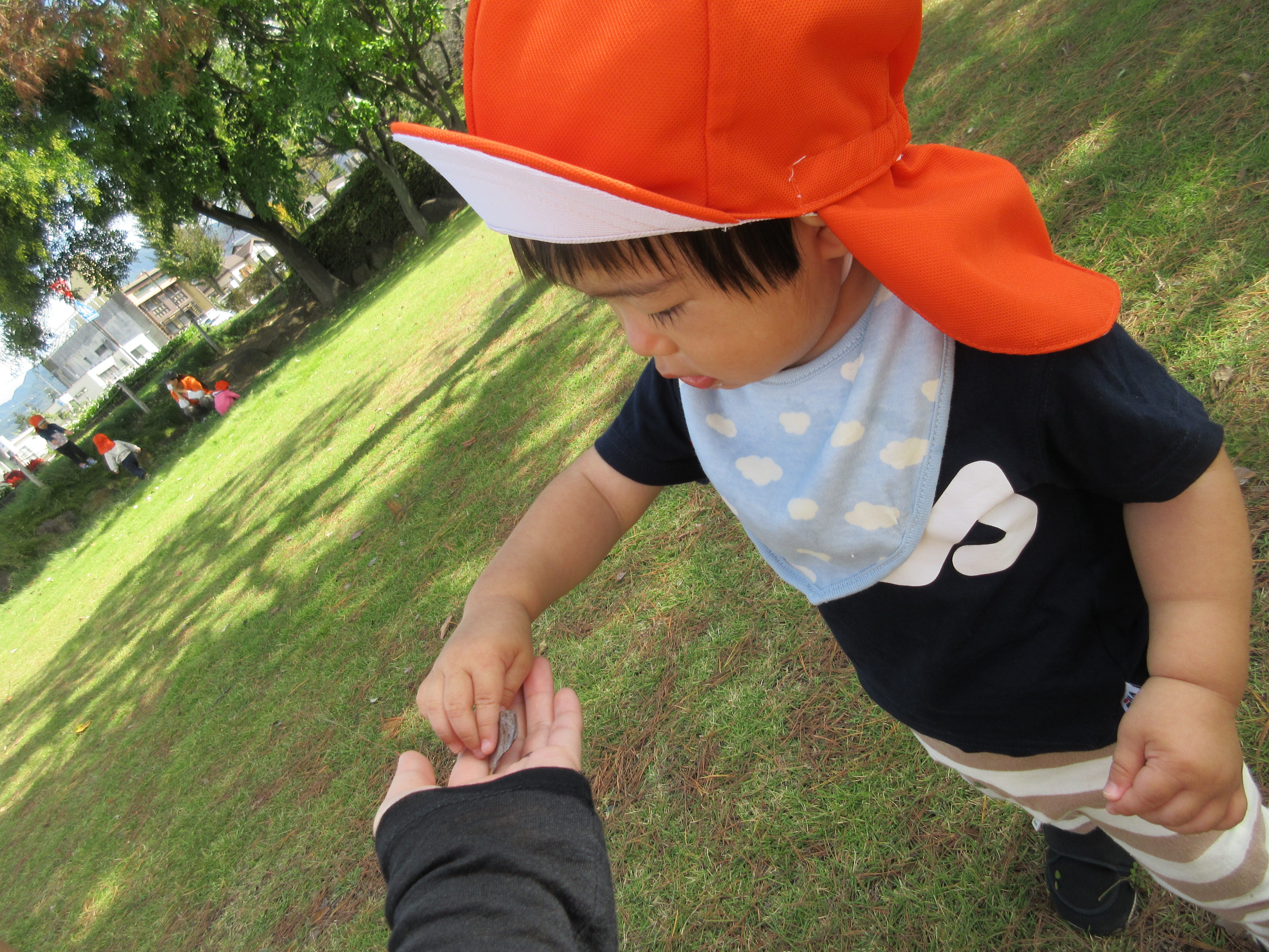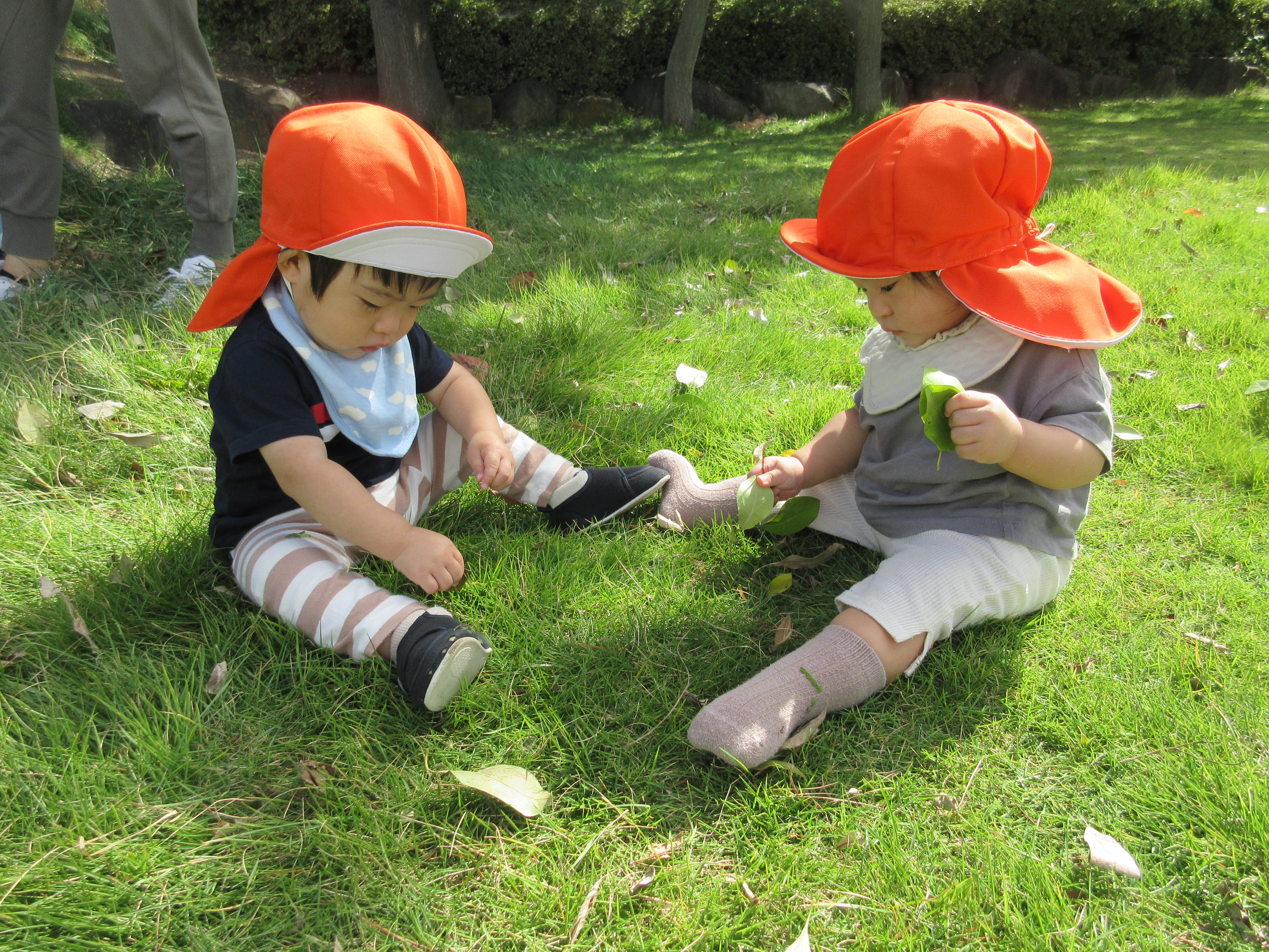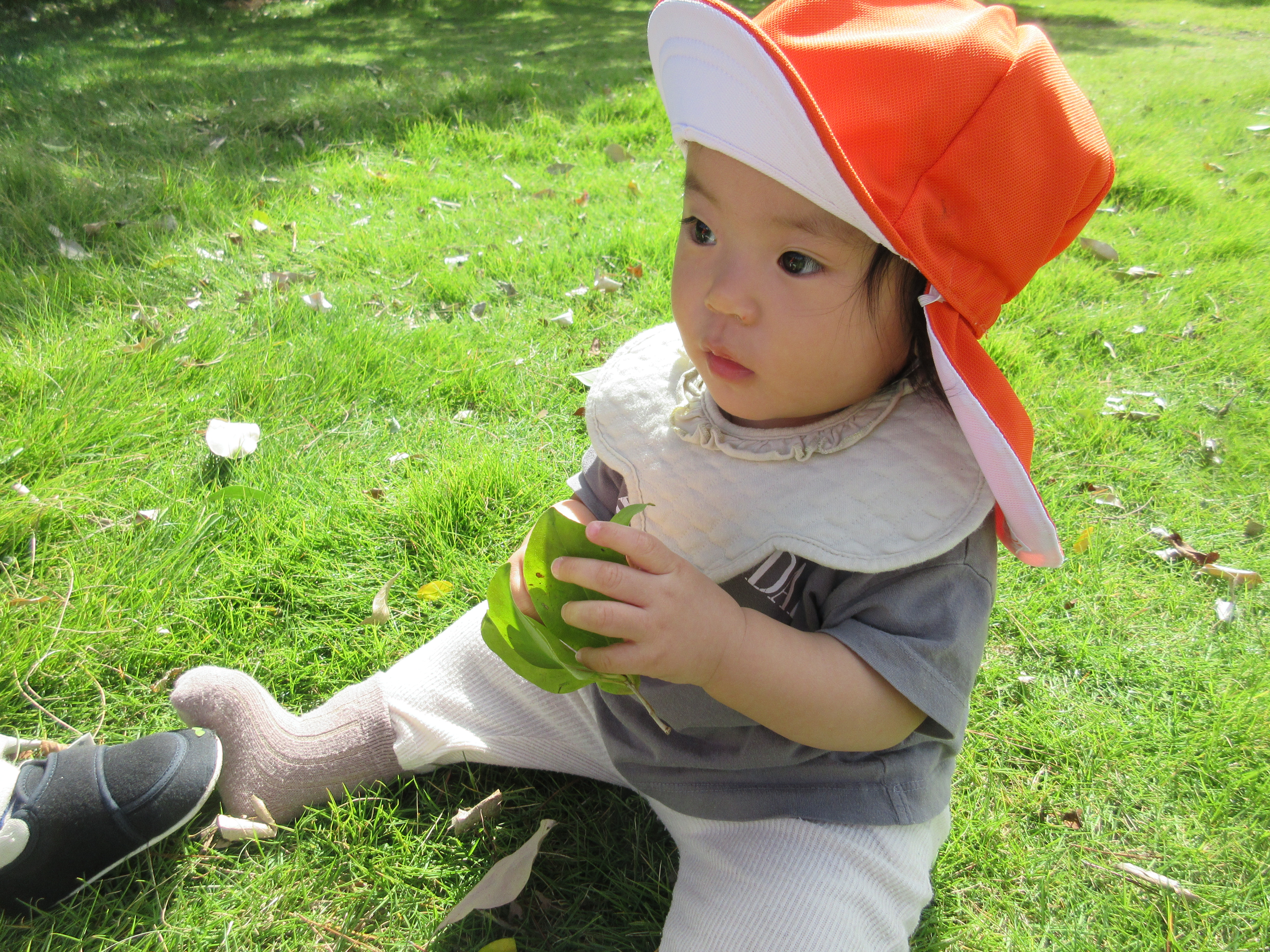 芝生の上に落ちている葉っぱが気になり、手にとってみたりビリビリと破いたりと葉っぱに興味津々![]()