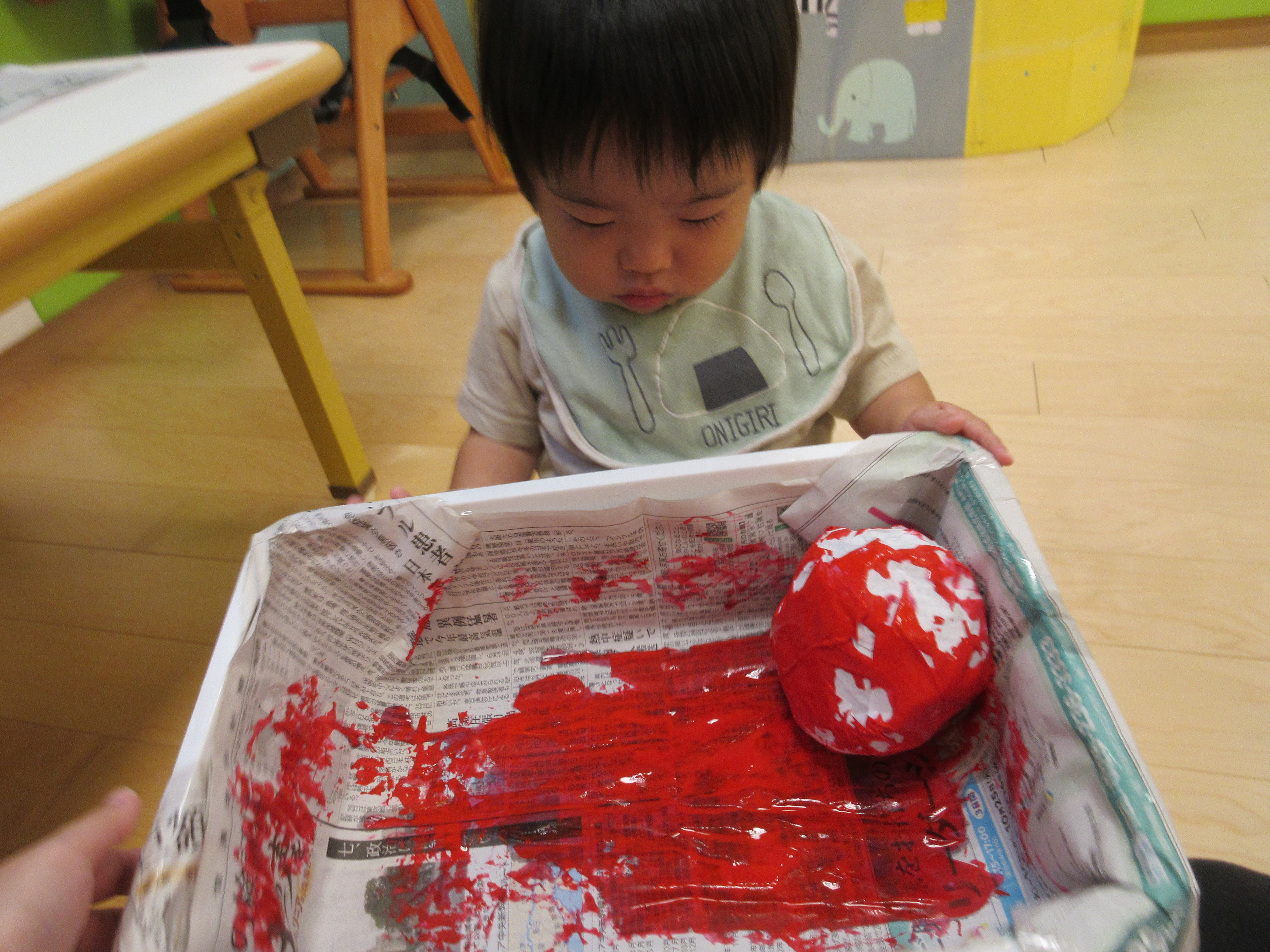 白いりんごを ころころ~ と転がして絵の具で色を付けました。