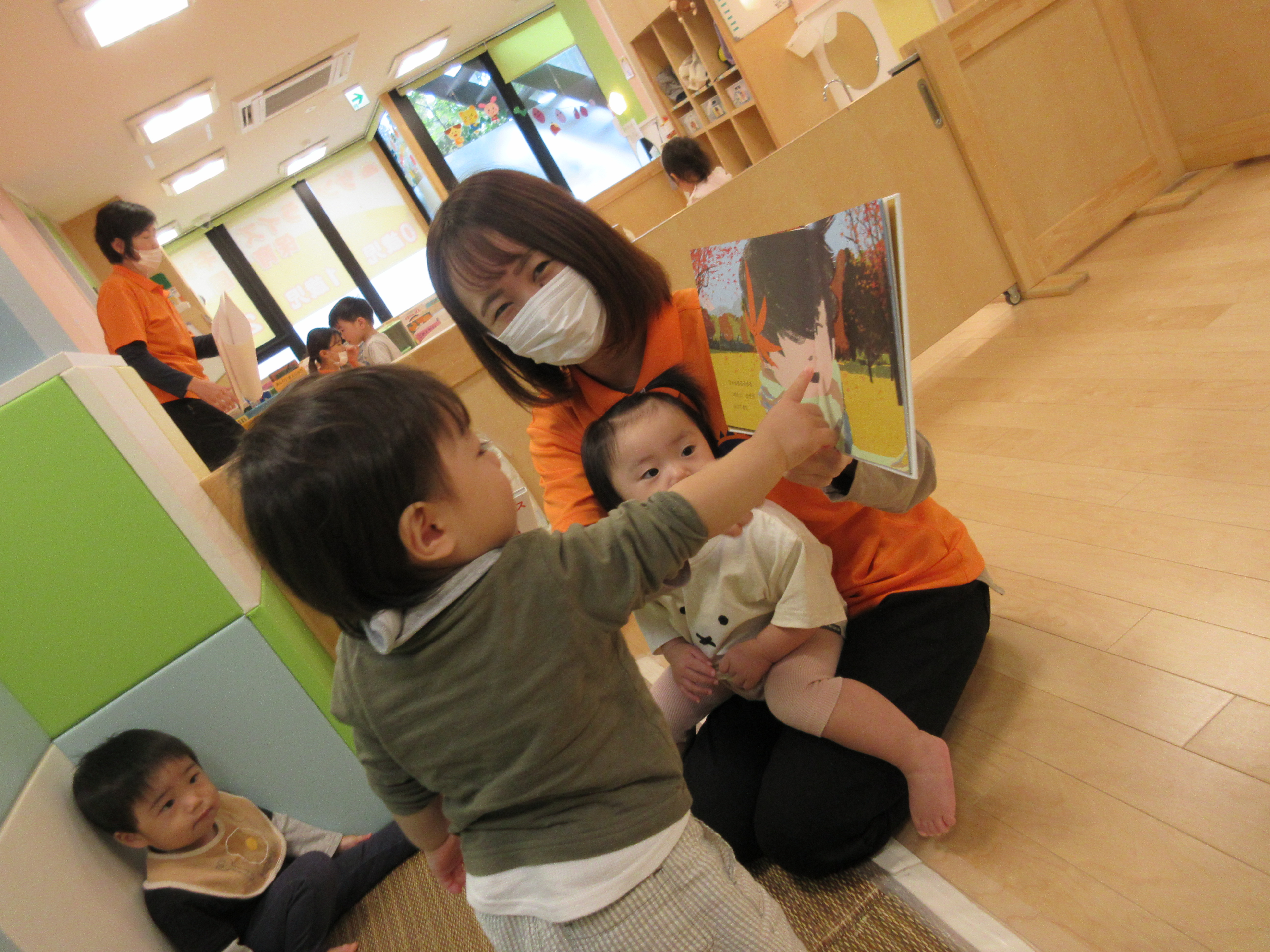 10月の歌で『どんぐりころころ』を歌っていることもあり、お話の中でどんぐりが登場すると子どもたちも嬉しそうに見つめていました![]()