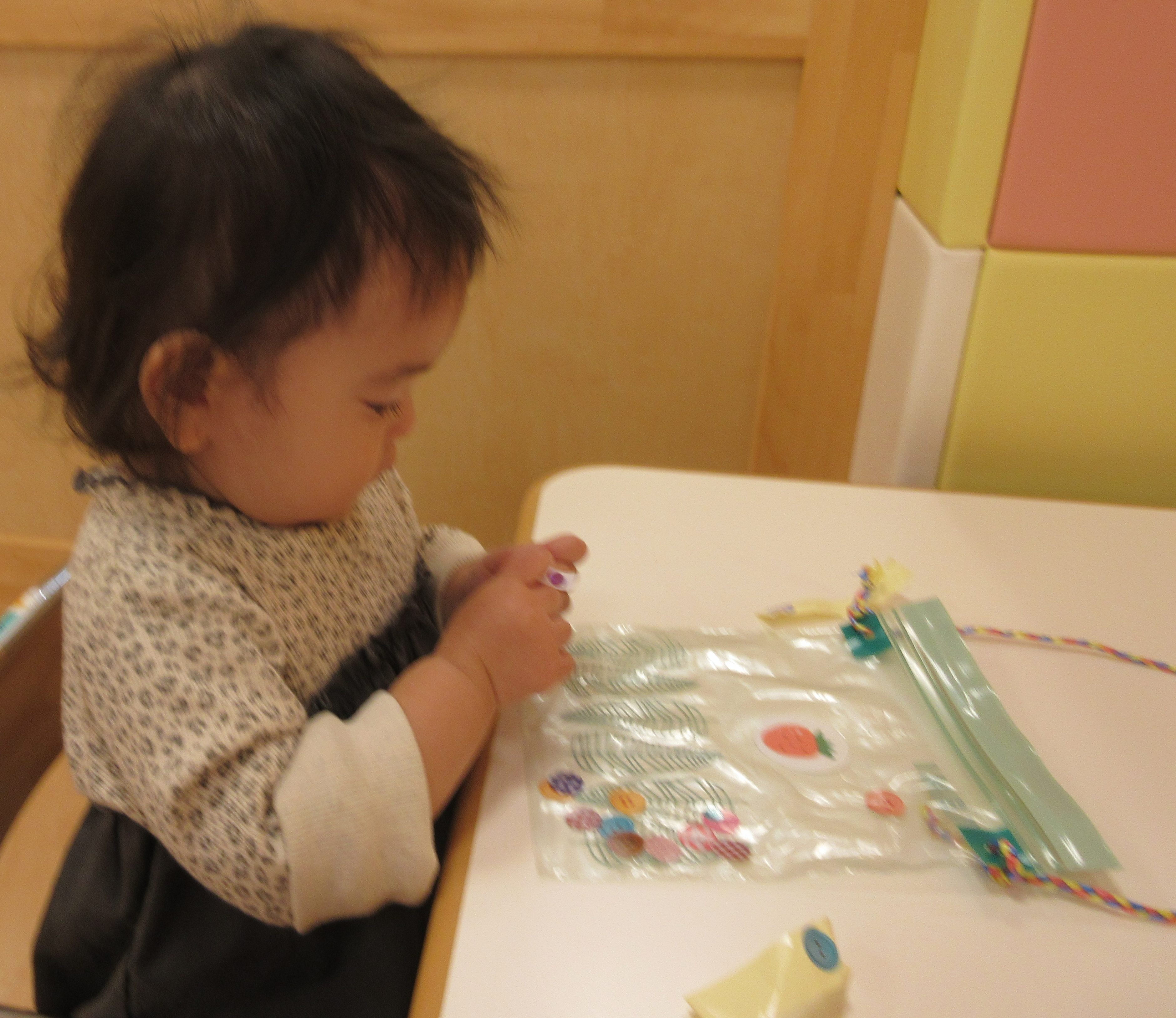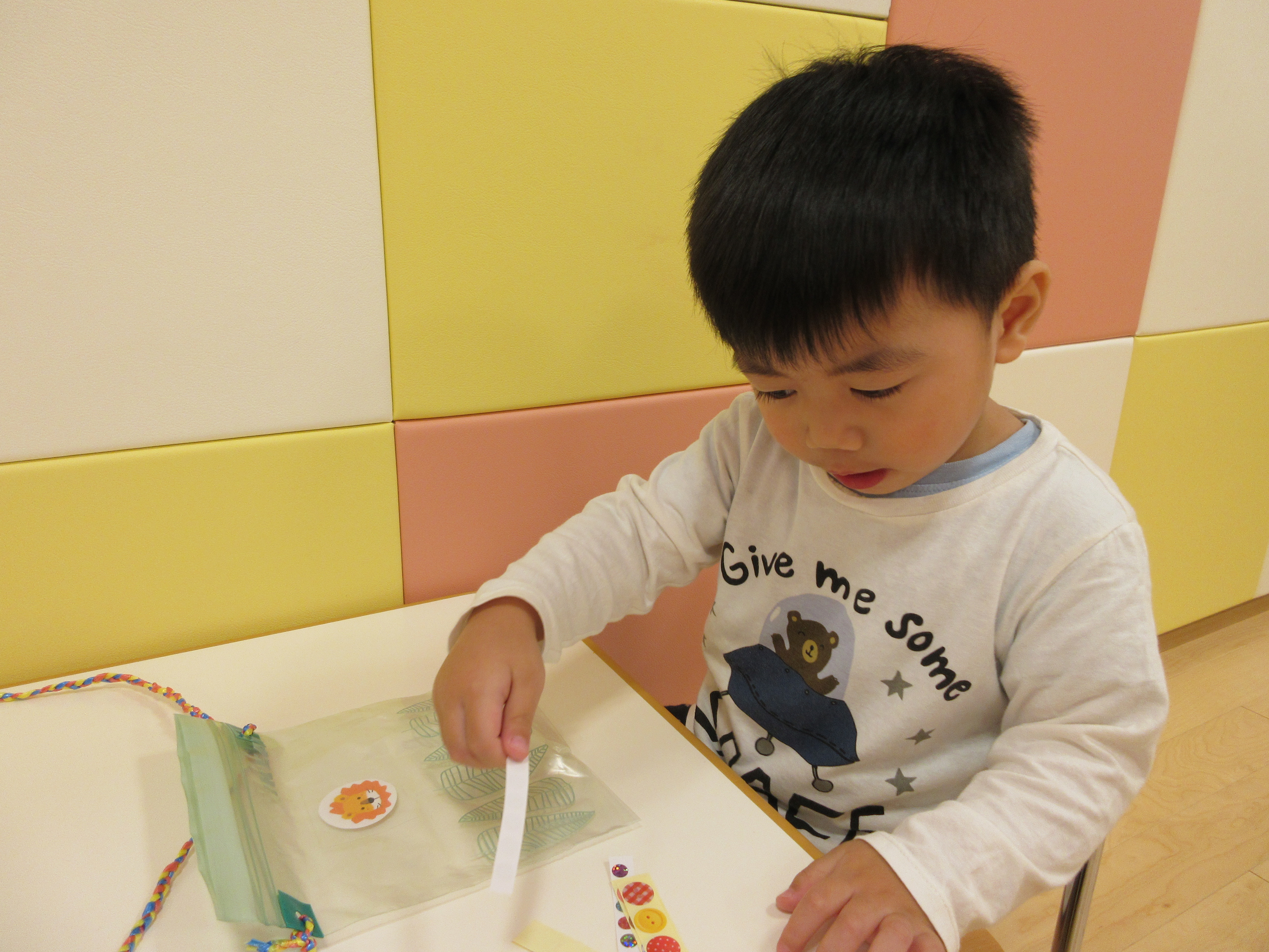 小さなシールは少し難しいですが、キラキラしたシールなので嬉しそうに「キラキラ」と言ったり、指先にくっついてしまいながらも一生懸命指をかえして貼っていました。