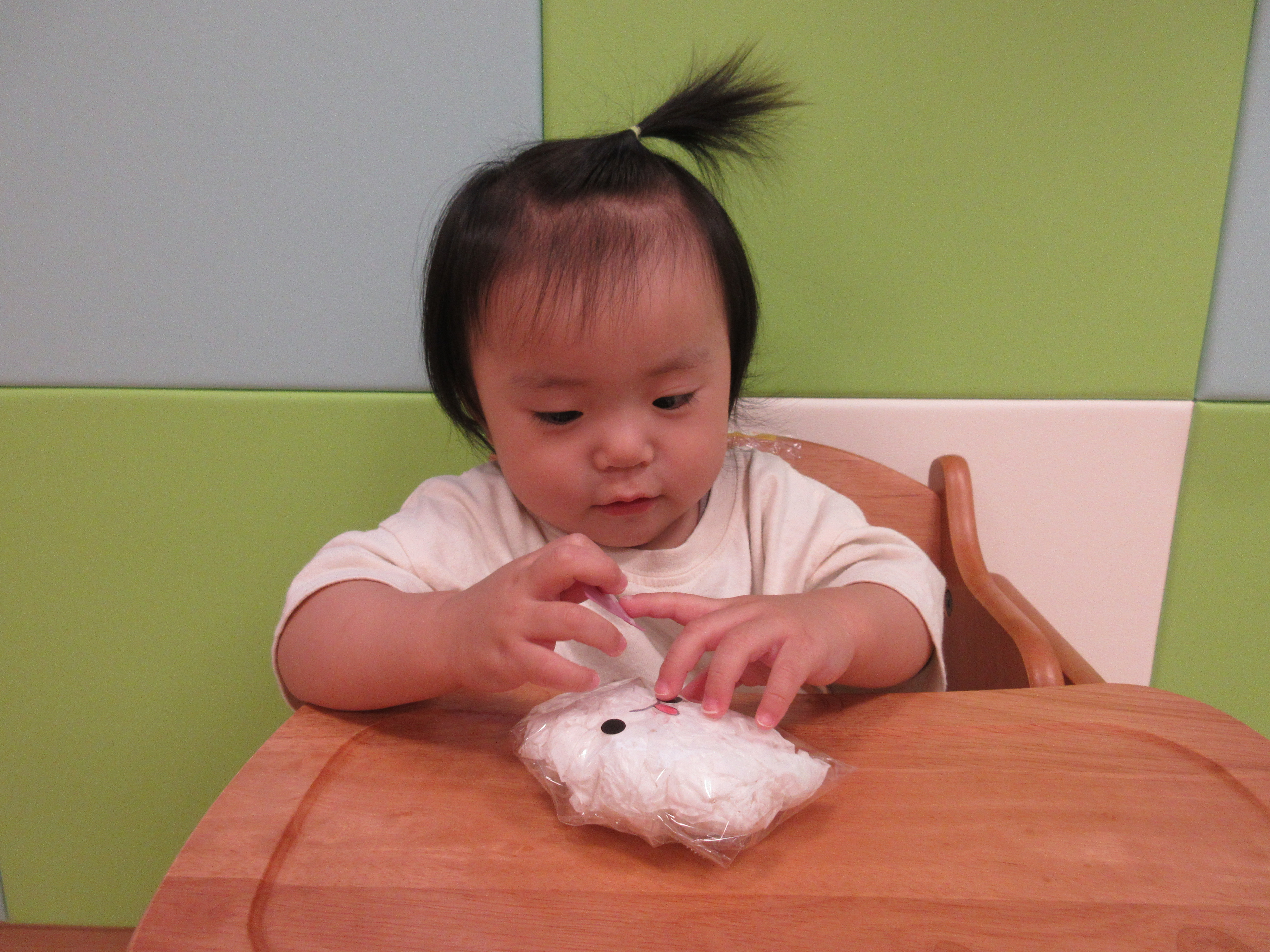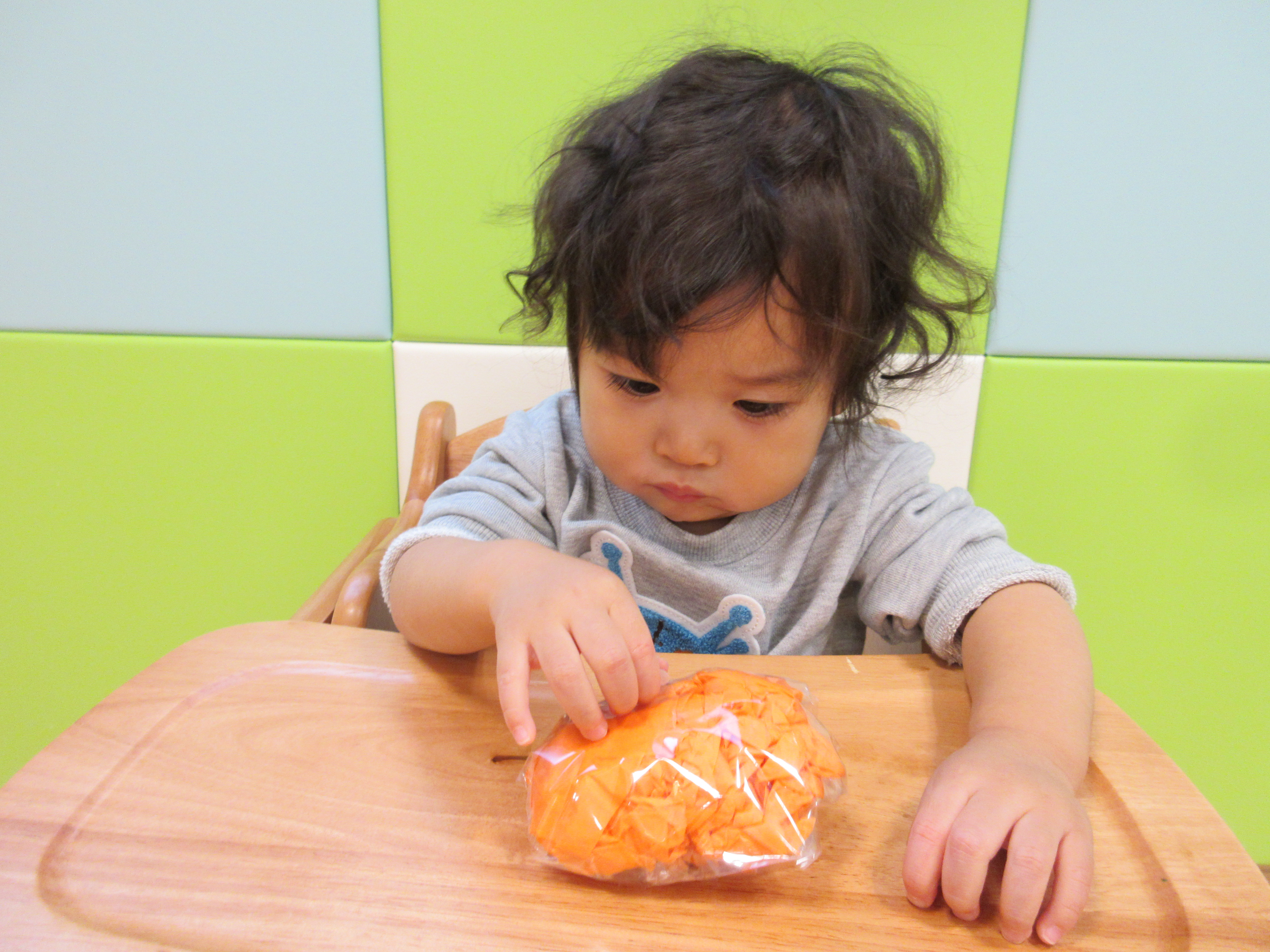 オレンジと白のお花紙を破いて袋に入れ、先生が形を作り、最後に目・鼻・口・帽子などしをシールで貼りました。